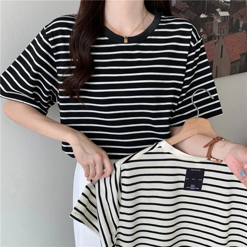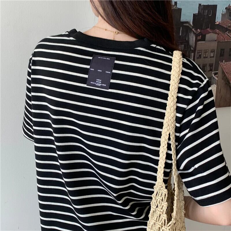 送料無料 Jielur 先染めスペルカラーストライプ Tシャツバックパッチ白黒トップス半袖レディース Tシャツルーズベーシック Tシャツ ショート ホワイト ブラック ハーフスリーブ AE12188787874468898620