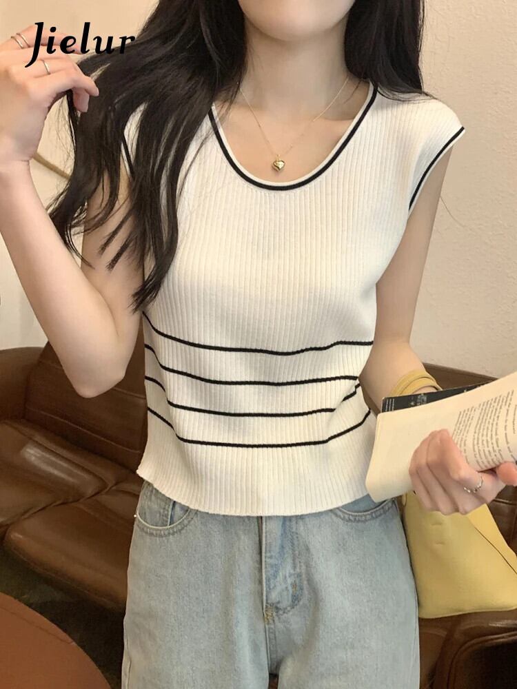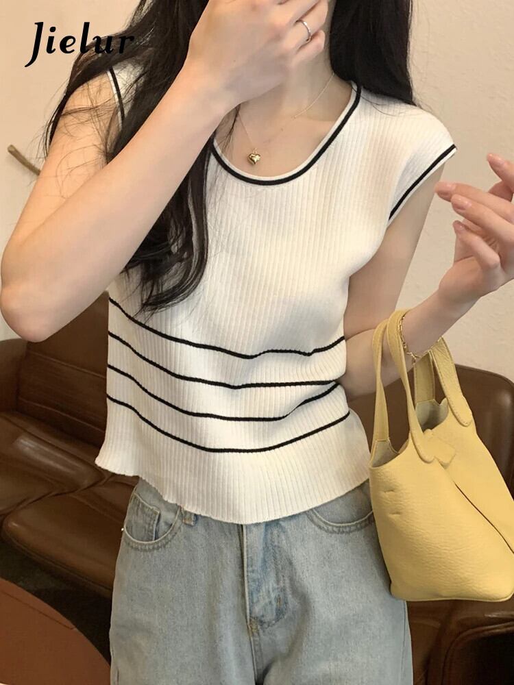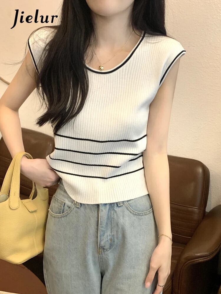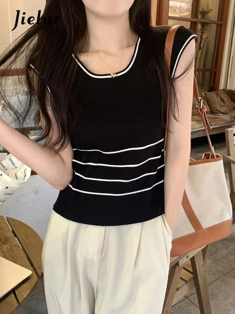 送料無料 Jielur 夏スリムコントラストカラーの女性の Tシャツシンプルなベーシックニット Tシャツ女性黒、白のストライプトップ ホワイト ブラック サマー 夏物 AE12188787879041495065