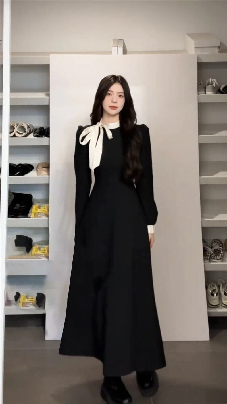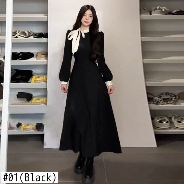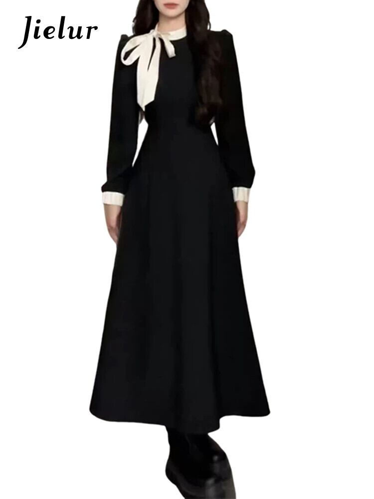 送料無料 Jielur 秋のコントラストカラーシックな女性ドレス甘いドレス女性黒シフォン長袖ドレス ロング ブラック 大人ガーリー スウィート キュート カジュアル オータム 秋物 AE12188787844364899662