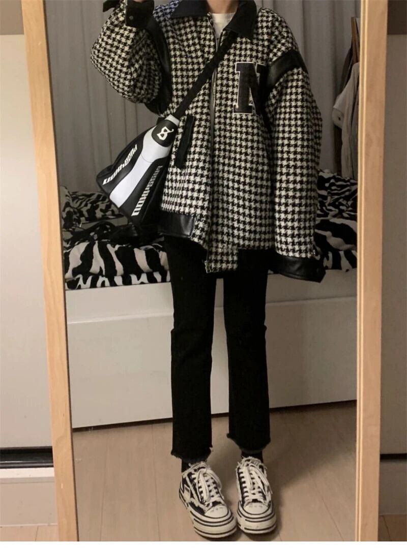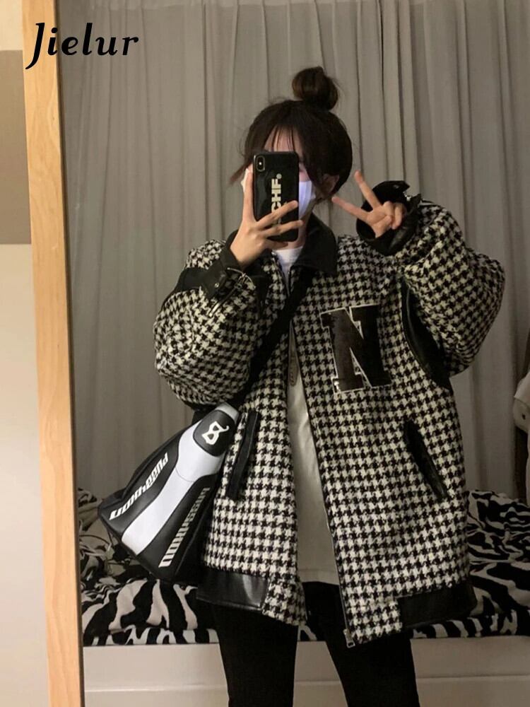 送料無料 Jielur Clic レタープリントチェック柄ルーズパーカーシックなジッパーポケットベーシックシンプルな女性パーカー AE12188787855961911780