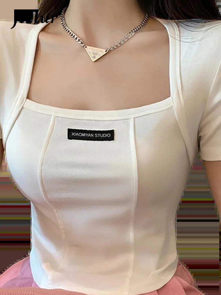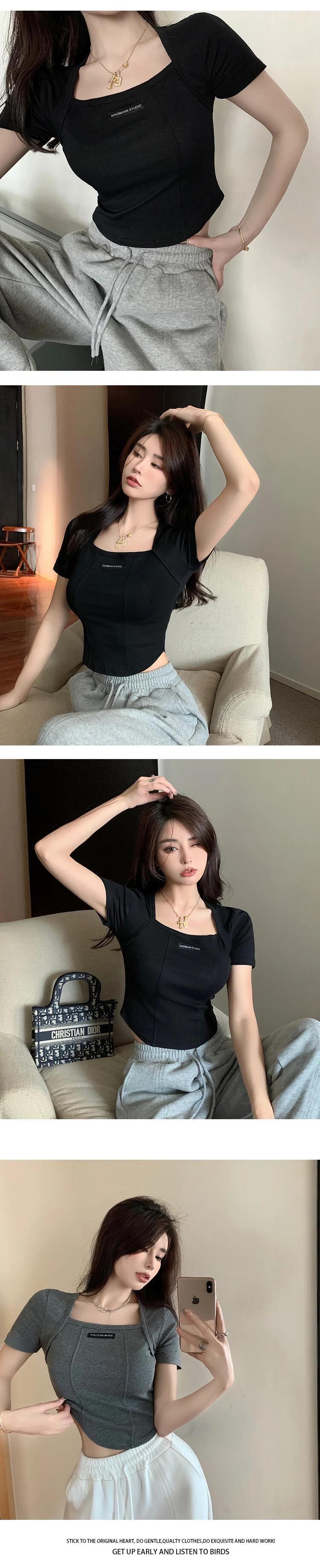 送料無料 Jielur 夏アメリカ無地セクシーな女性の Tシャツシンプルなベーシックスリム Tシャツ女性白グレー黒トップ ホワイト ブラック サマー 夏物 ソリッドカラー AE12188787810496986158