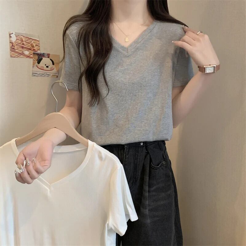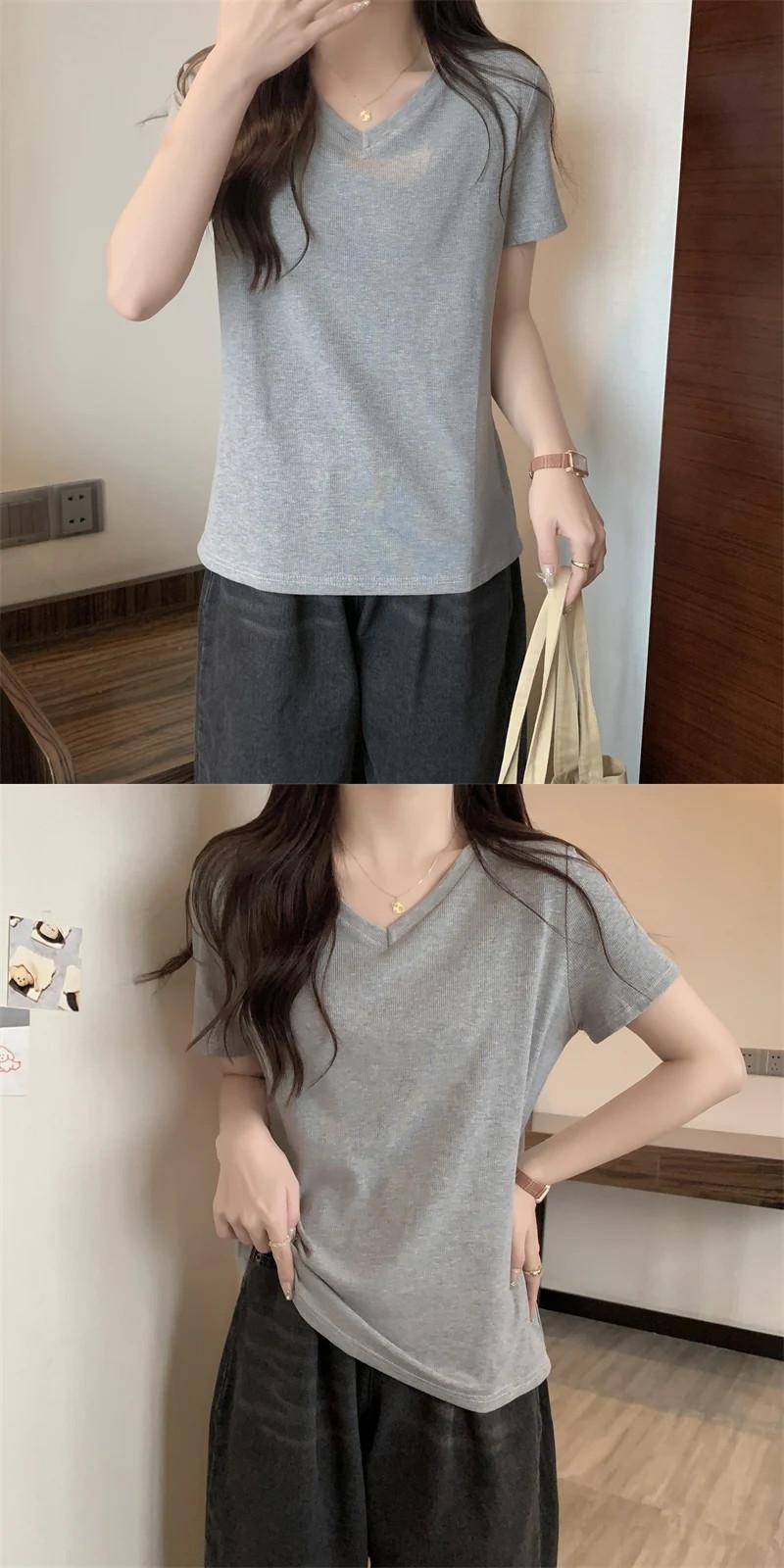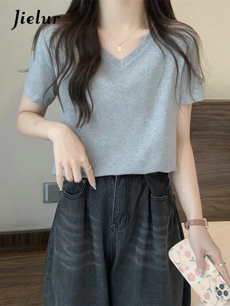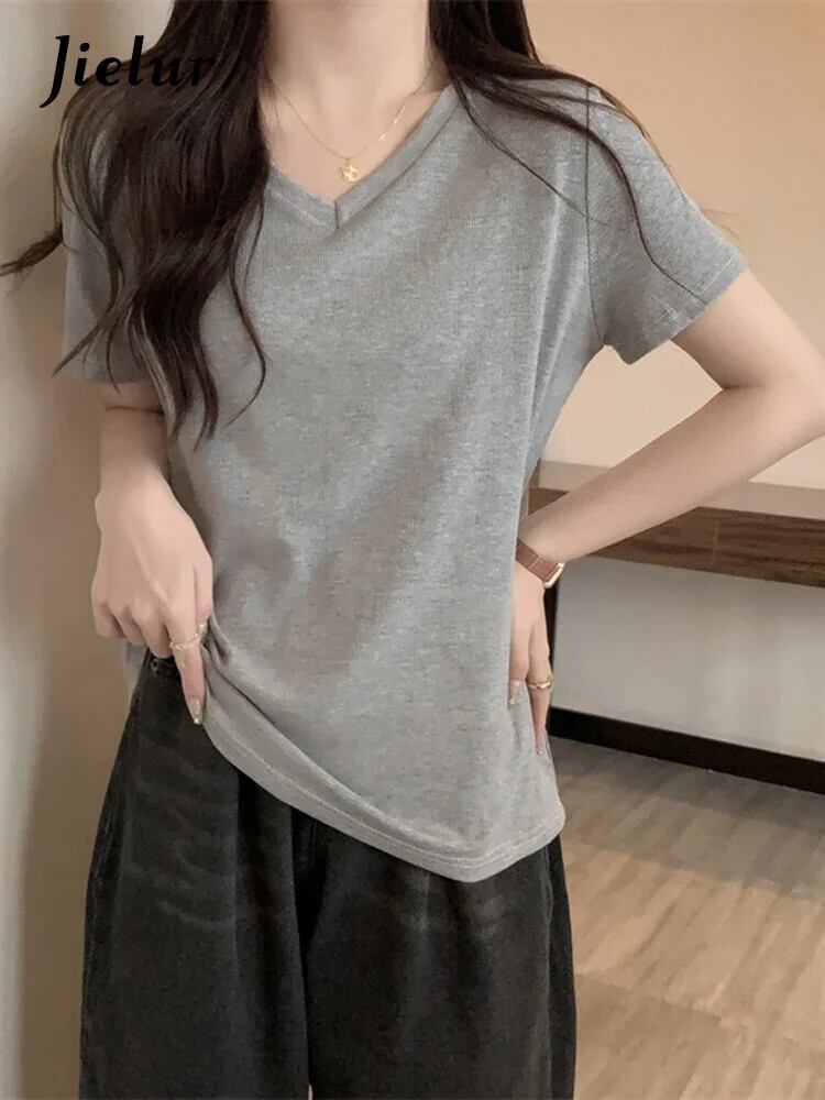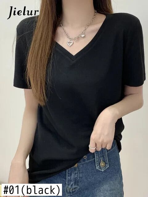 送料無料 Jielur V ネック半袖コットン Tシャツ女性ソリッドカラープレッピースタイル Tシャツレジャールーズトップ Tシャツ ショート ハーフスリーブ Vネック AE12188787812862362367