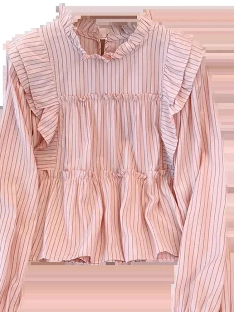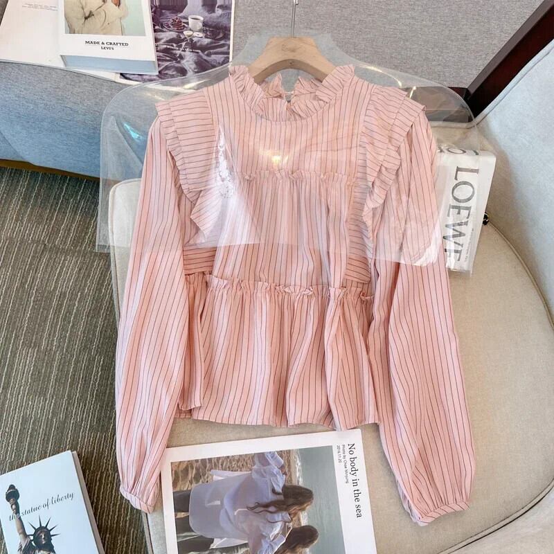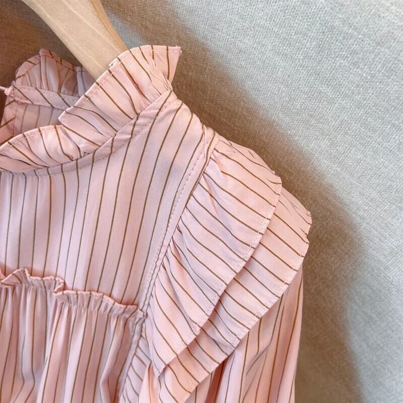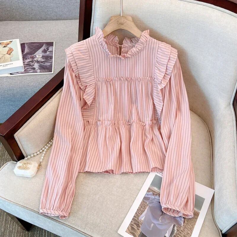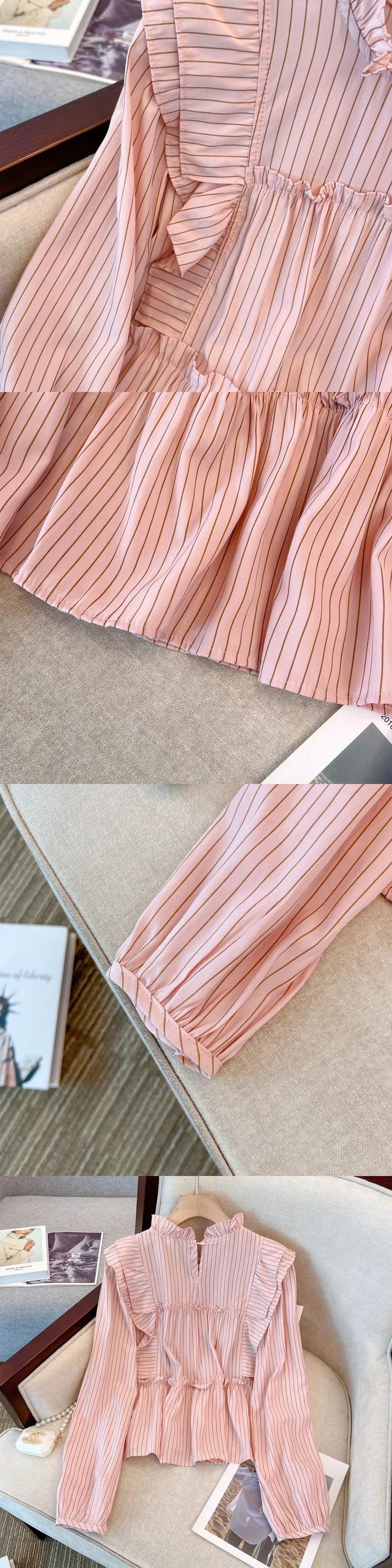 送料無料 フレンチヴィンテージ縦縞ルーズ女性ブラウス甘いブラウスピンク白シックなフリル襟トップ ホワイト ラッフル 大人ガーリー スウィート キュート カジュアル ストライプ ビンテージ AE12188787814798749667