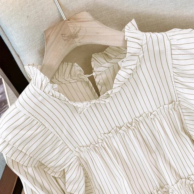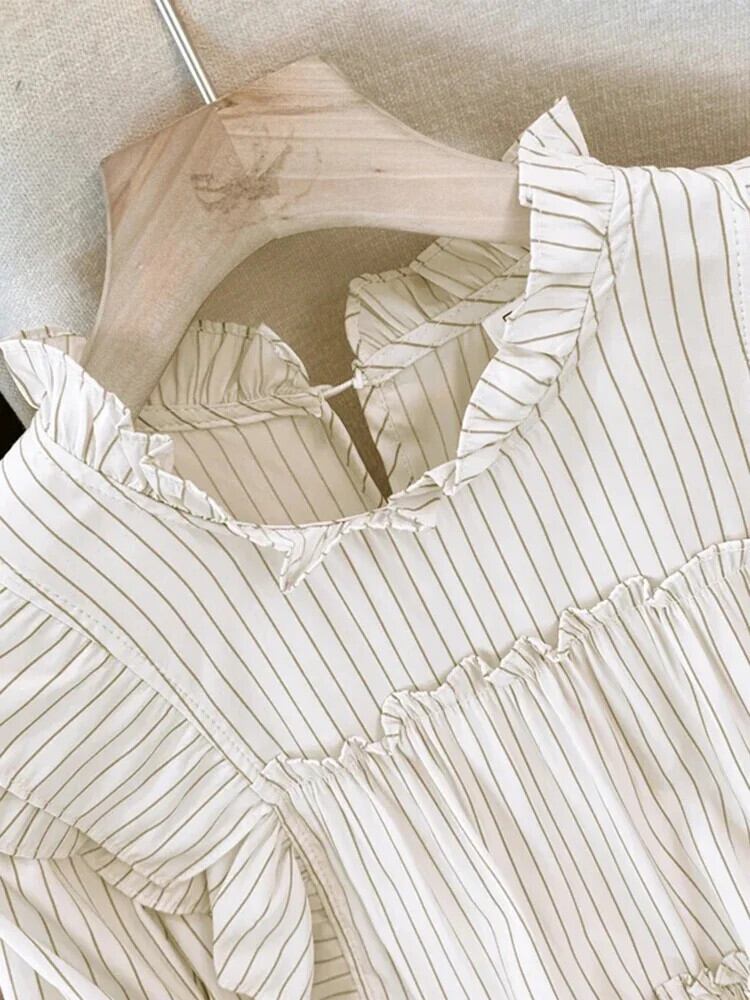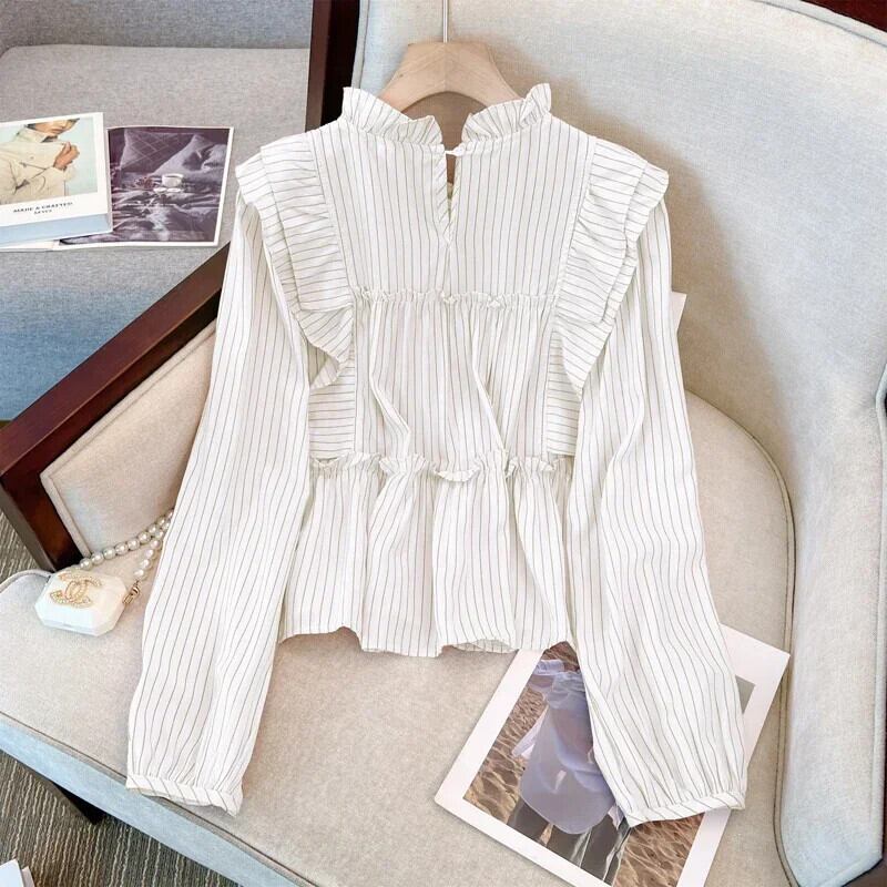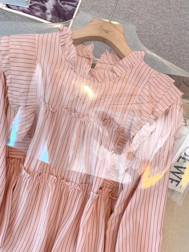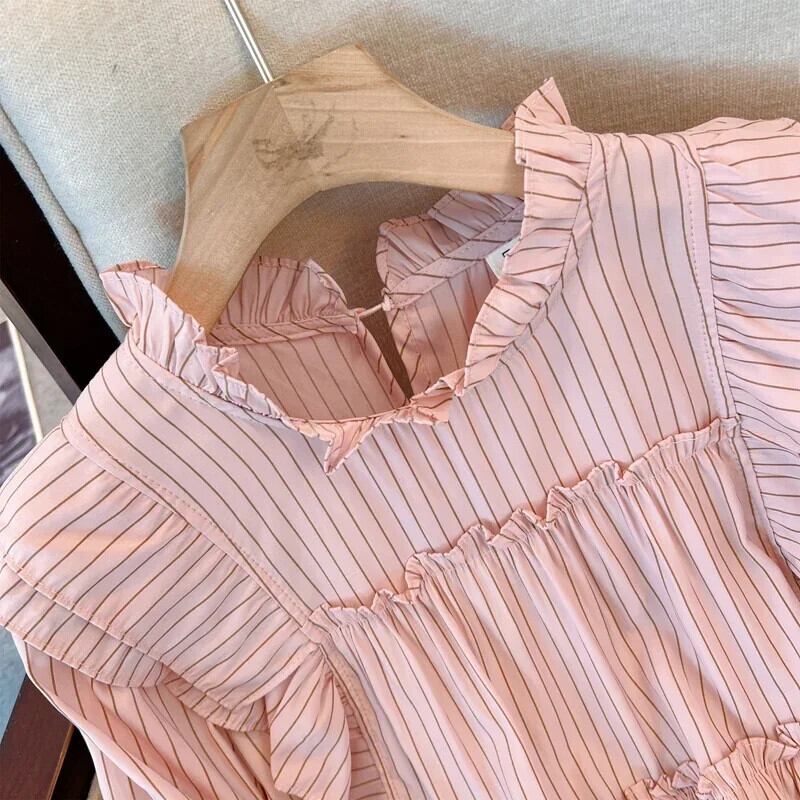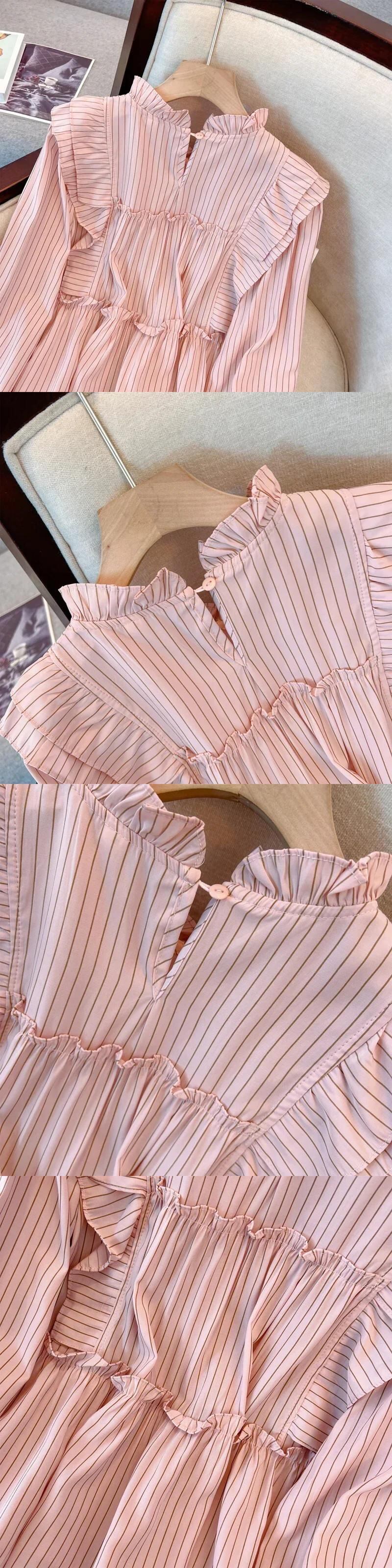 送料無料 フレンチヴィンテージ縦縞ルーズ女性ブラウス甘いブラウスピンク白シックなフリル襟トップ ホワイト ラッフル 大人ガーリー スウィート キュート カジュアル ストライプ ビンテージ AE12188787814798749667