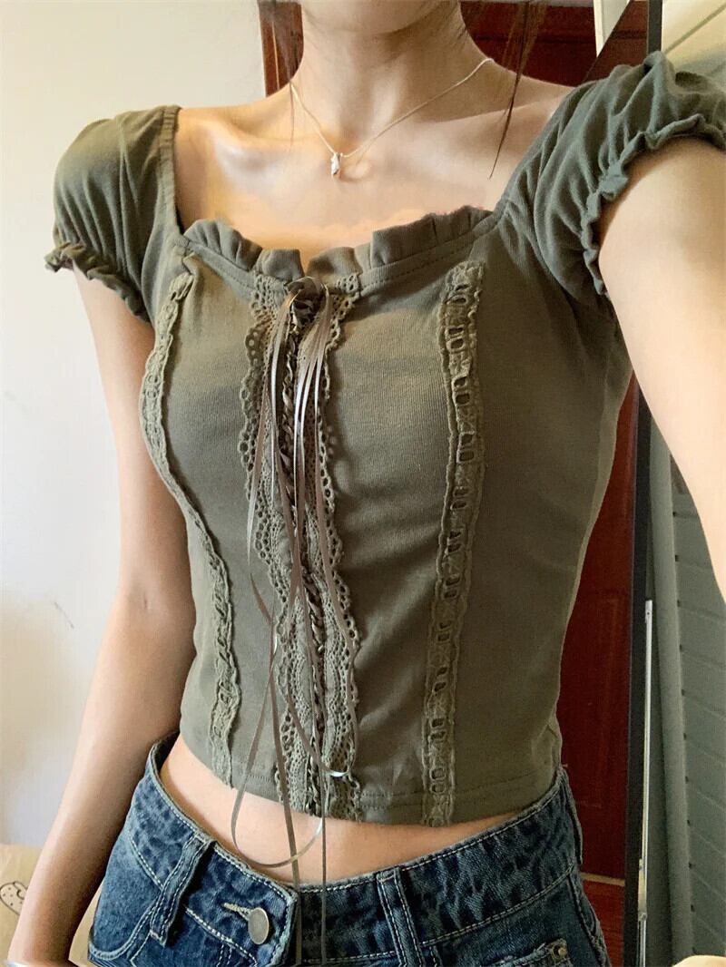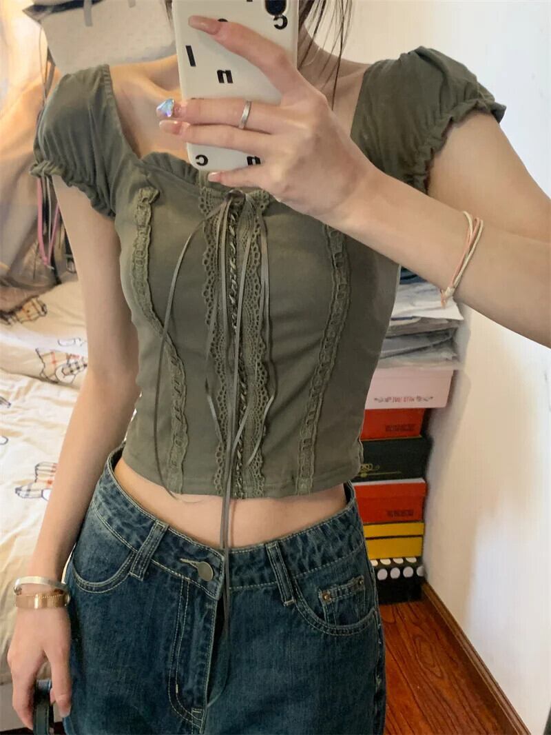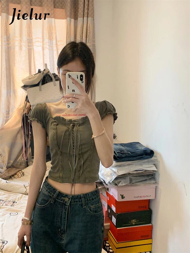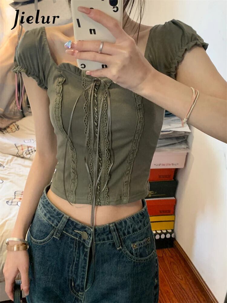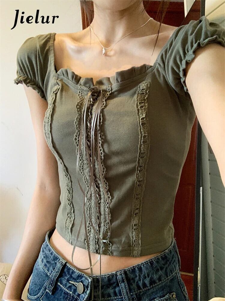 送料無料 Jielur 夏無地スリム女性の Tシャツヴィンテージ甘いレース Tシャツ女性シンプルなスクエアネックトップ 大人ガーリー スウィート キュート カジュアル サマー 夏物 ソリッドカラー スクウェア ビンテージ AE1218878788987996661
