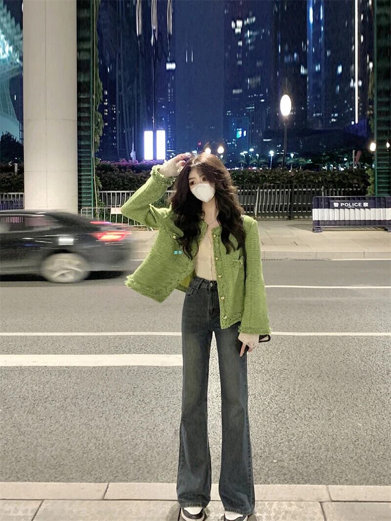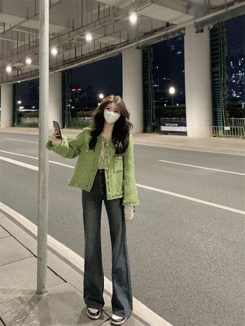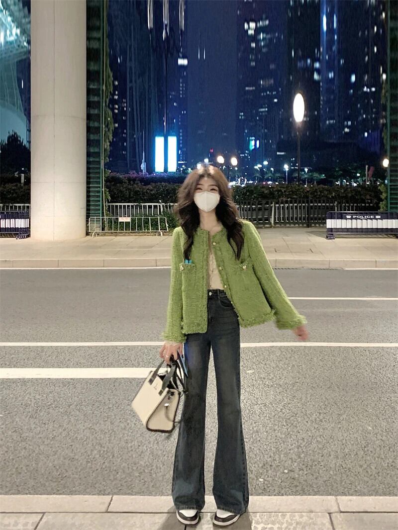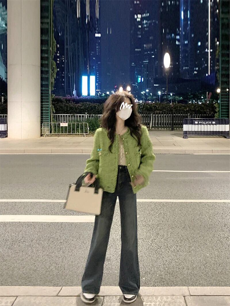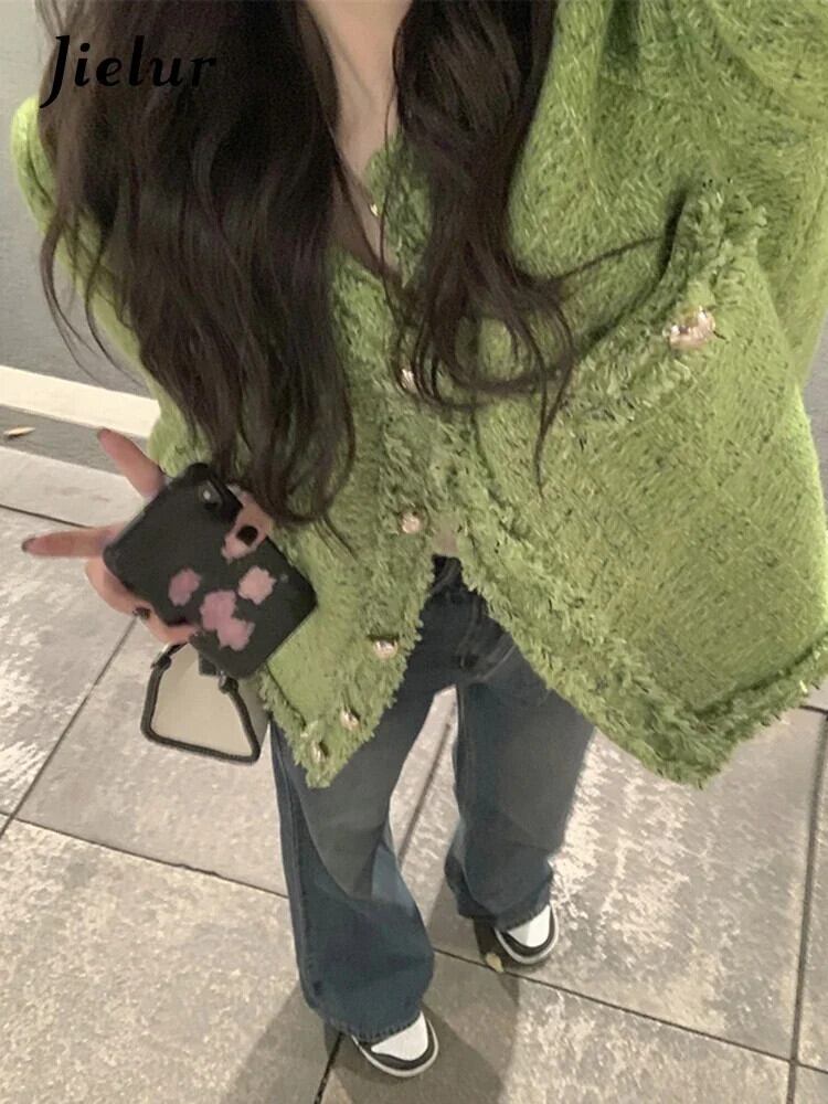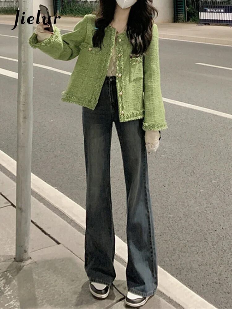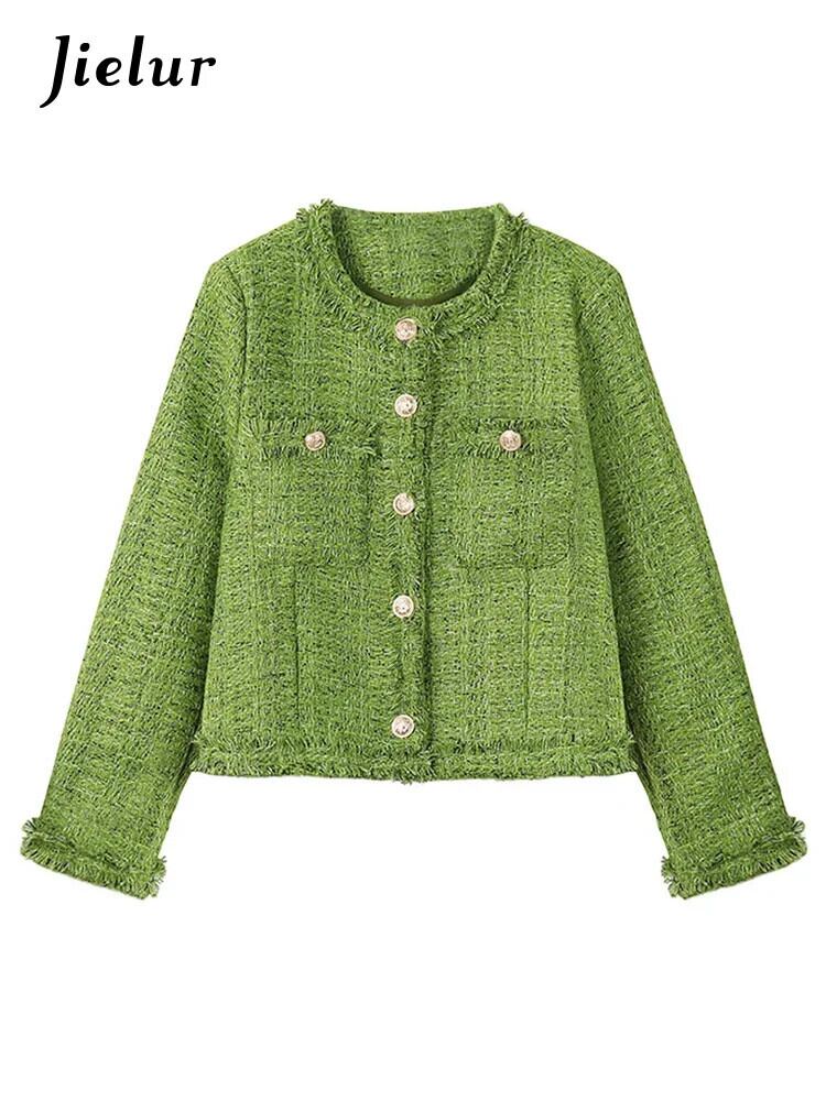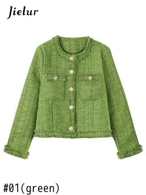 送料無料 Jielur Lady Burrs グリーンジャケット O ネックツイードコート秋冬長袖女性ジャケット ロング オータム 秋物 ウィンター 冬物 Oネック AE12188787898085464016