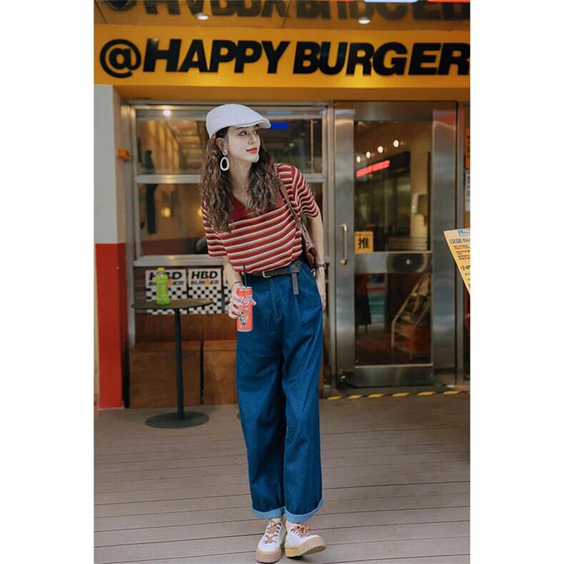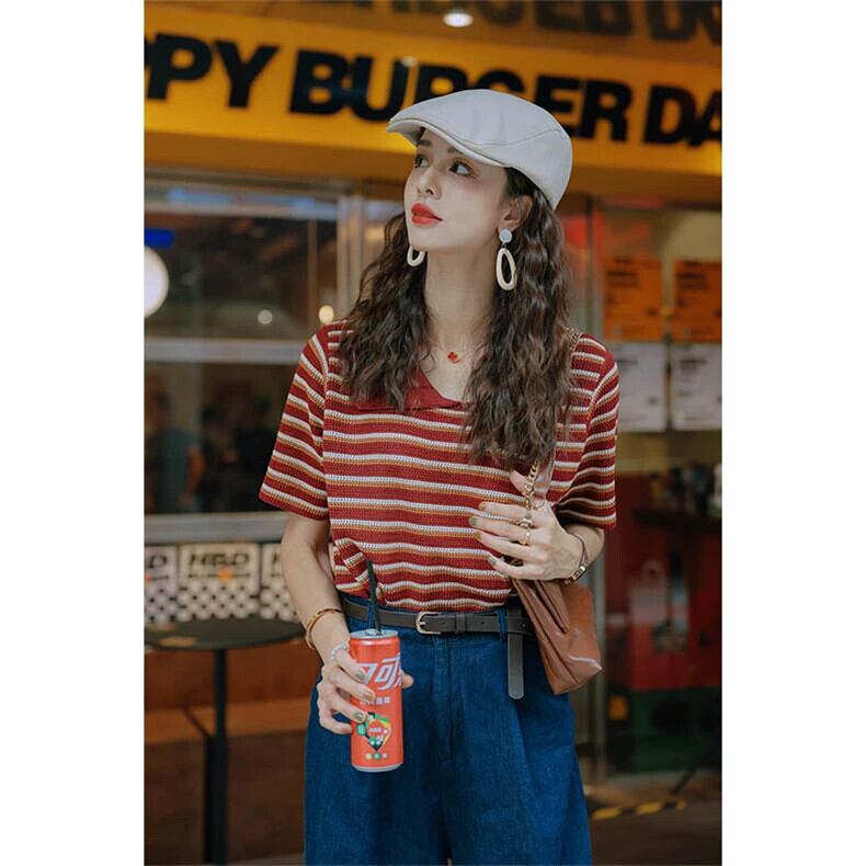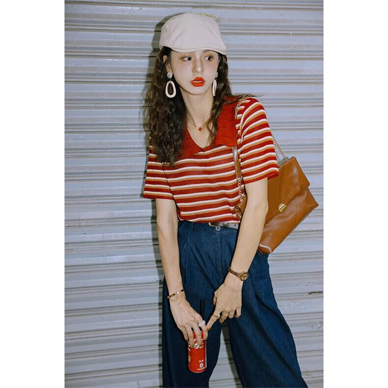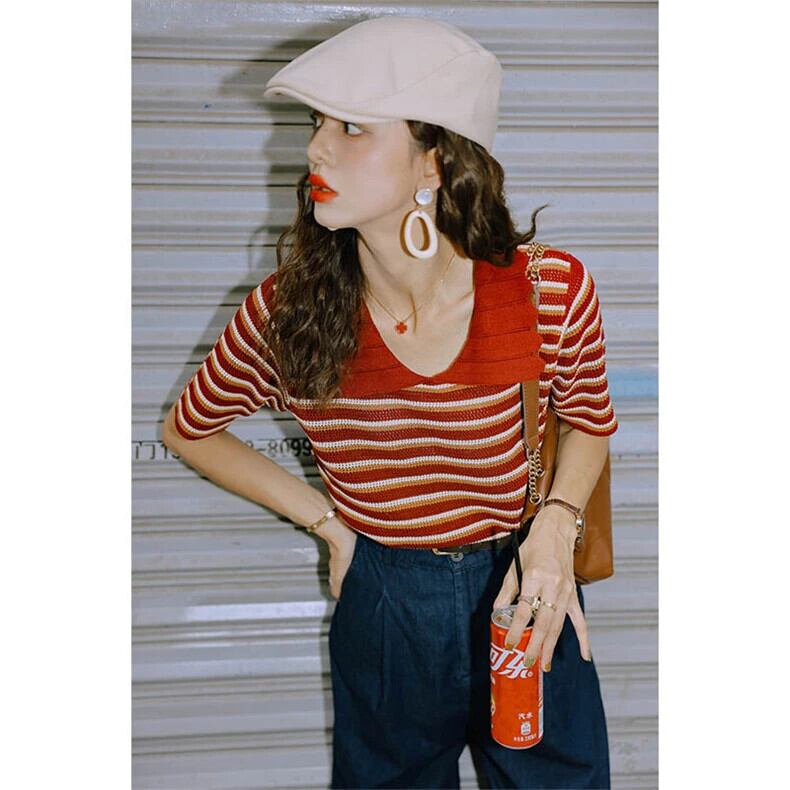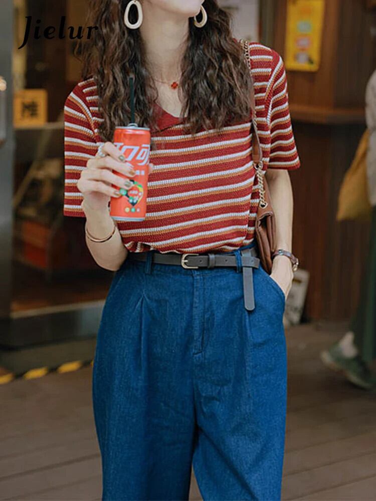 送料無料 Jielur 夏スリムストライプ女性の Tシャツルーズ Chicly Tシャツ女性コントラストカラーベーシックニットトップ サマー 夏物 AE12188787829265924197