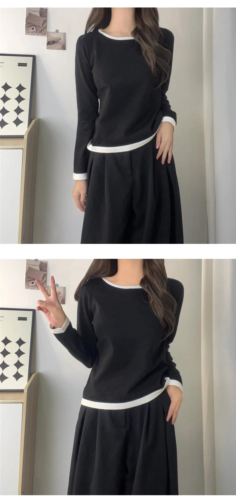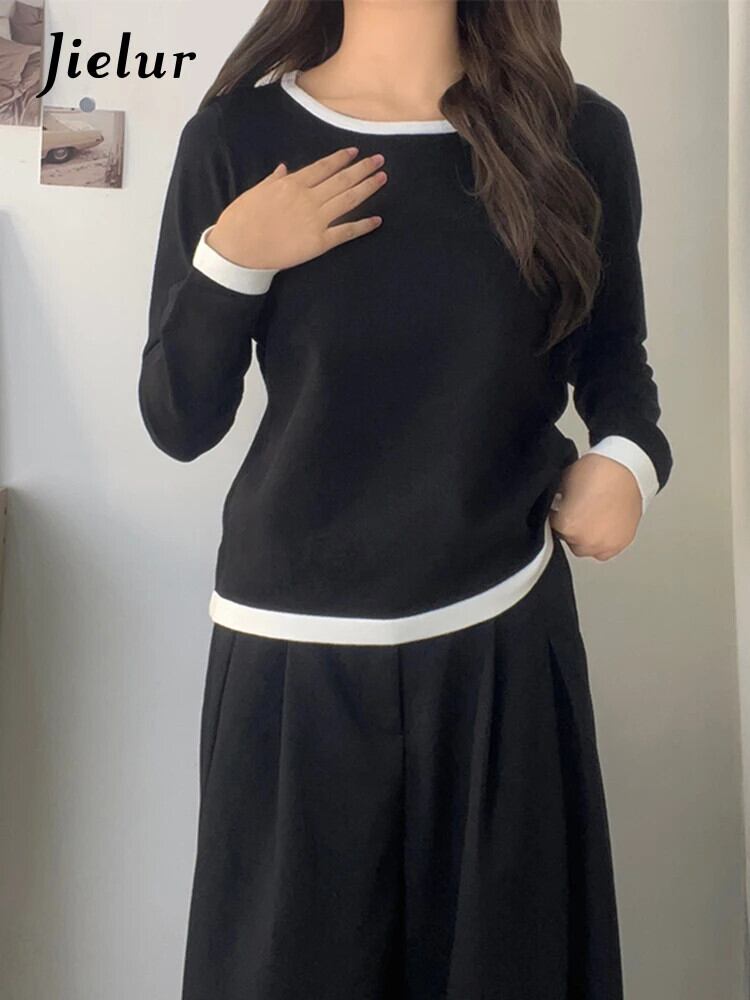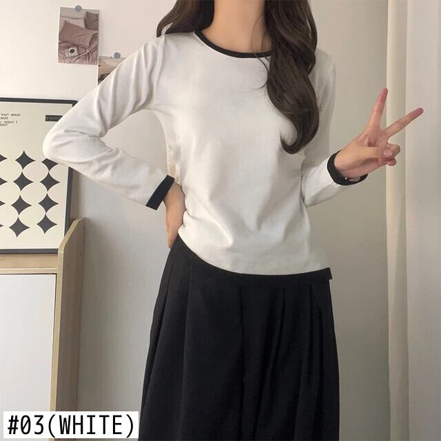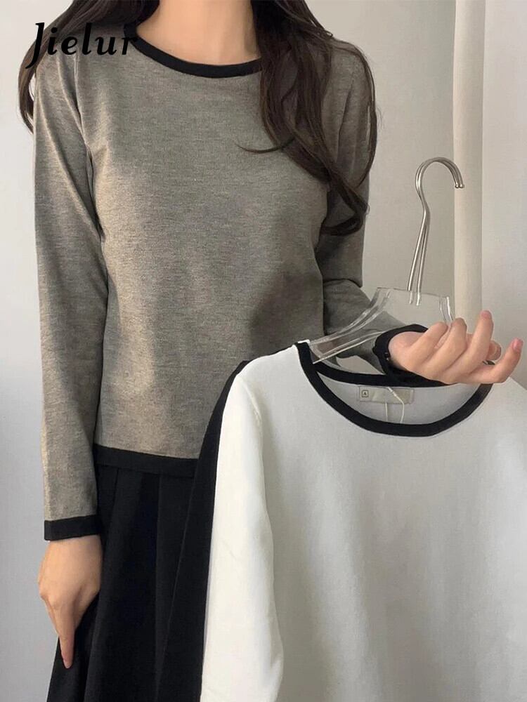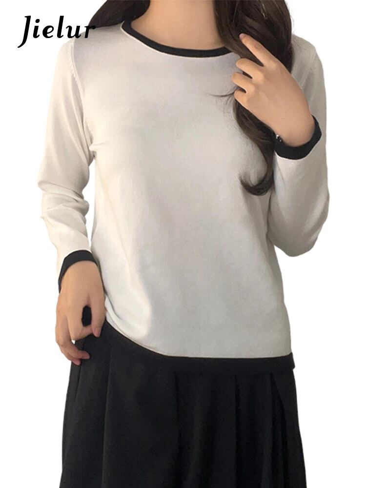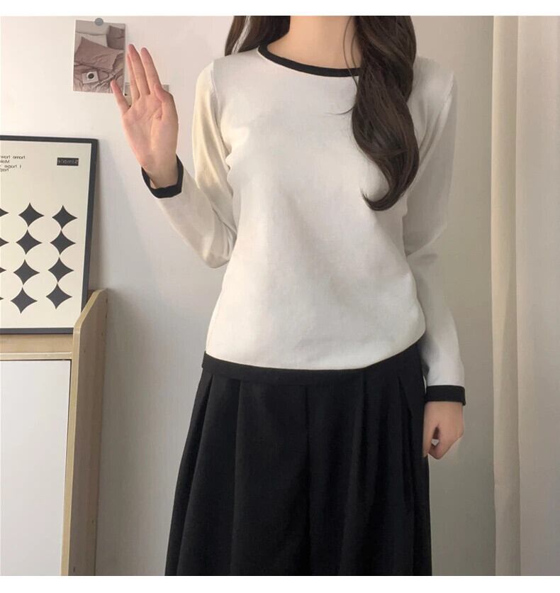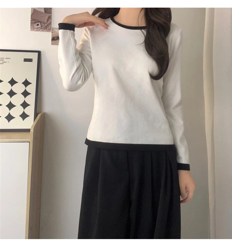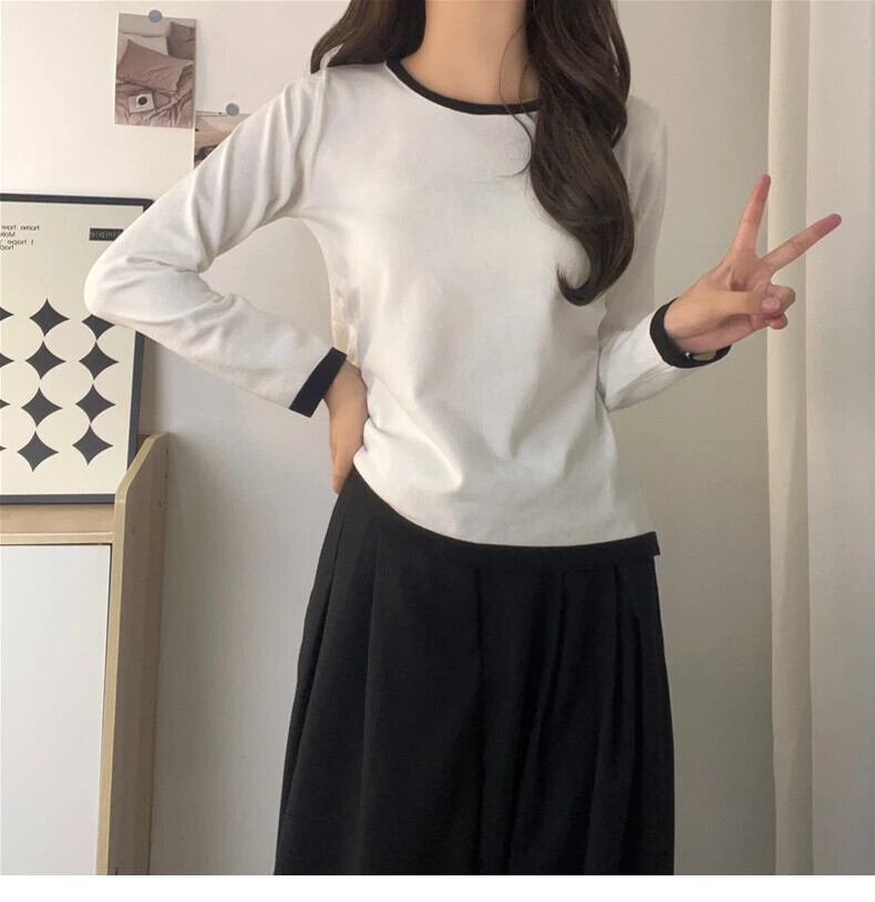 送料無料 Jielur 秋のコントラストカラースリム女性 Tシャツルーズシンプルなベーシック長袖 Tシャツ白黒グレートップ ロング ホワイト ブラック オータム 秋物 AE12188787816403533580