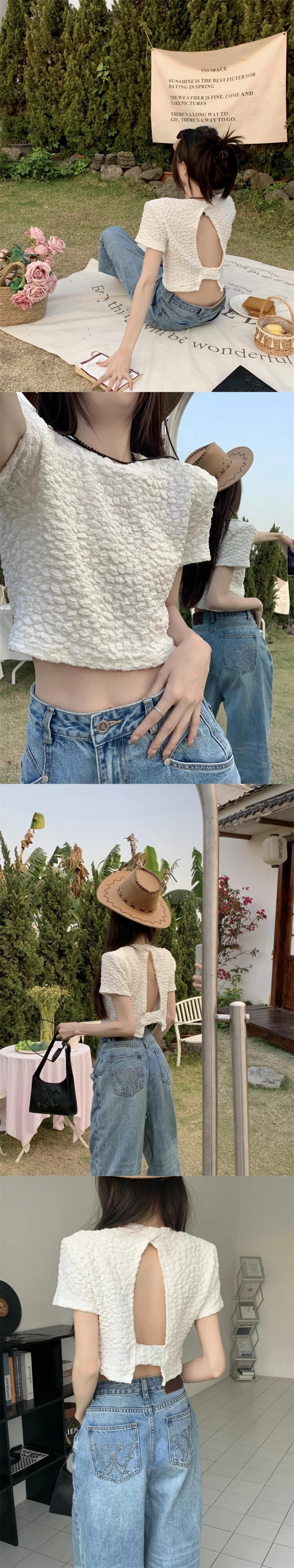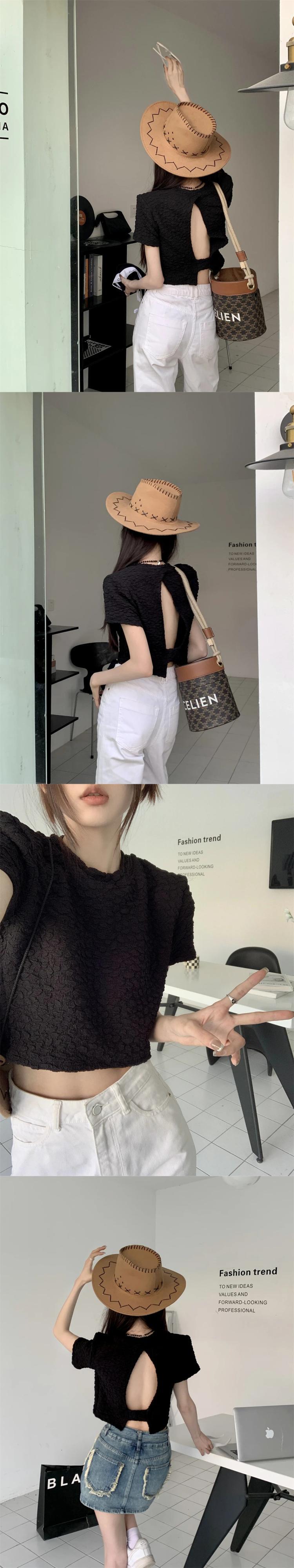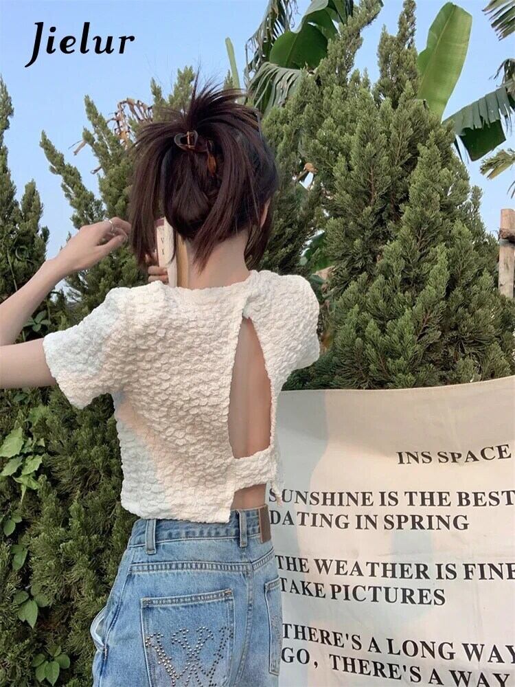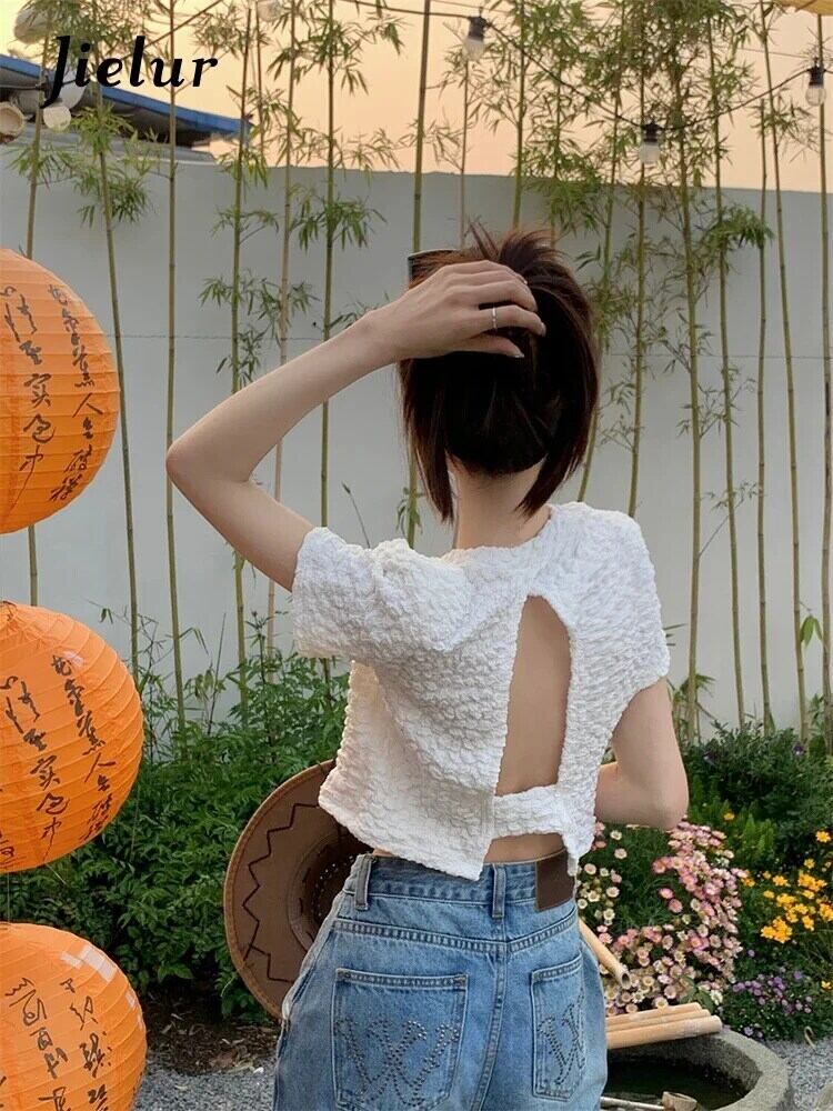 送料無料 Jielur 夏背中の開いたソリッドカラーの女性の Tシャツルーズシンプルな Tシャツ女性甘い黒、白のベーシックトップ ホワイト ブラック 大人ガーリー スウィート キュート カジュアル サマー 夏物 AE12188787826811354660