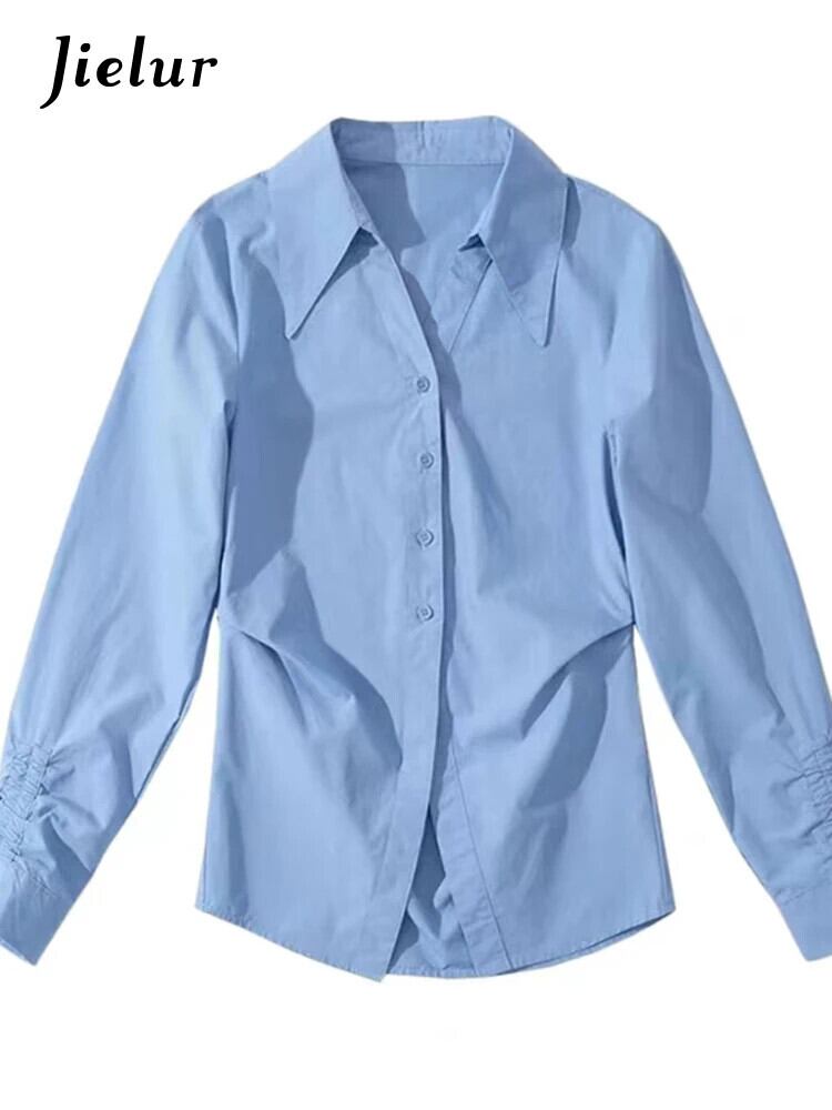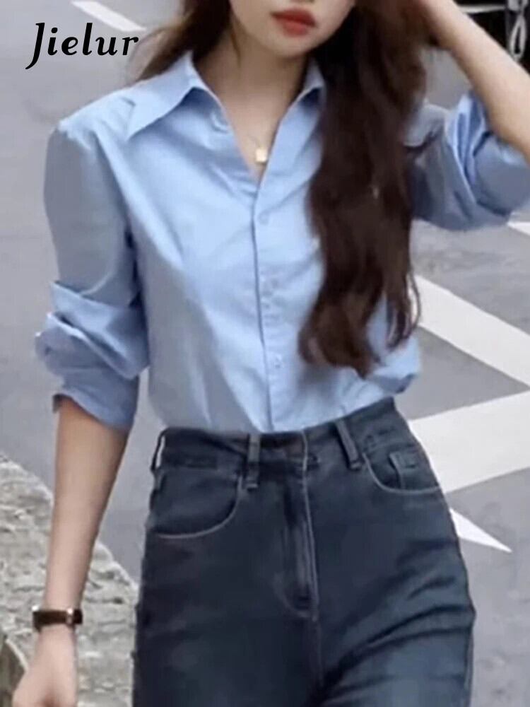 送料無料 Jielur 春無地スリム女性シャツフレンチルーズ女性シャツブルーシンプルなベーシック長袖トップ ロング スプリング 春物 ソリッドカラー AE12188787830554441753