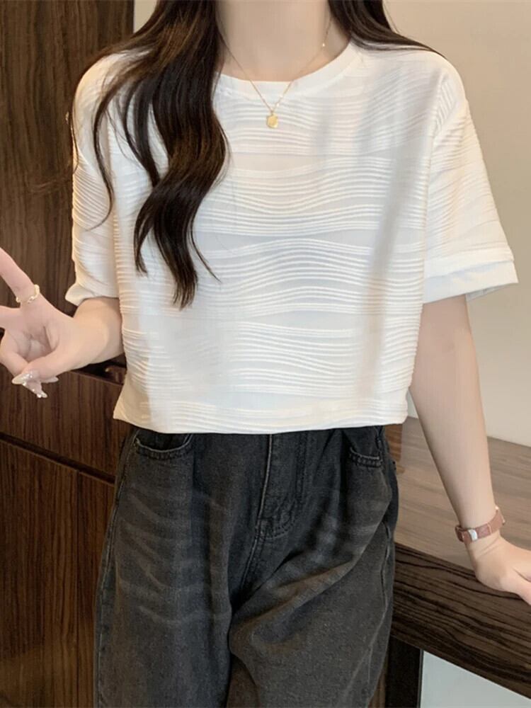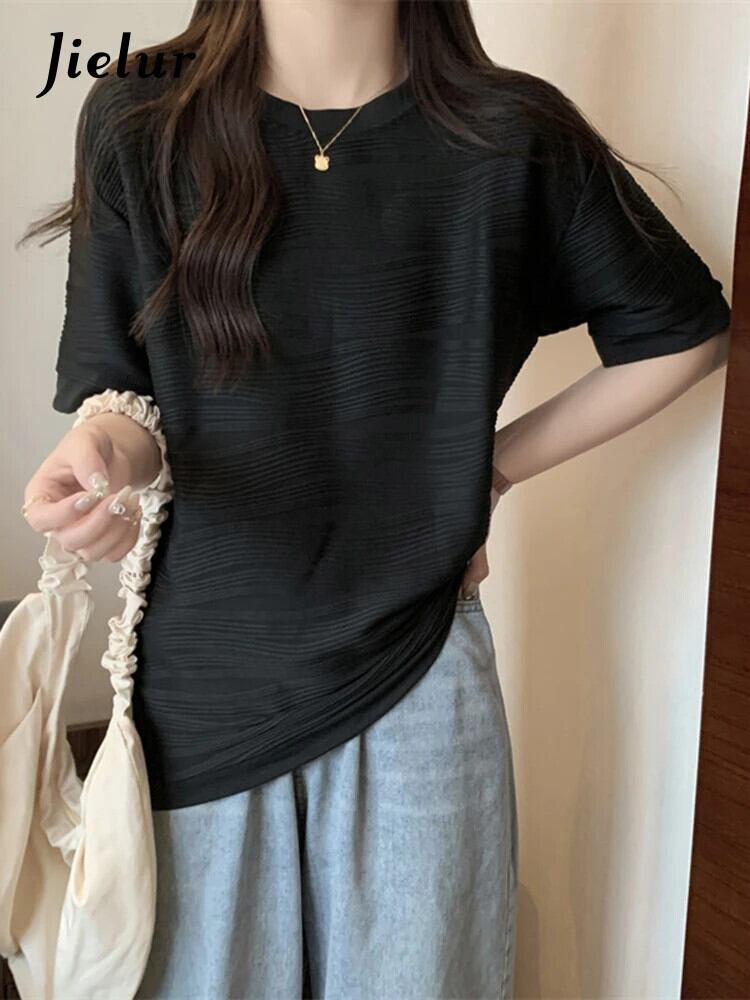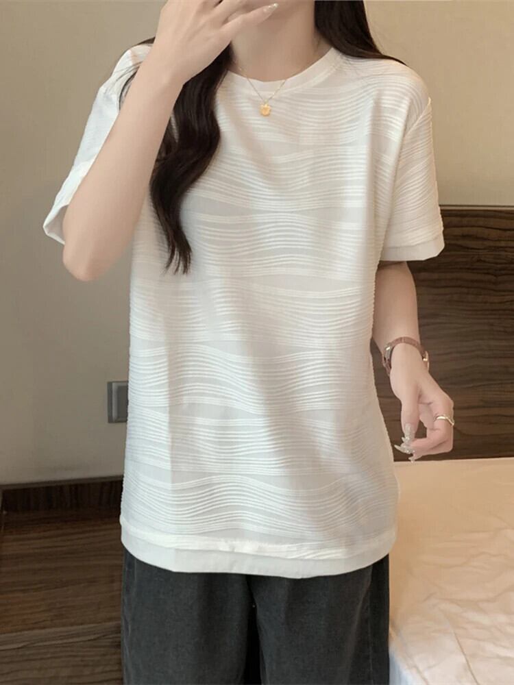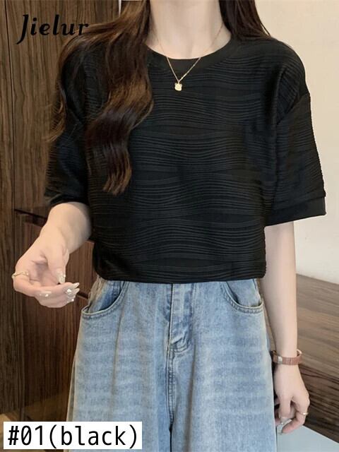 送料無料 Jielur 波ストライプ女性 Tシャツトップルーズ半袖 O ネック Tシャツレディースコットン Tシャツ女性大トップスゴス ショート ハーフスリーブ Oネック AE12188787843537860019