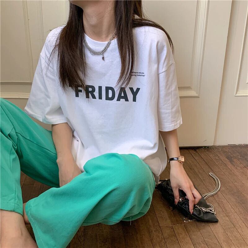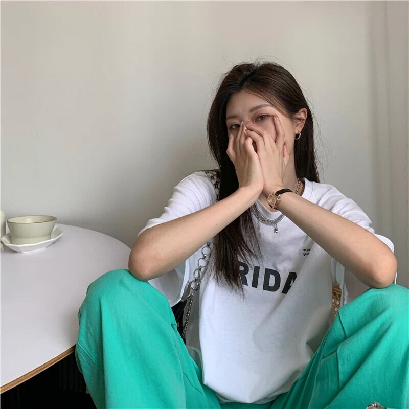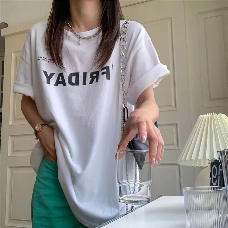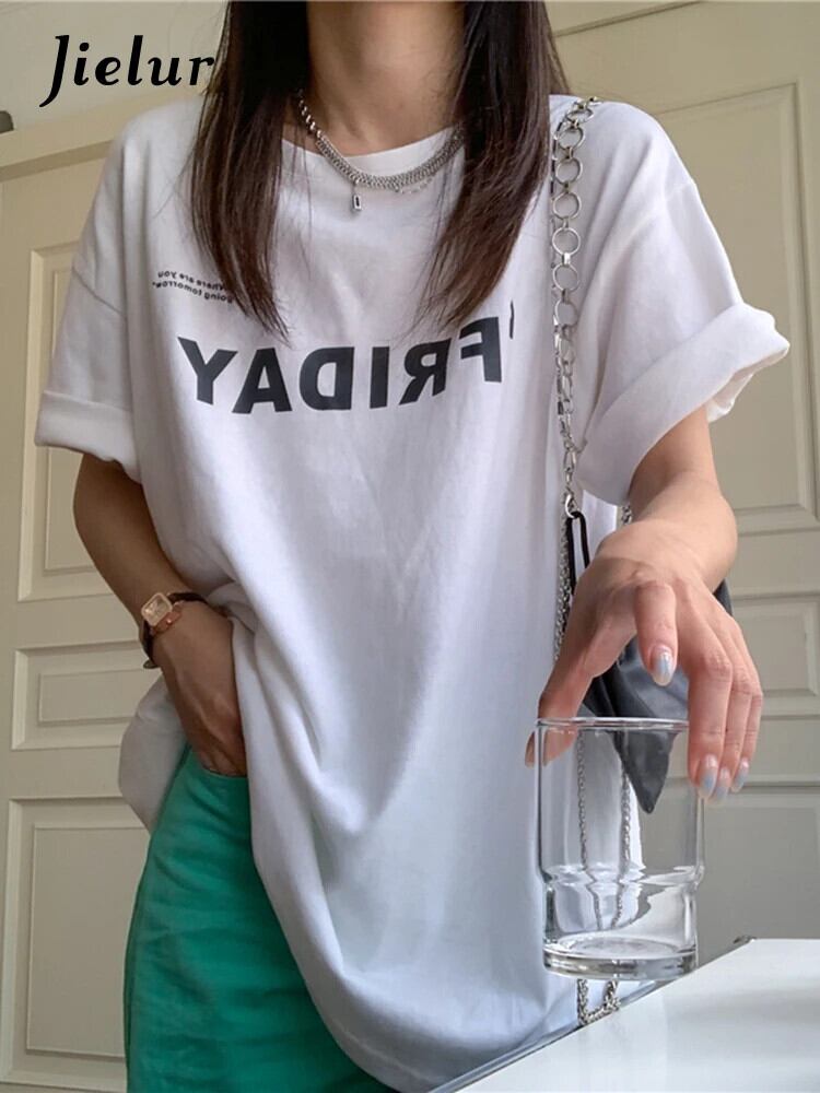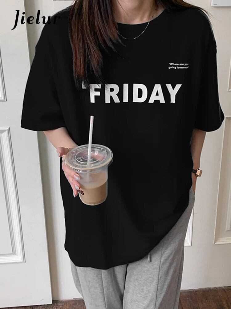 送料無料 Jielur 夏ヴィンテージルース女性の Tシャツシンプルなベーシックシックな Tシャツ女性白黒ストリートトップ ホワイト ブラック サマー 夏物 ビンテージ AE12188787868715158087