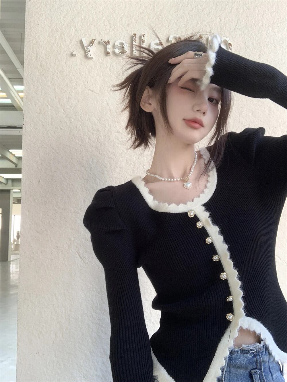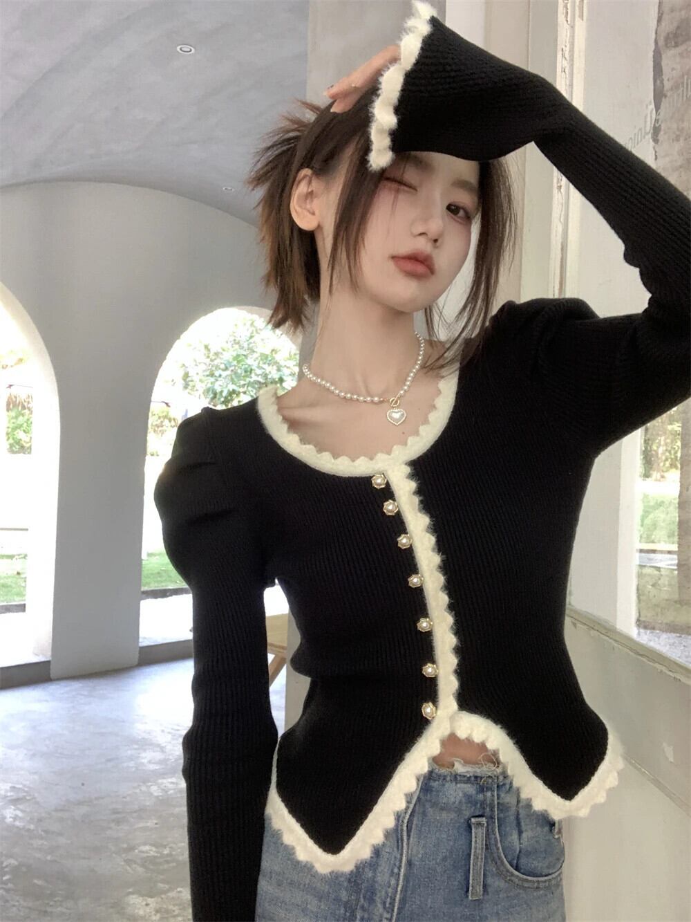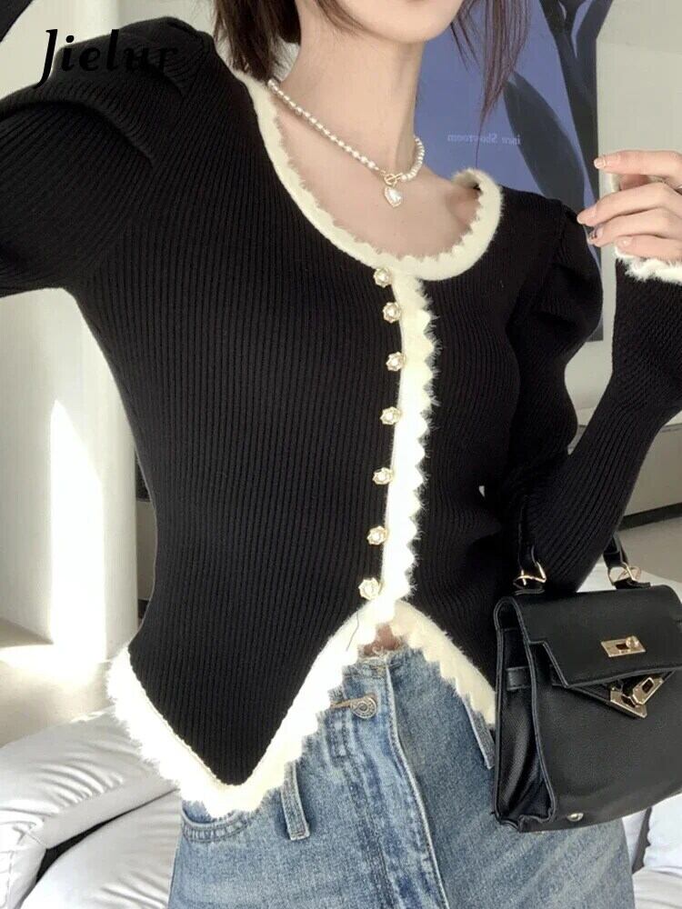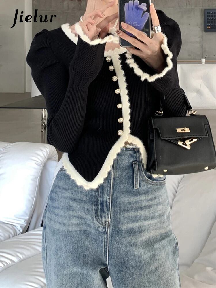 送料無料 Jielur 秋のコントラストカラーのフレンチカーディガン女性甘い女性カーディガンフレンチブラックニットカーディガン 大人ガーリー スウィート キュート カジュアル オータム 秋物 AE12188787891001741393