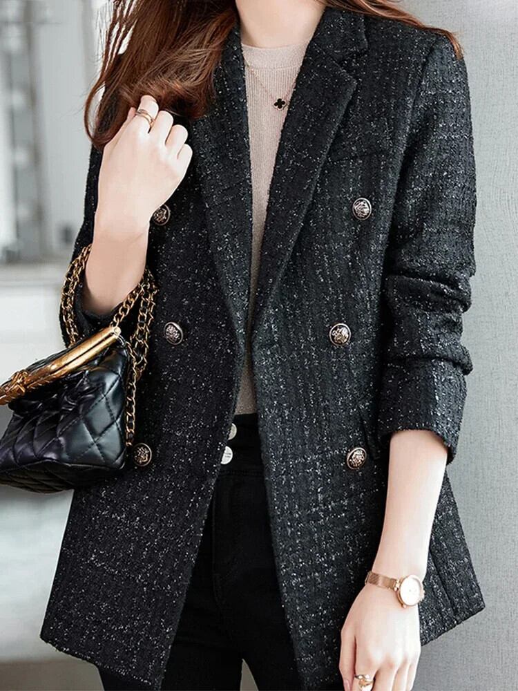 送料無料 スタイリッシュな女性の長袖ネイビー ツイード ブレザー厚くて暖かいダブルブレスト オーバーコート ボタン付き冬 ロング ウィンター 冬物 AE12188787892401441011