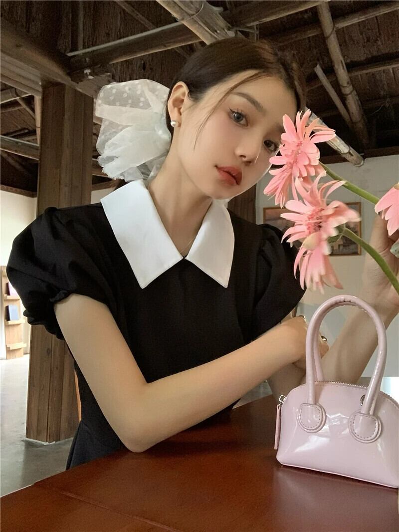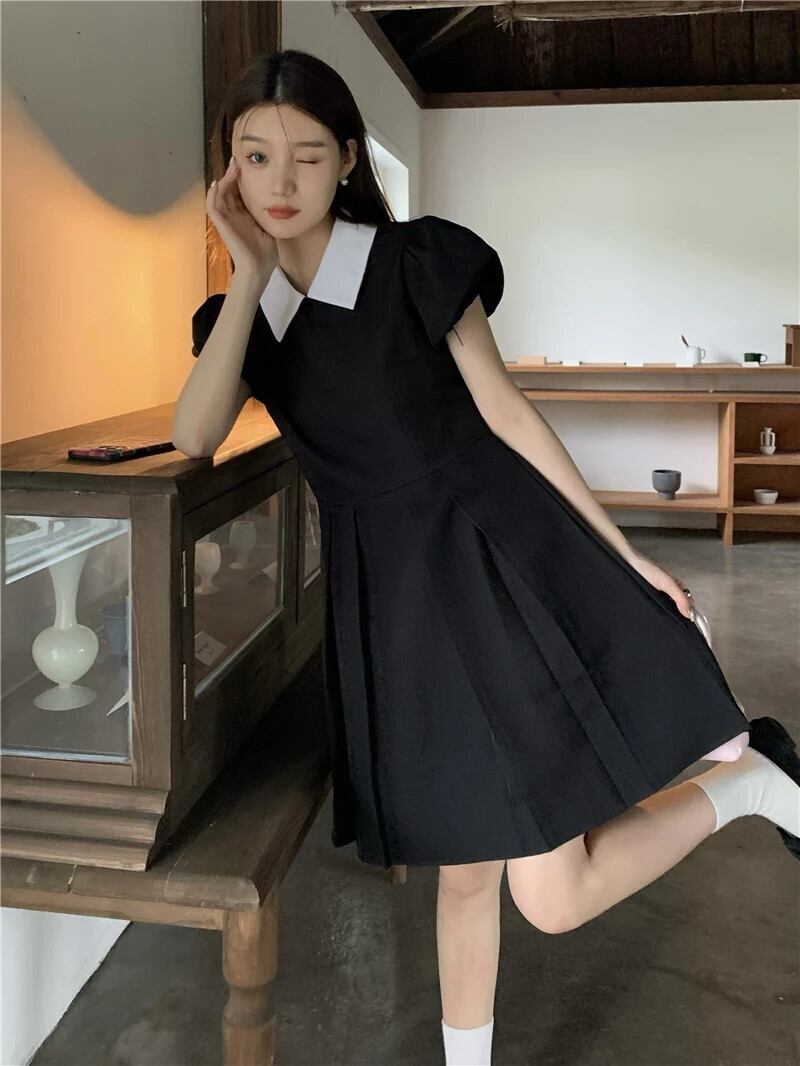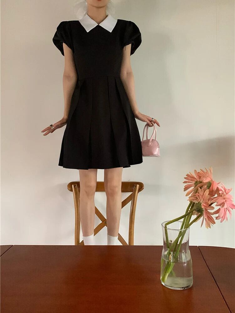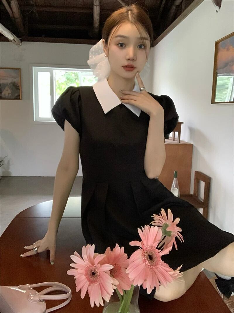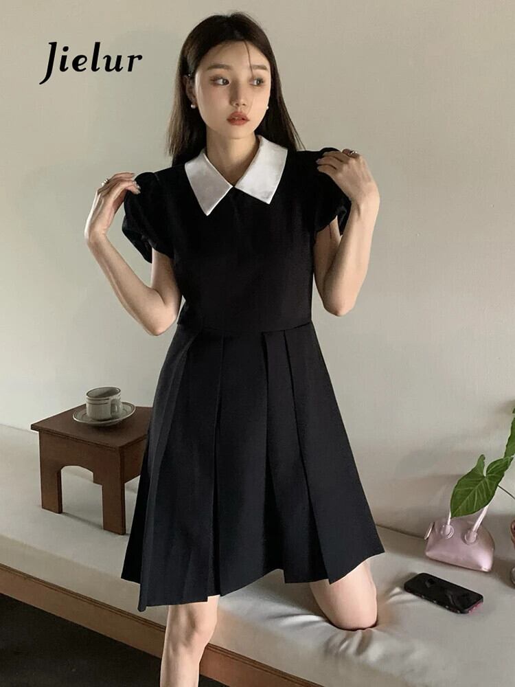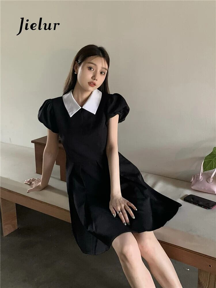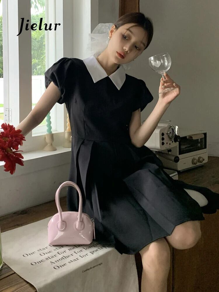 送料無料 Jielur 夏のセクシーなドレス黒のドレス女性レトロ半袖ピーターパン襟プレッピースタイルドレス ショート ブラック ハーフスリーブ サマー 夏物 AE12188787843614878948