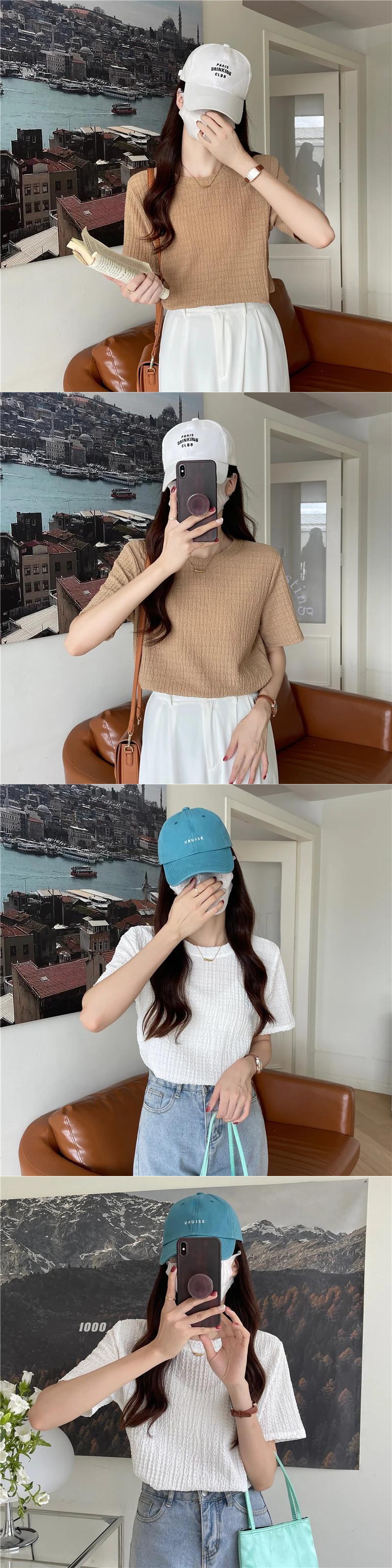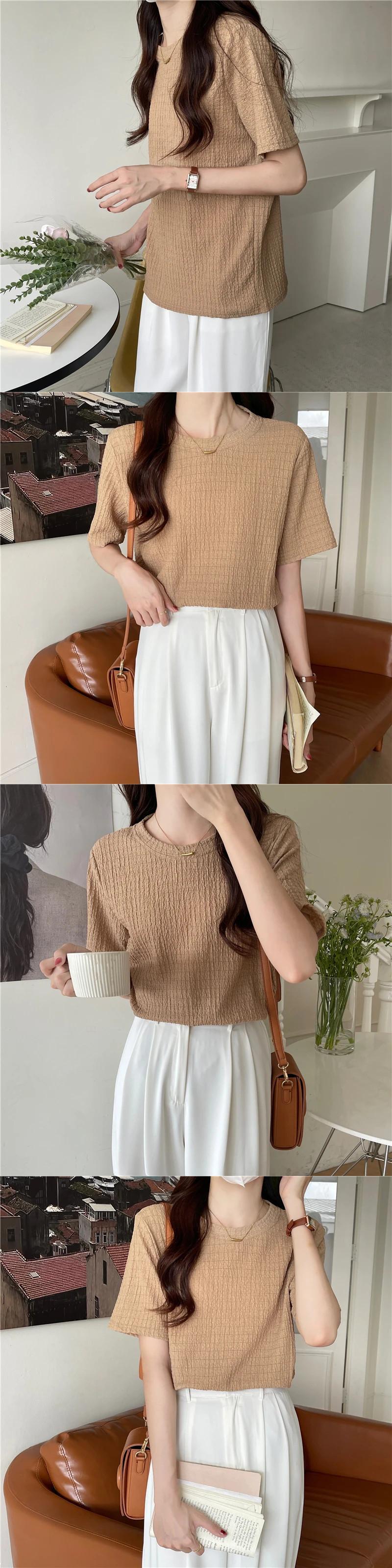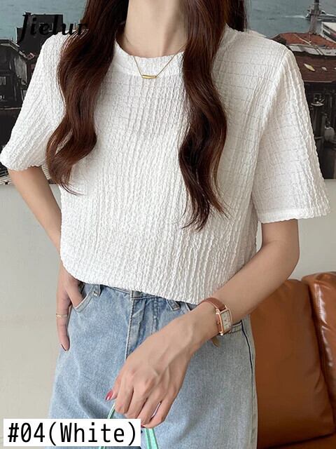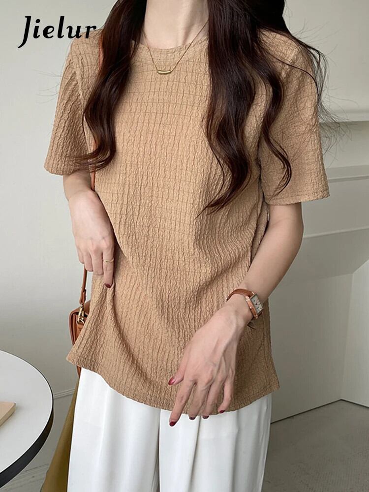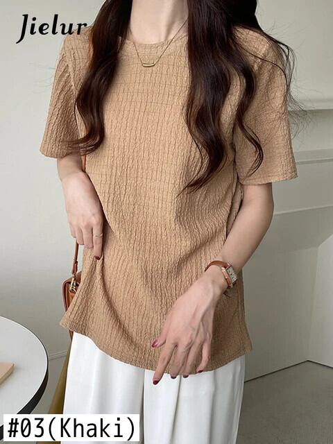 送料無料 Jielur 夏レトロ Tシャツ女性ソリッドカラープリーツジャカード半袖 Tシャツカーキブルートップス M-XL ショート ハーフスリーブ サマー 夏物 AE12188787810772244221