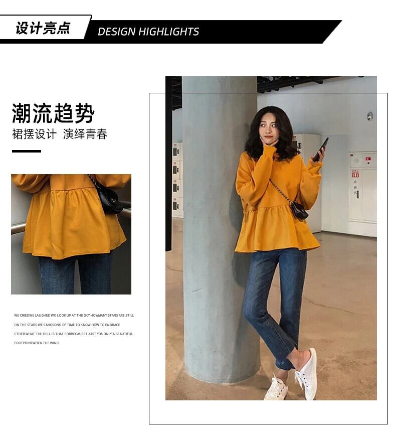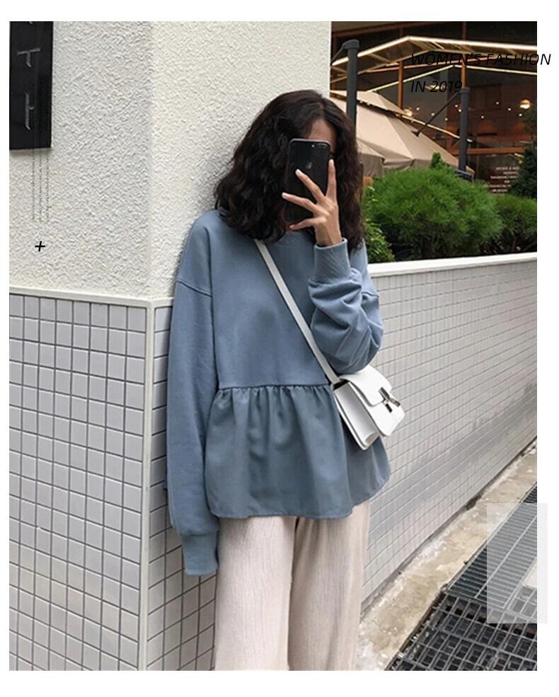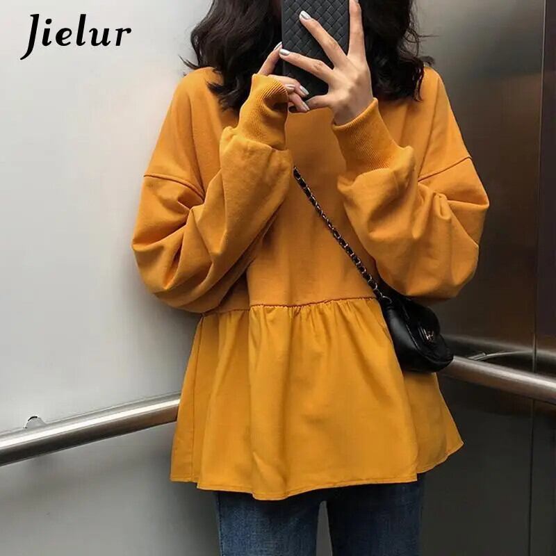 送料無料 Jielur 女性パーカースウェット春原宿固体フリル長袖パーカー O ネックプルオーバールーズ薄型トレーナー ロング シャツ かわいい スプリング 春物 Oネック ソリッドカラー AE12188787821210473473