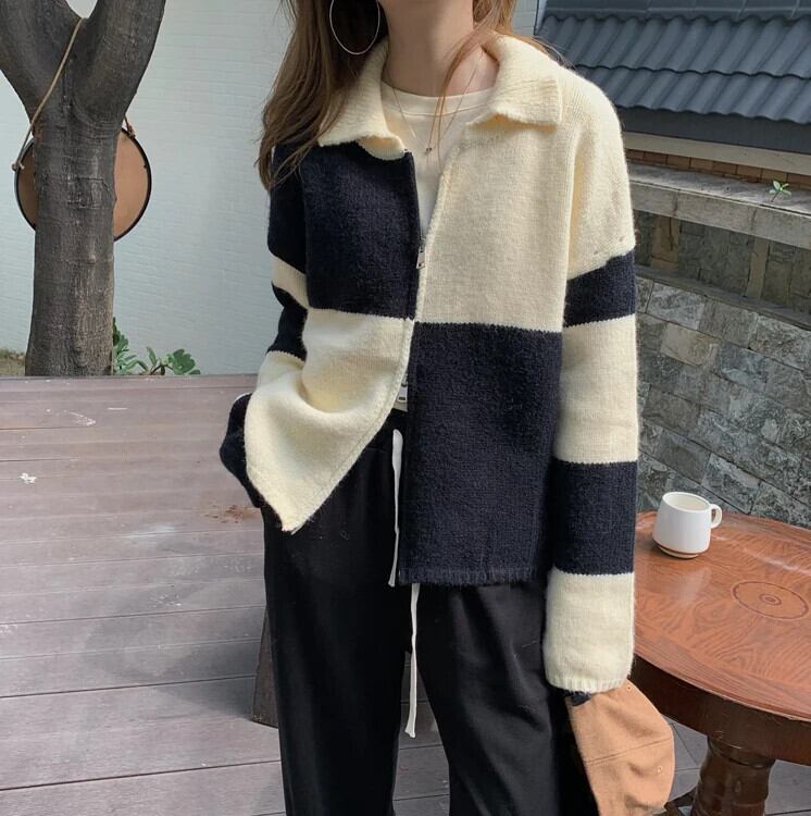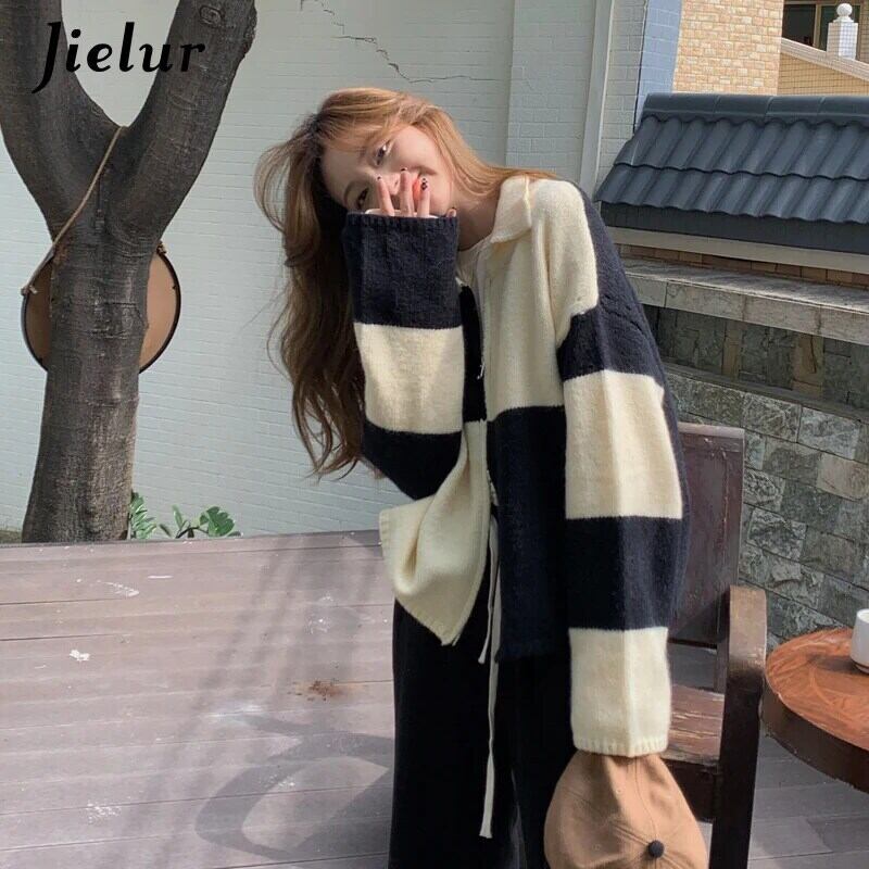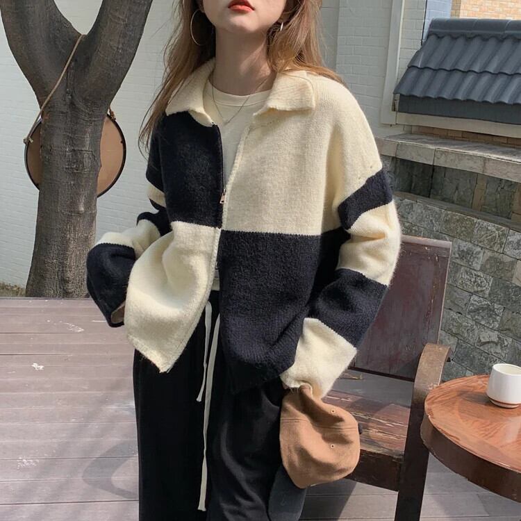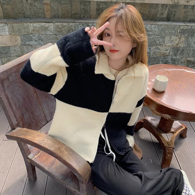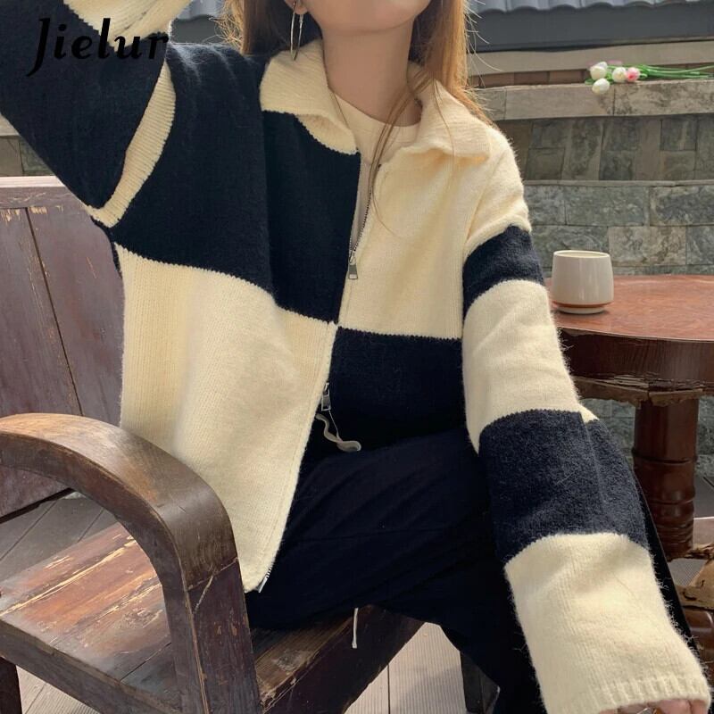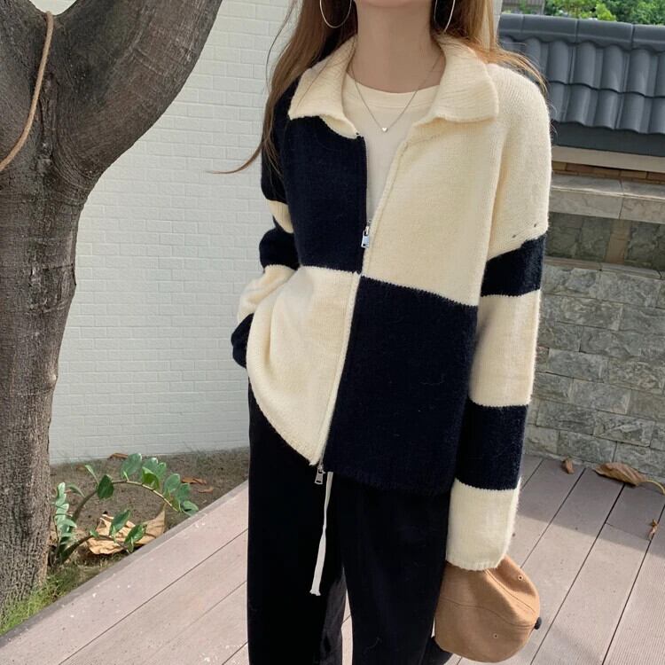 送料無料 Jielur クリエイティブダブルジッパー女性セーター冬のスペルカラーチェッカーボードニットセーターカーディガンジャケット暖かい ウィンター 冬物 AE12188787886256490696