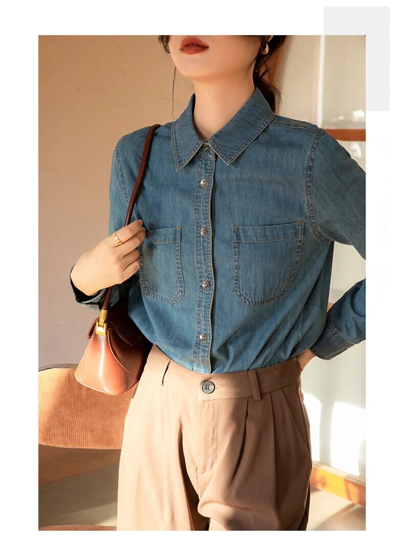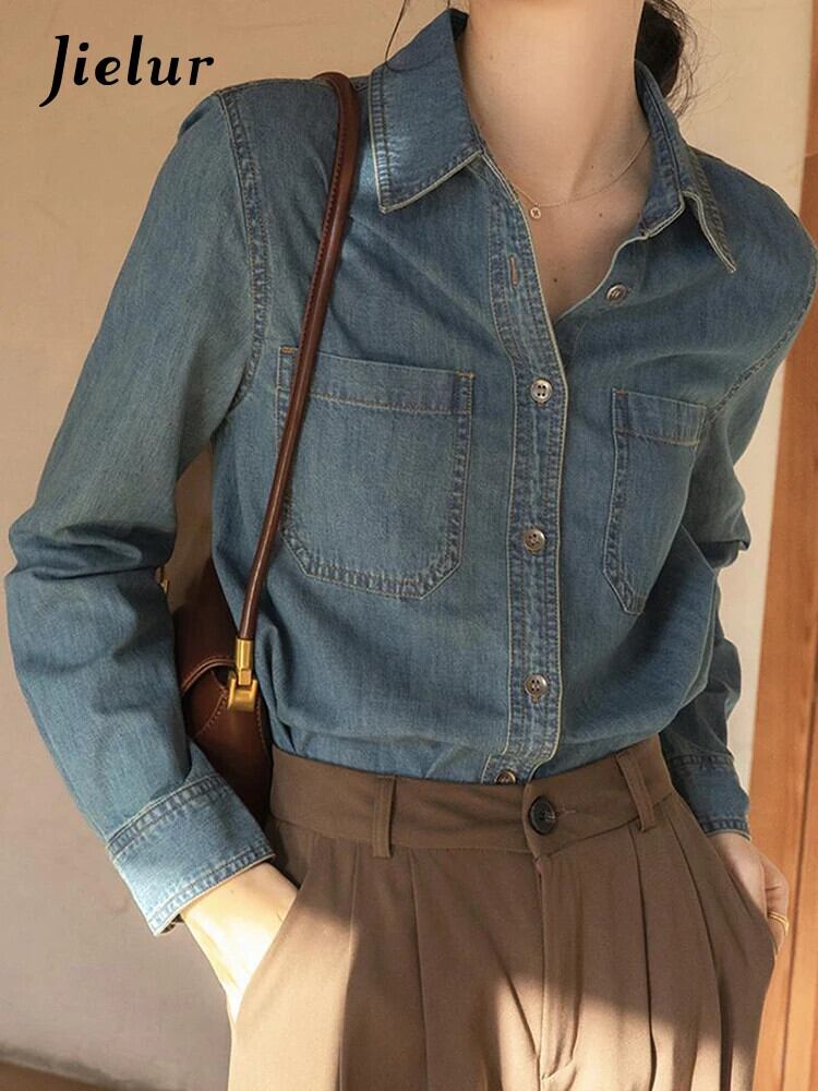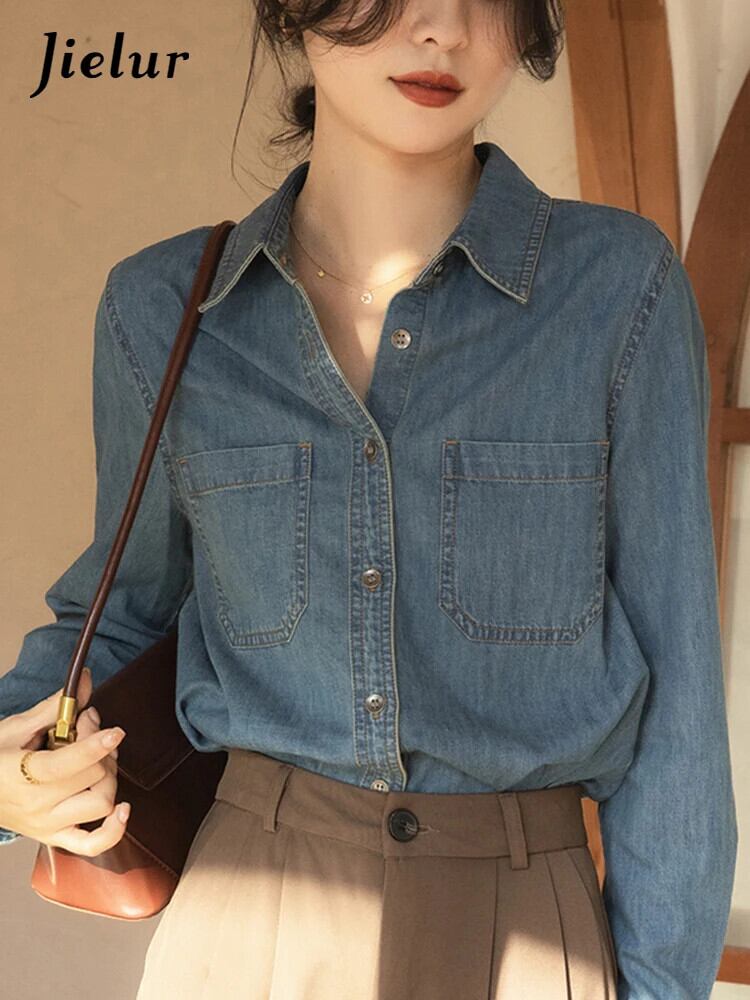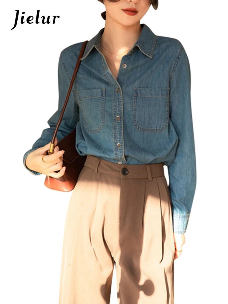 送料無料 Jielur 春デニム長袖シャツルーズストリートシックな女性シャツブルースリムシンプルなベーシックトップ ロング スプリング 春物 AE12188787832275632709