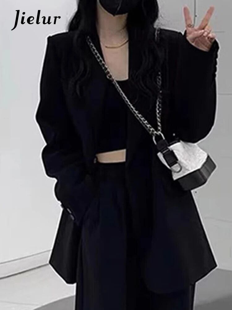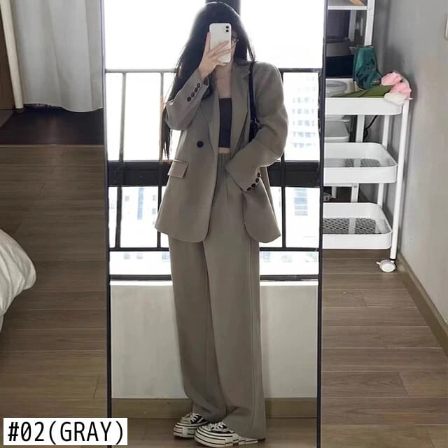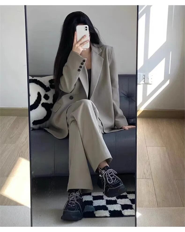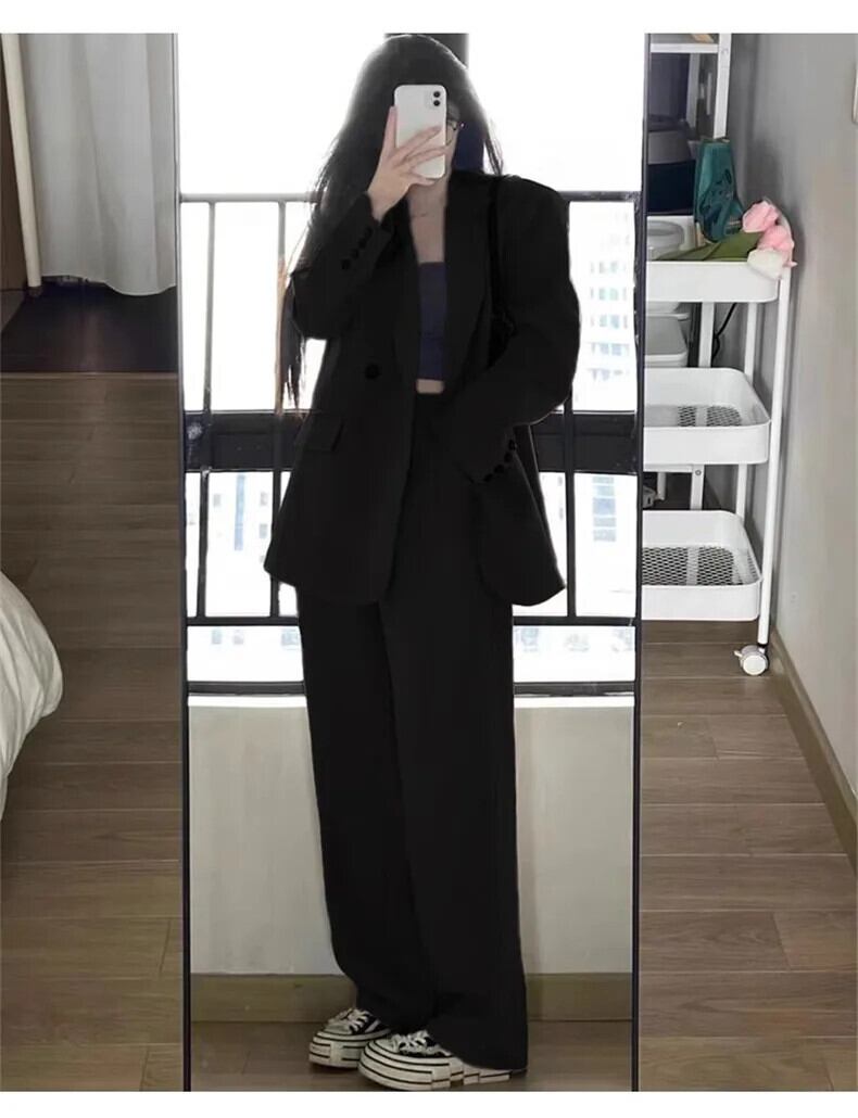 送料無料 Jielur ツーピース秋の女性パンツスーツルーズ無地パンツスーツ女性グレー黒シンプルなベーシックパンツスーツ ブラック オータム 秋物 ソリッドカラー AE12188787895417371264