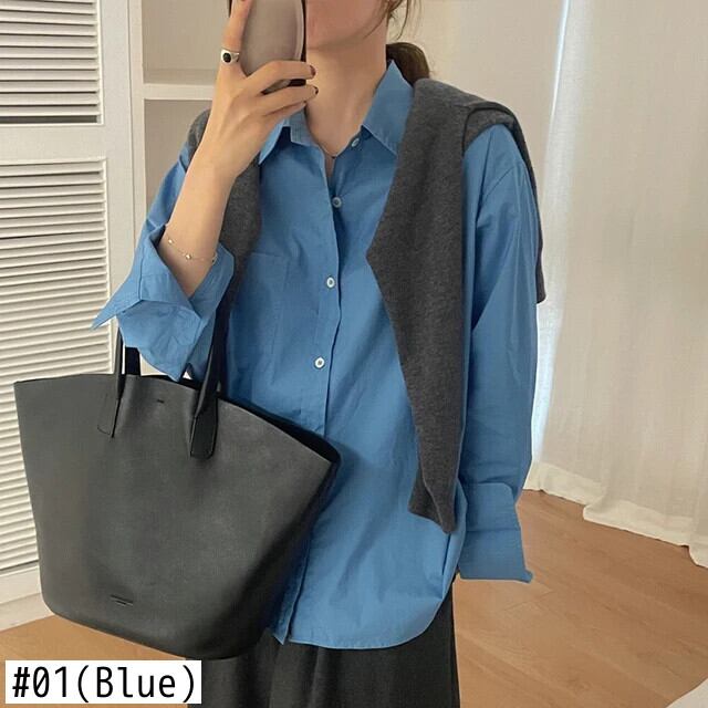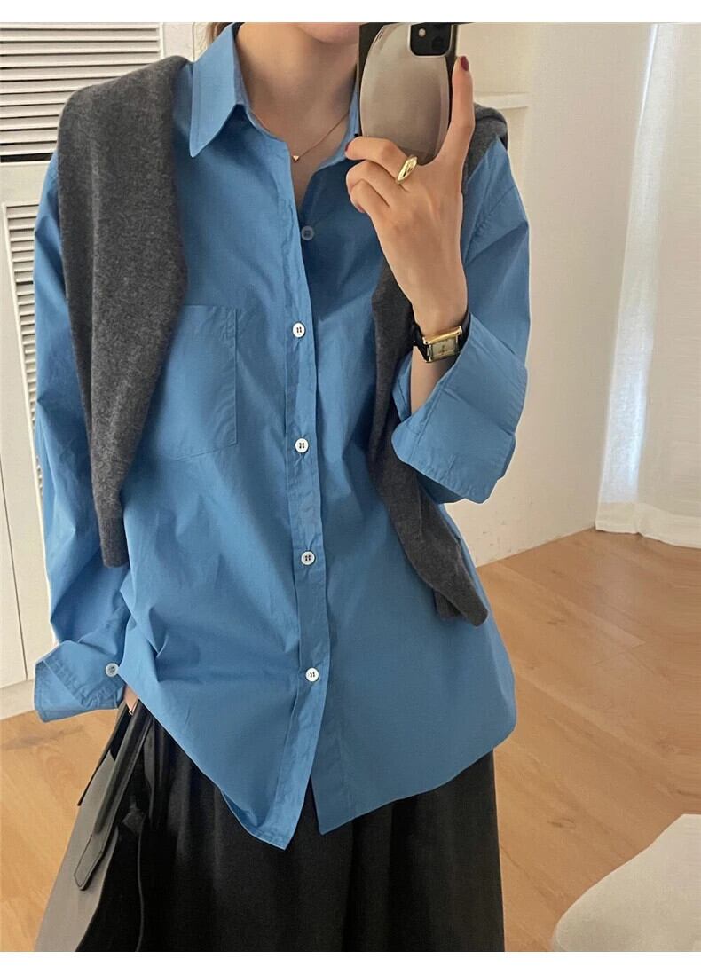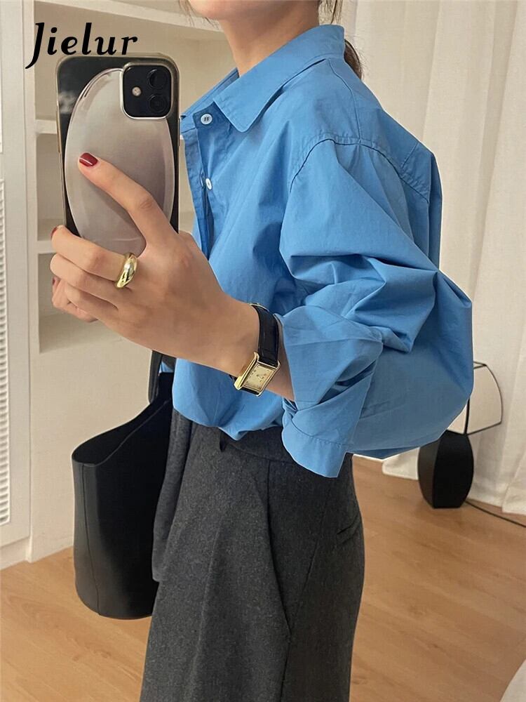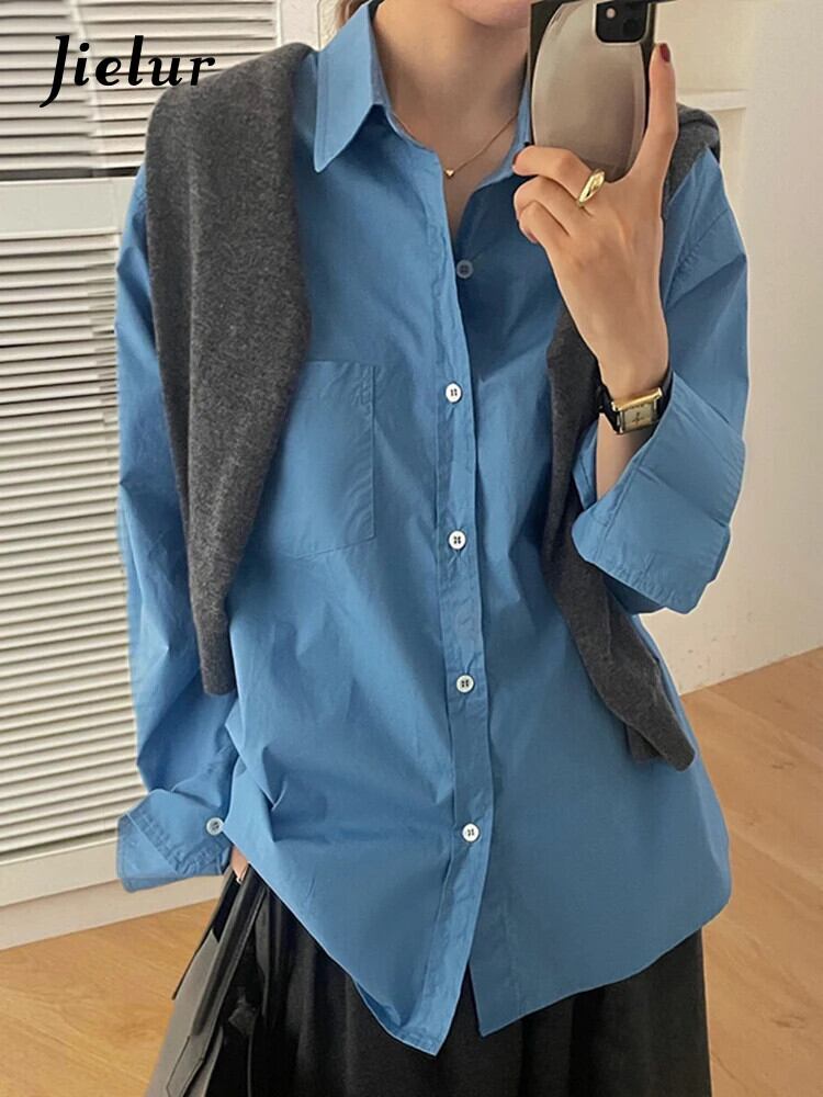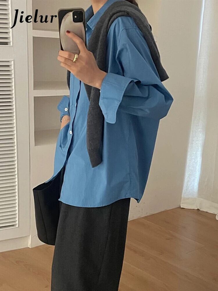 送料無料 Jielur 春無地スリム女性シャツルーズシンプルなベーシックシックな女性シャツブルーストリートトップ スプリング 春物 ソリッドカラー AE12188787898538669755