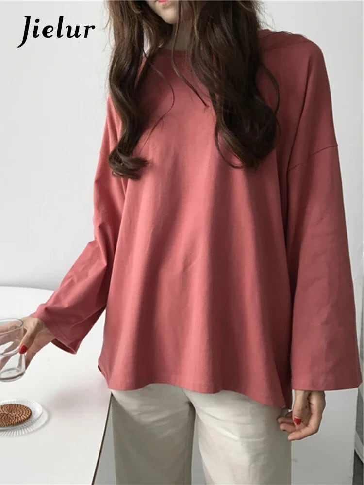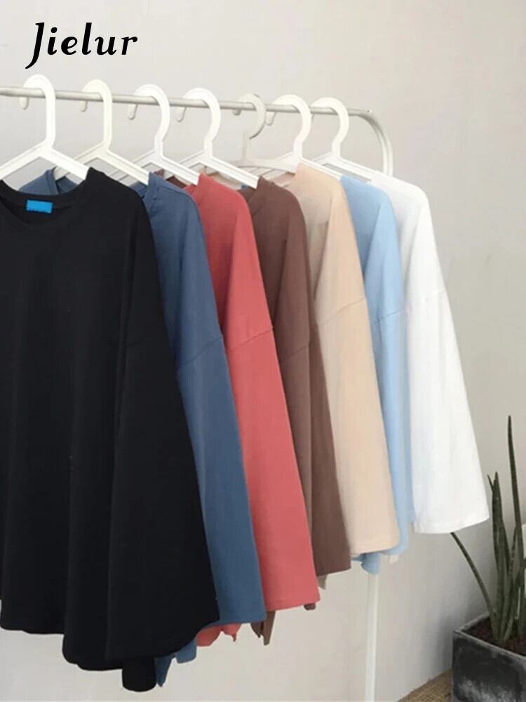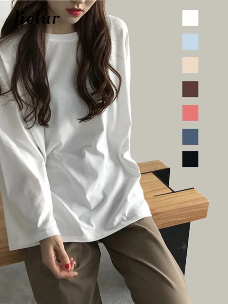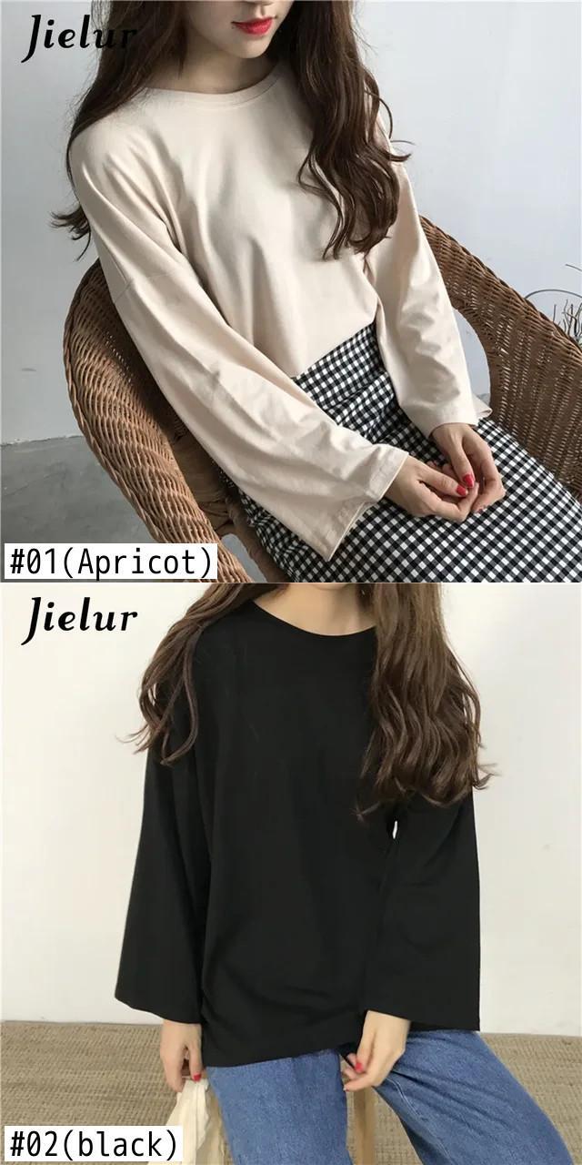 送料無料 Jielur Tシャツ 7 ソリッドカラー原宿 Tシャツ女性フレアスリーブベーシックトップ長袖白 Tシャツ Ropa ロング ホワイト かわいい AE12188787840874926746