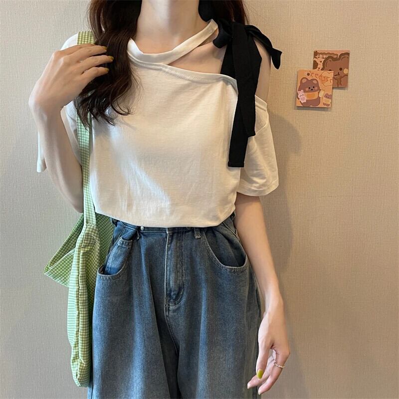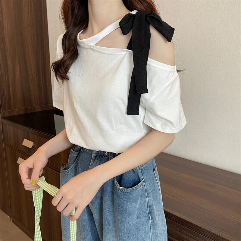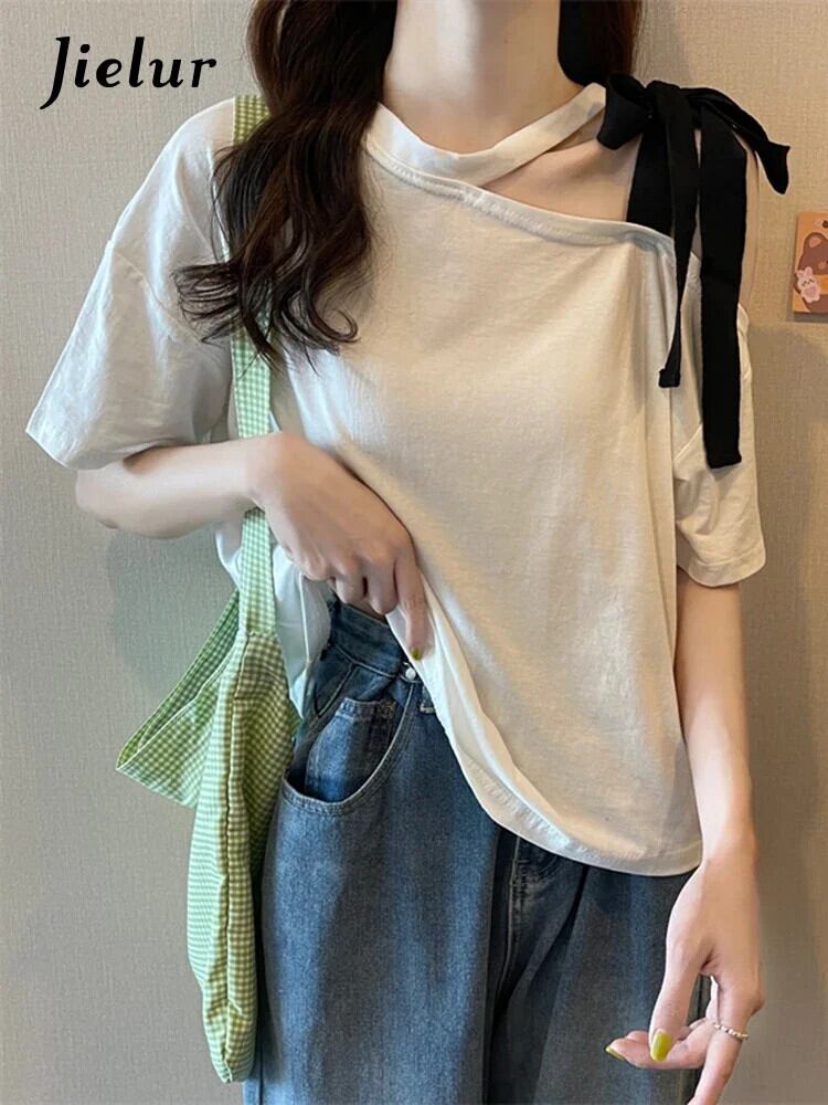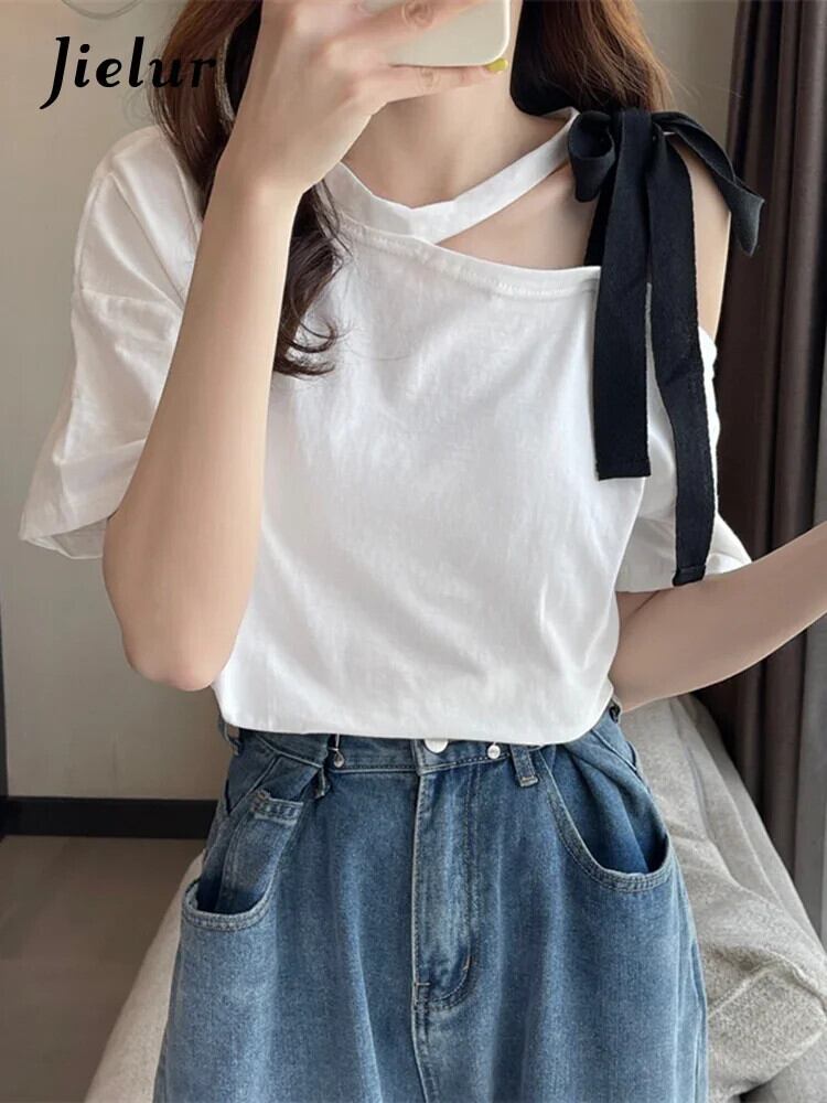 送料無料 Jielur セクシーなボウタイ白 Tシャツ女性の夏の半袖 Tシャツ綿オフショルダートップ ショート ホワイト リボン コットン ハーフスリーブ サマー 夏物 AE12188787864201736708