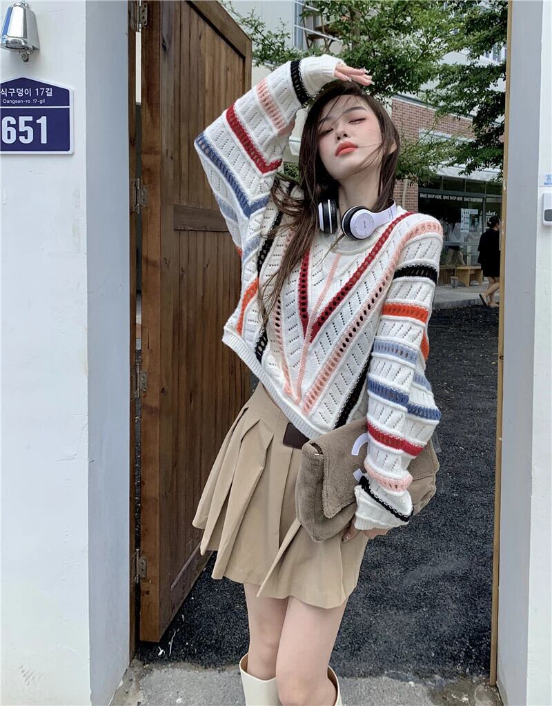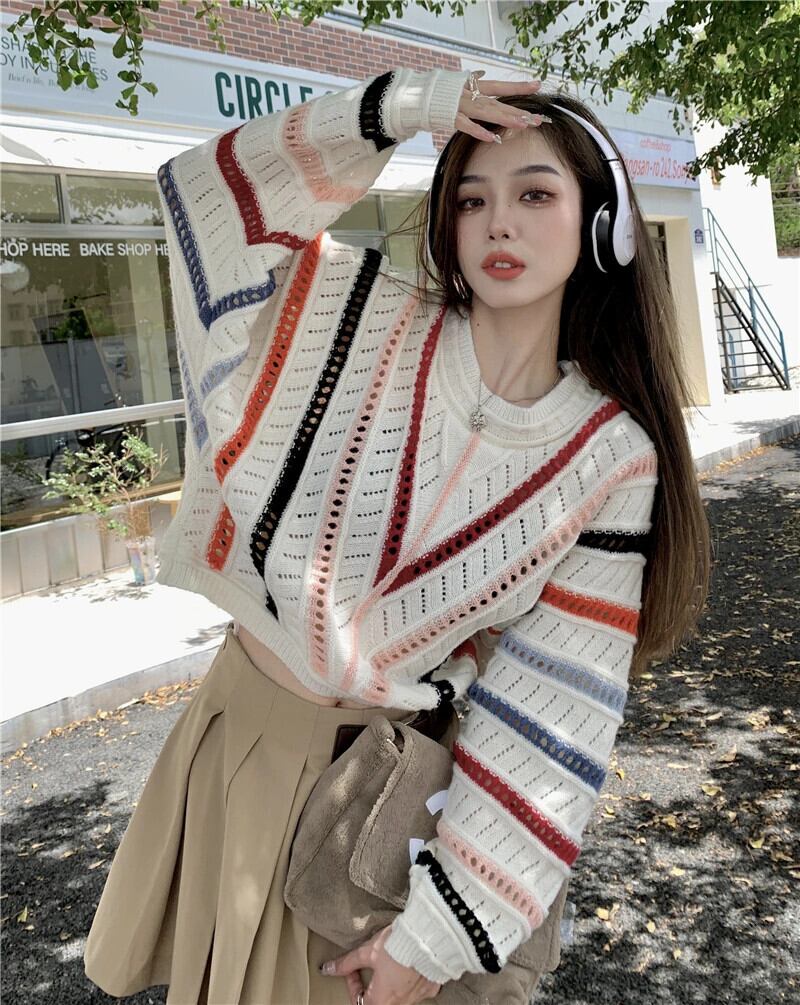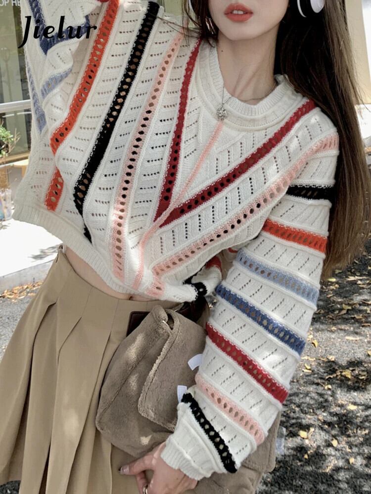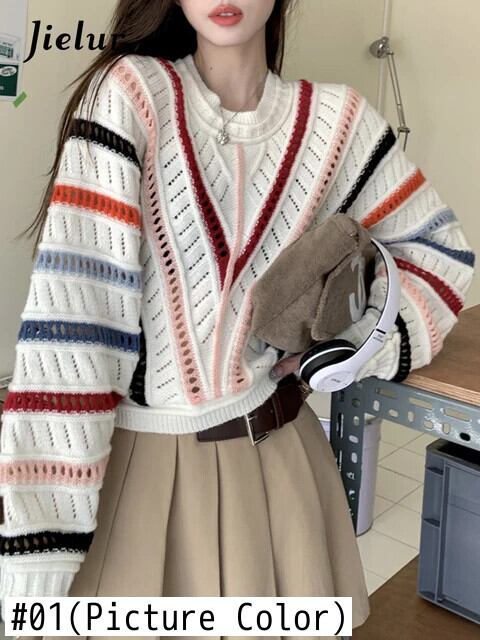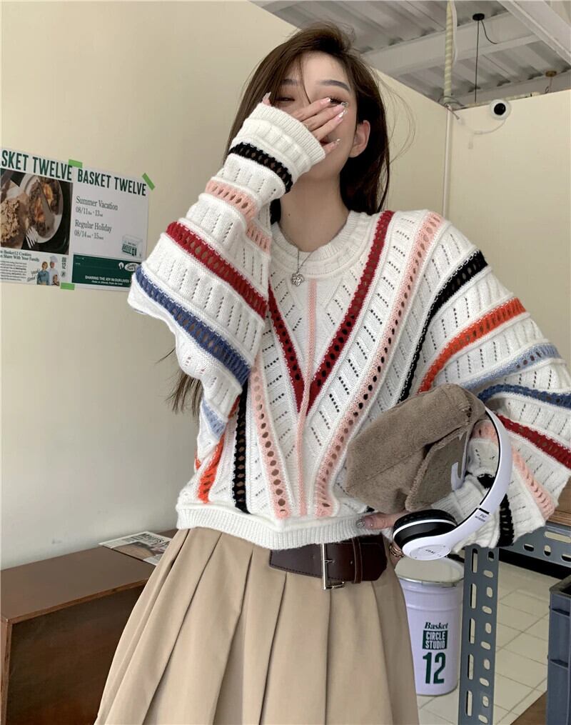 送料無料 Jielur スタイリッシュなレインボーストライプ秋冬ショートセータールーズバットスリーブニットプルオーバーヴィンテージガールトップス オータム 秋物 ウィンター 冬物 ビンテージ AE12188787840005411690
