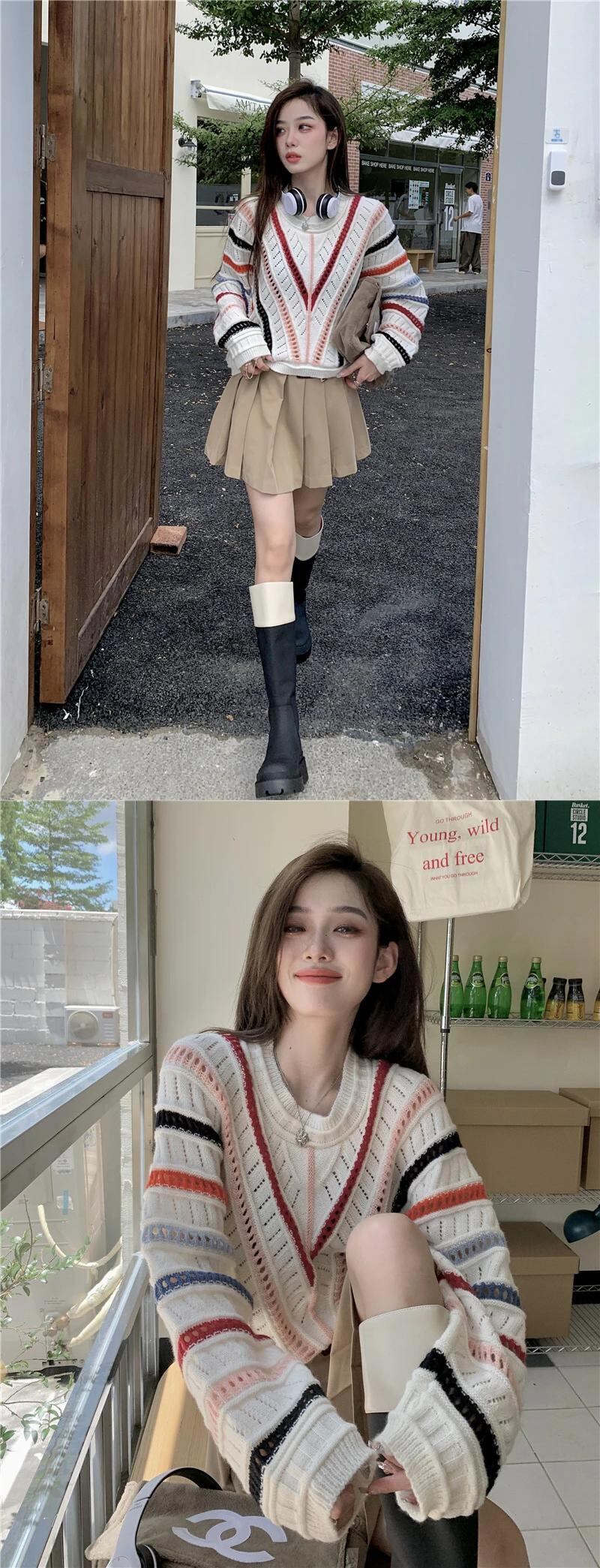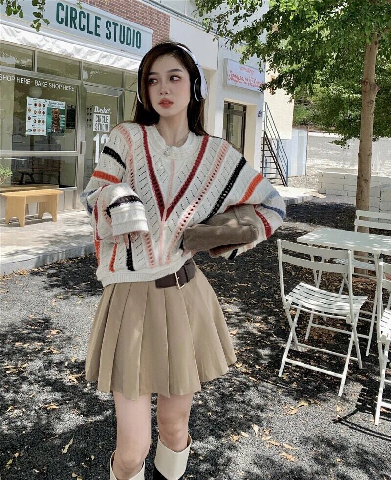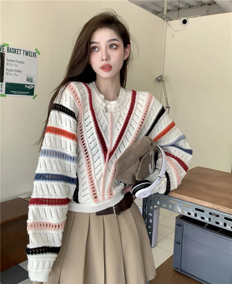 送料無料 Jielur スタイリッシュなレインボーストライプ秋冬ショートセータールーズバットスリーブニットプルオーバーヴィンテージガールトップス オータム 秋物 ウィンター 冬物 ビンテージ AE12188787840005411690