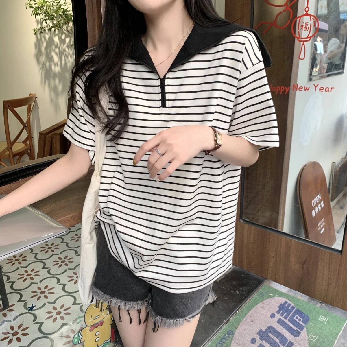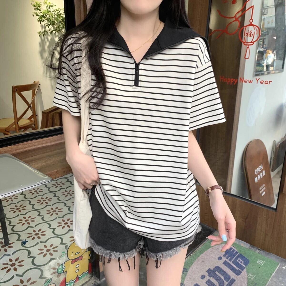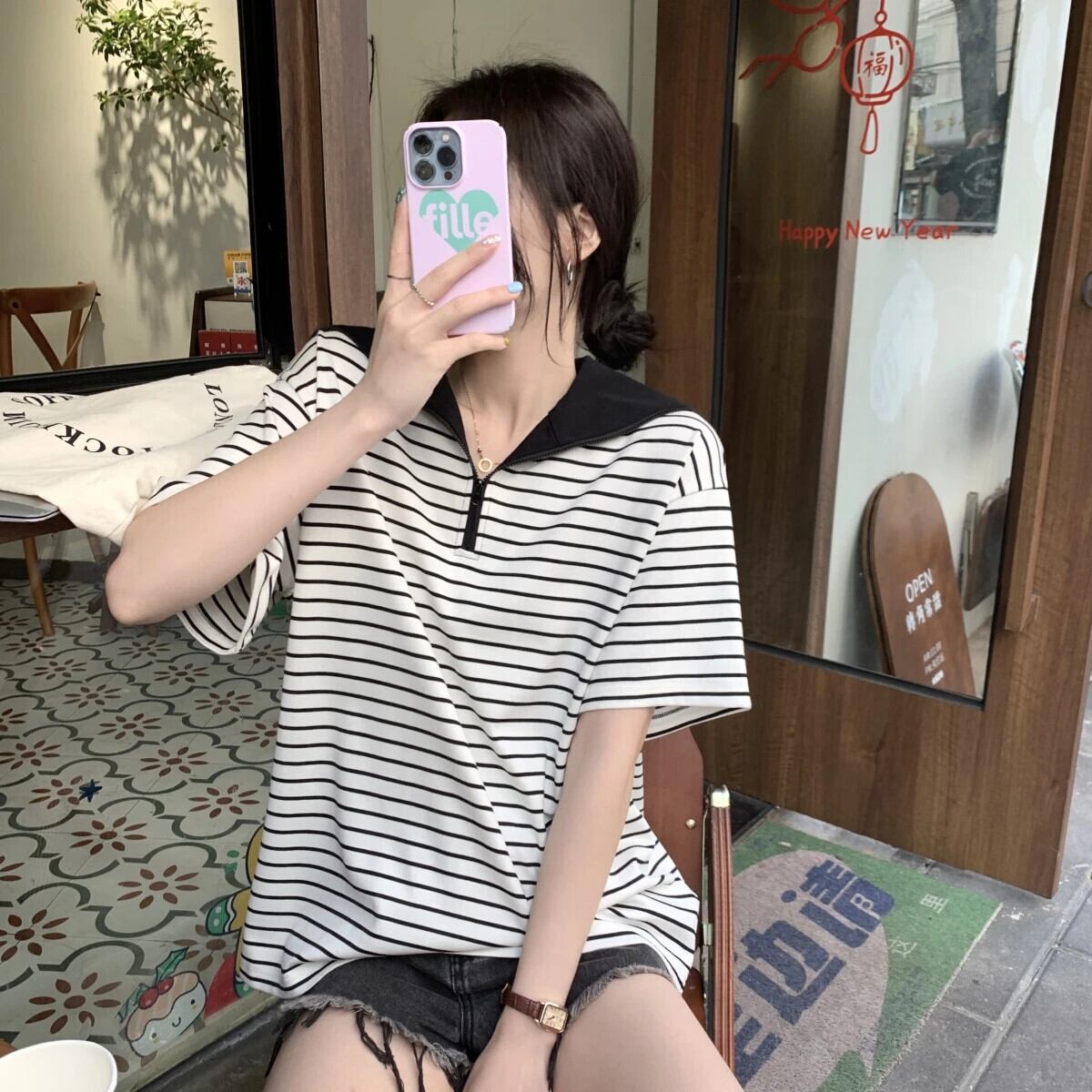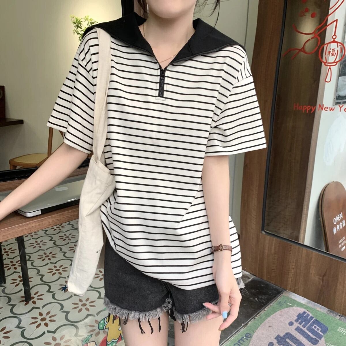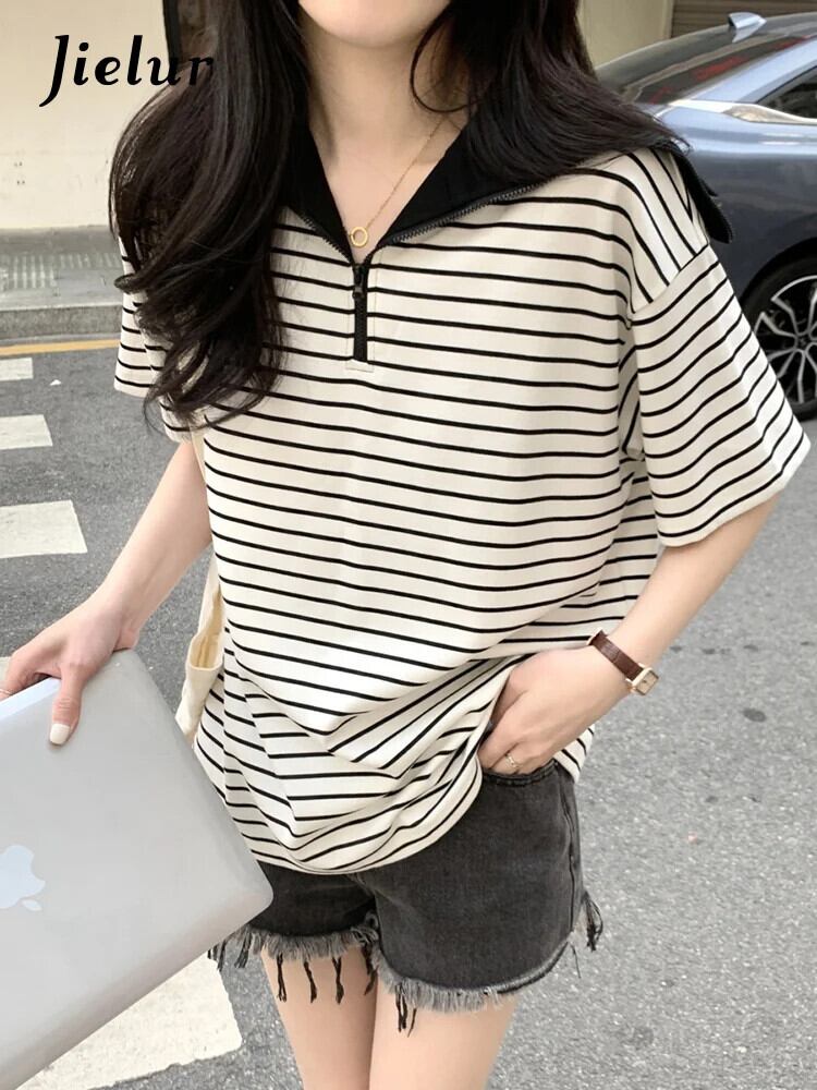 送料無料 Jielur 夏ルーズサイドストライプレディース Tシャツコントラストカラーストリート Tシャツ白シンプルベーシックトップ ホワイト サマー 夏物 AE12188787838236599630