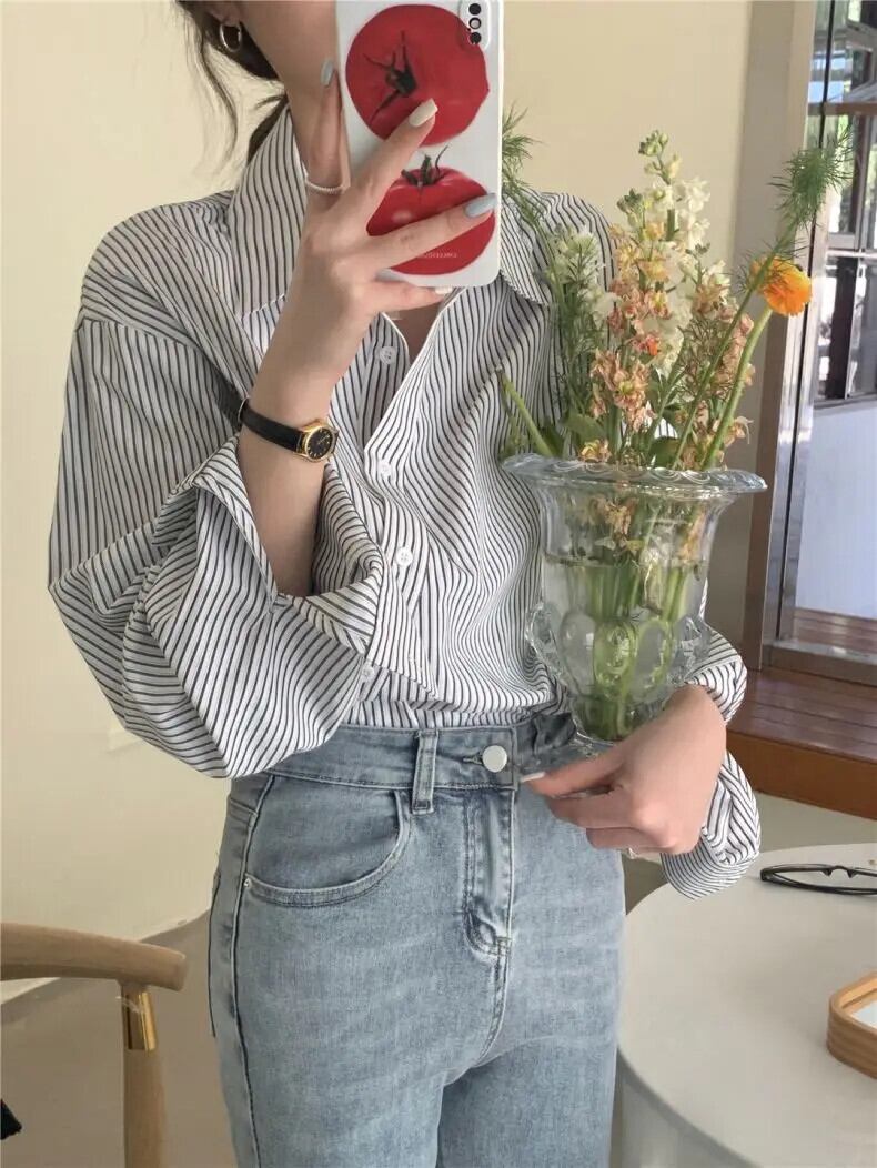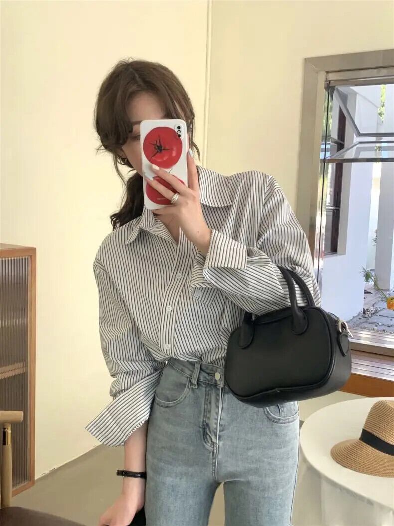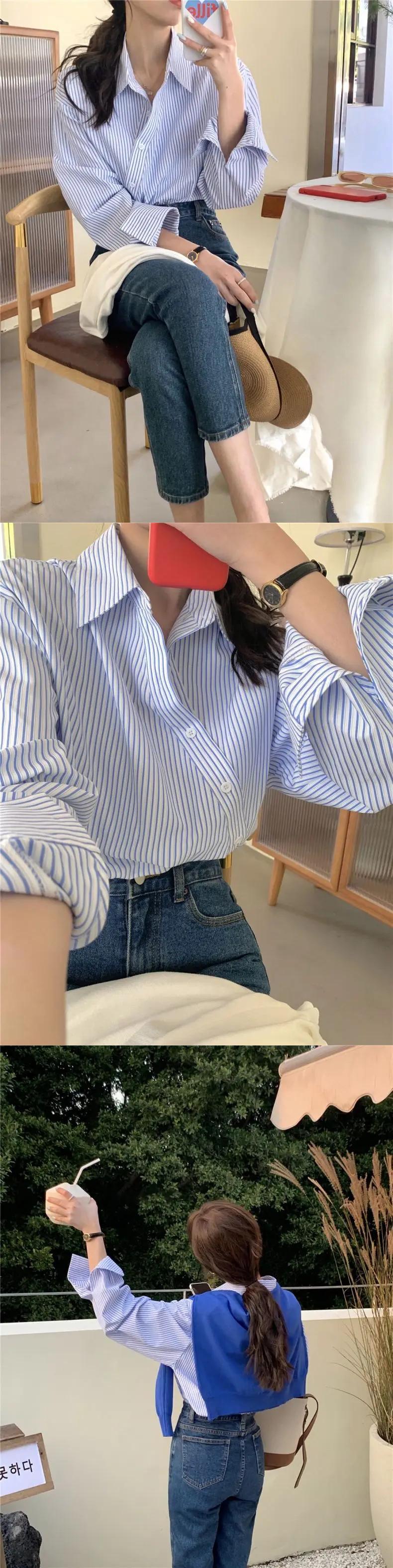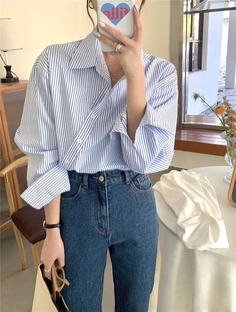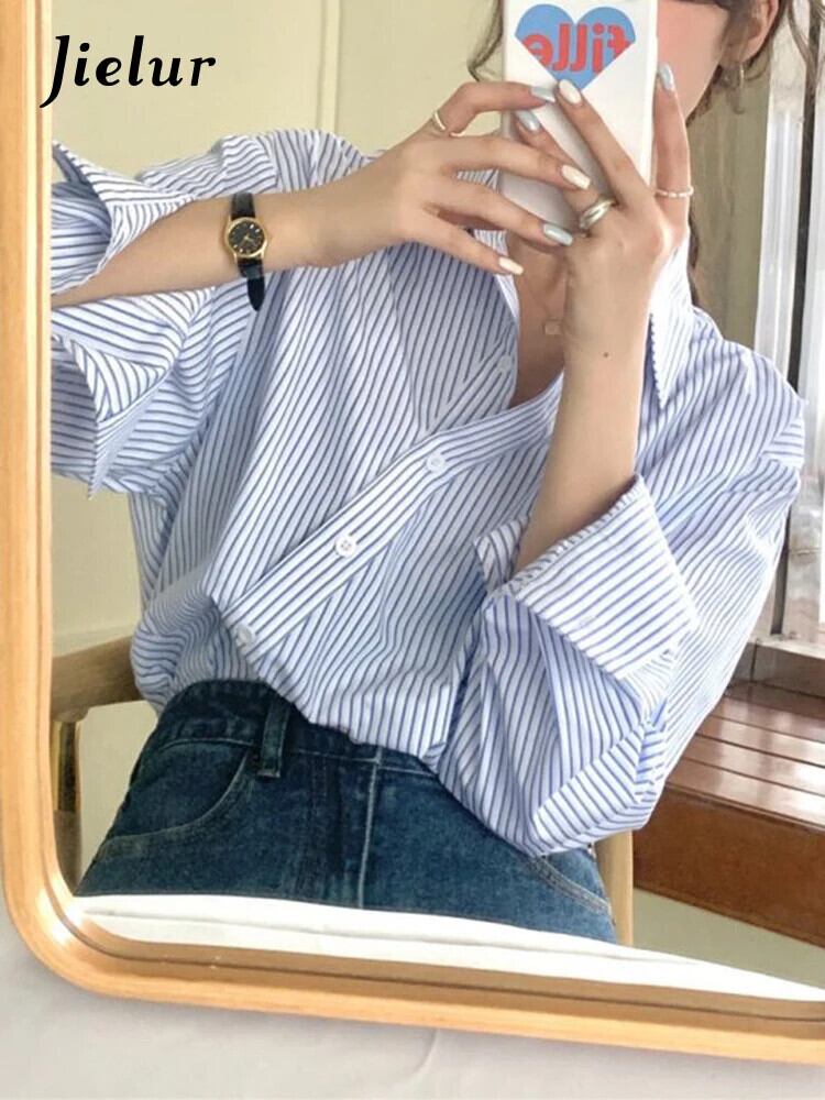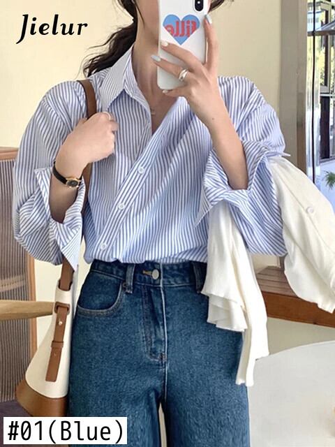 送料無料 Jielur スタイルフレンチブルーストライプシャツ女性ルーズ長袖黒ブラウス夏の女性のシャツ ロング ブラック サマー 夏物 AE12188787813302352903