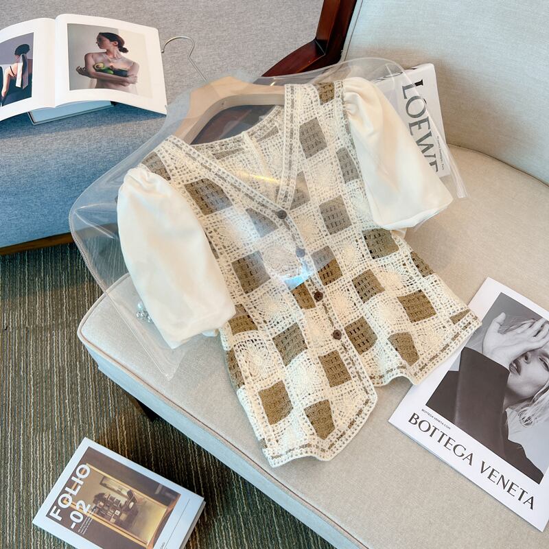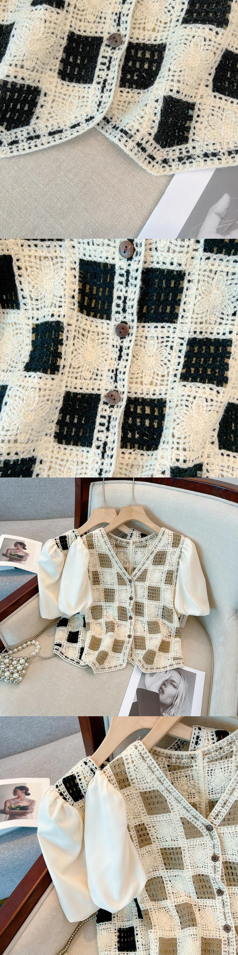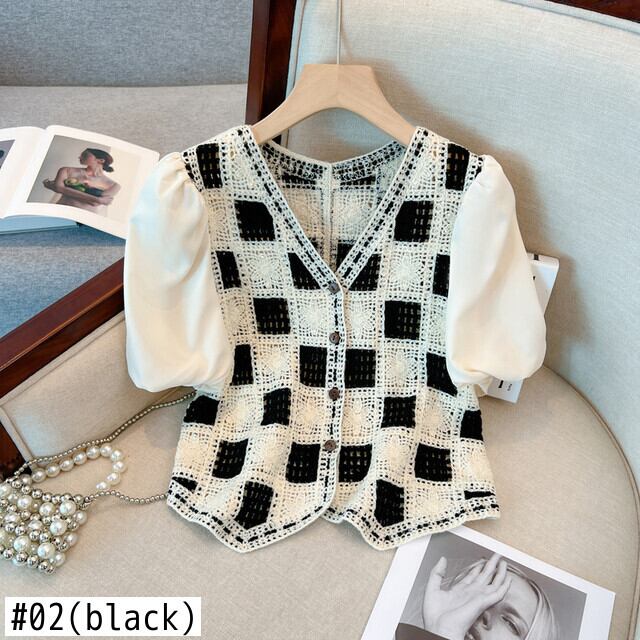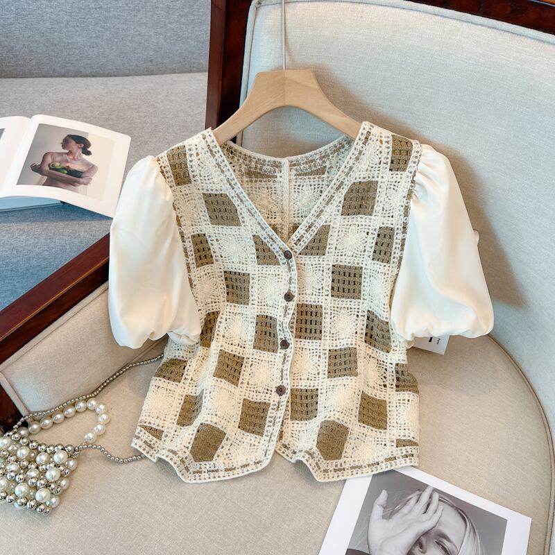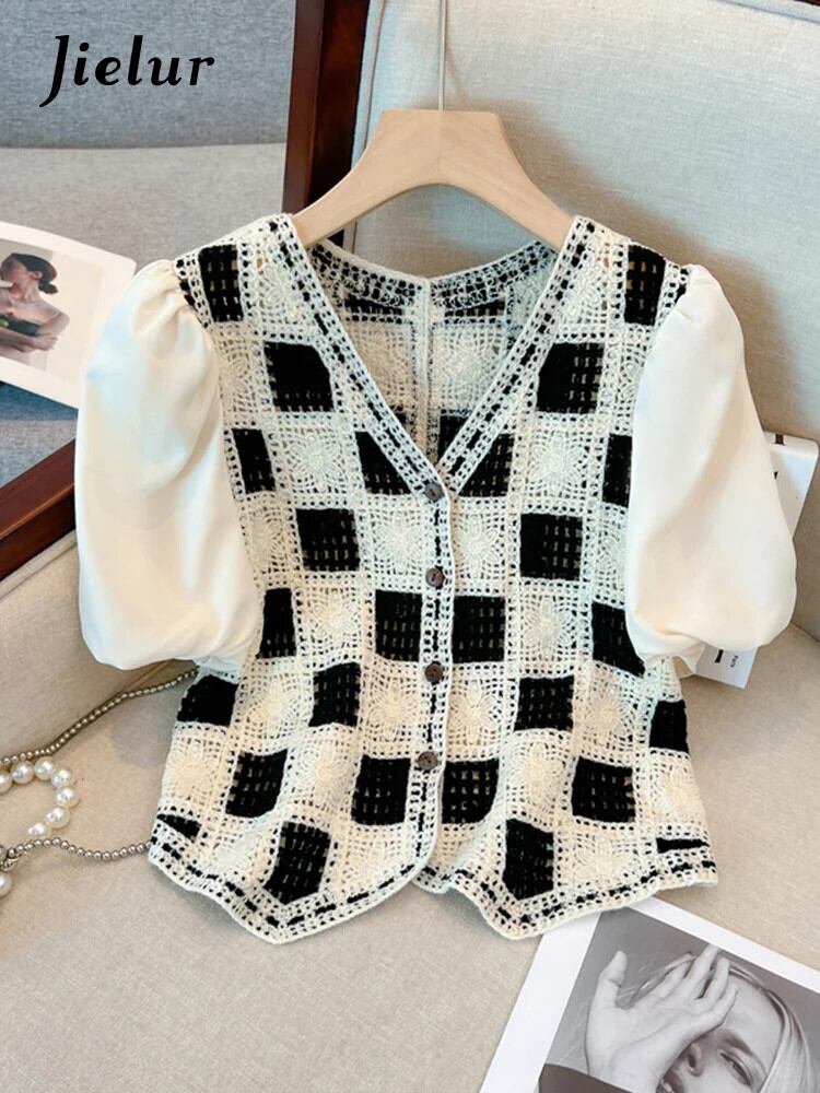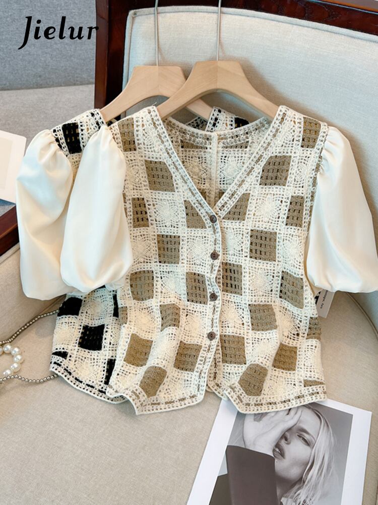 送料無料 Jielur 夏ヴィンテージ女性シャツ緩い甘いルーズシャツ女性チェック柄パフスリーブトップ 大人ガーリー スウィート キュート カジュアル サマー 夏物 ビンテージ AE12188787882708587643