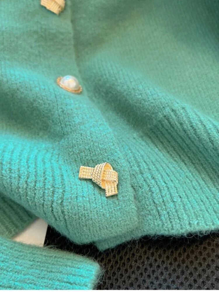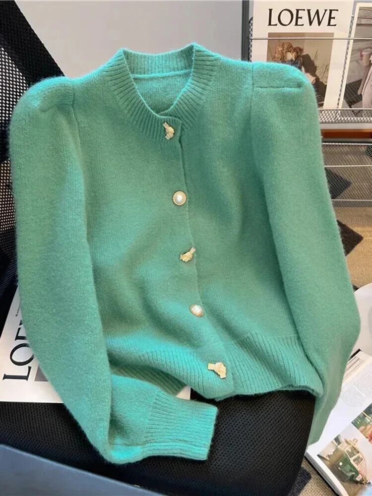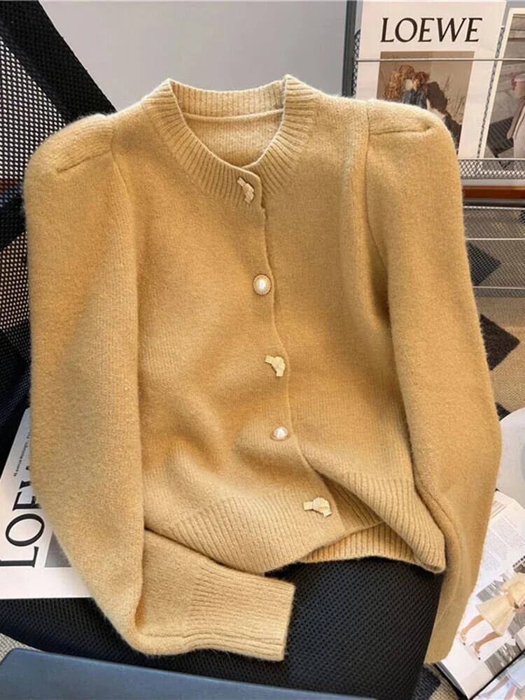 送料無料 ソリッドカラーバブルスリーブカーディガンコート金属ボタン付き香りラウンドネック長袖冬のセーター女性 ロング ウィンター 冬物 Oネック AE12188787848309836694