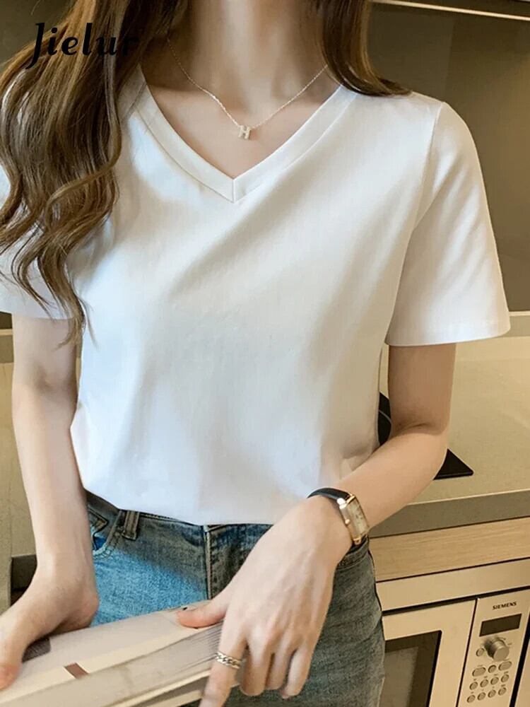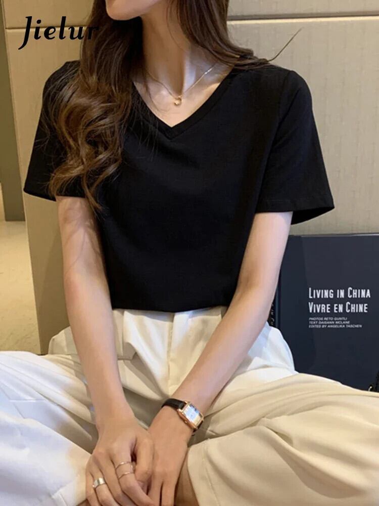 送料無料 Jielur 夏ソリッドカラースリム若い女性の Tシャツシンプルなベーシック Tシャツシックなブラックホワイトトップ女性 サマー 夏物 AE12188787835832783136