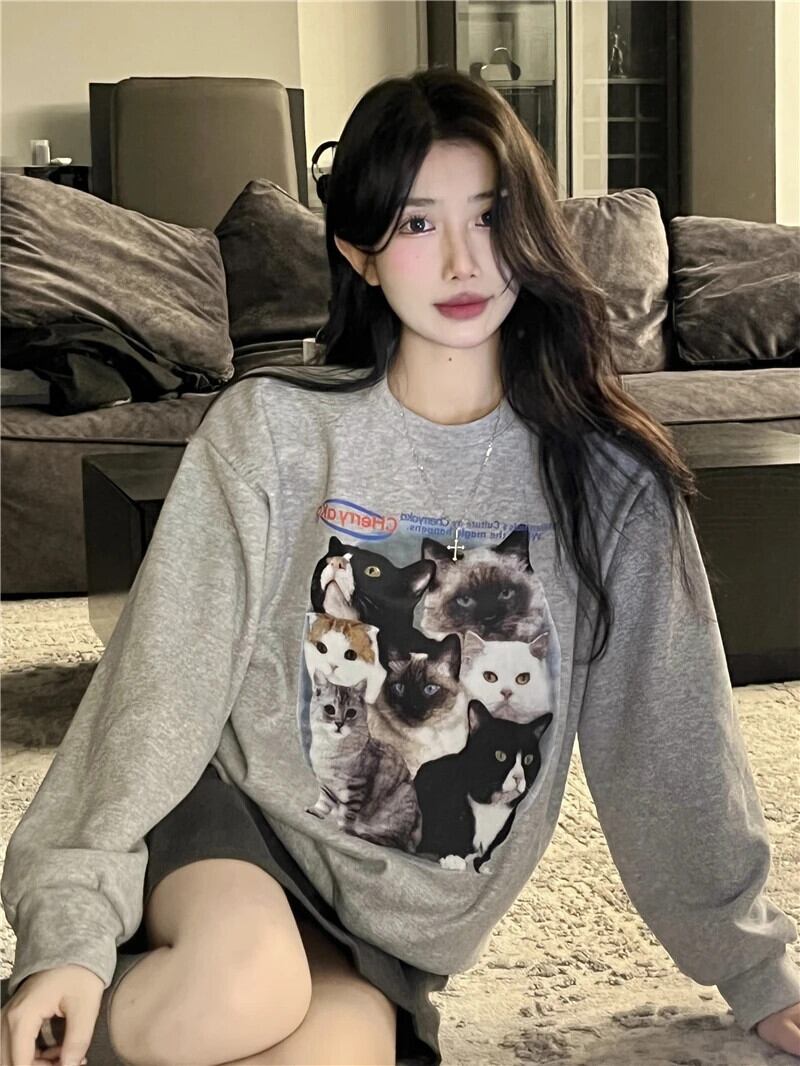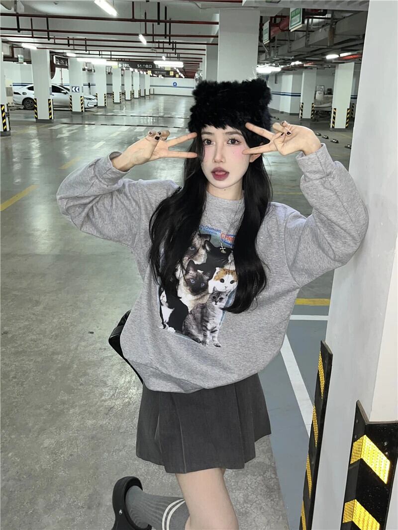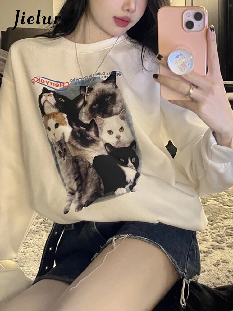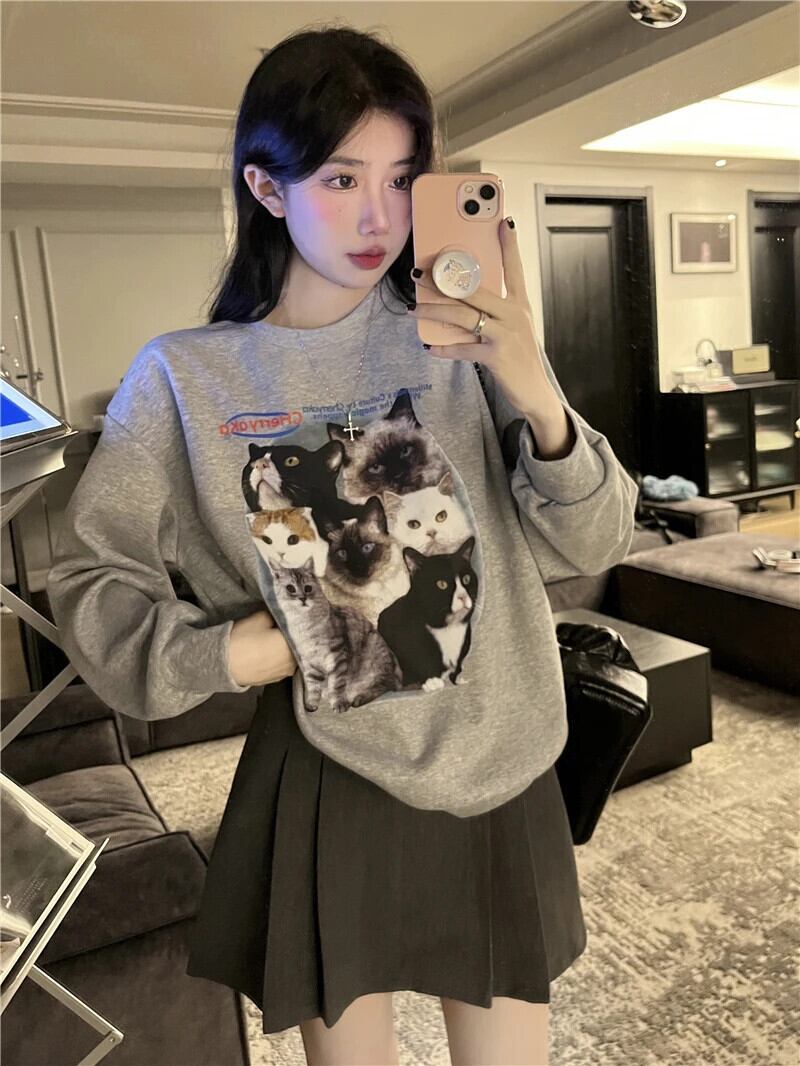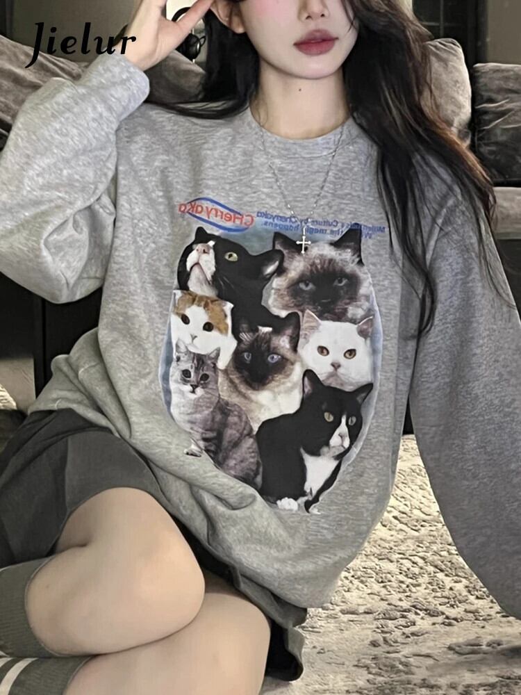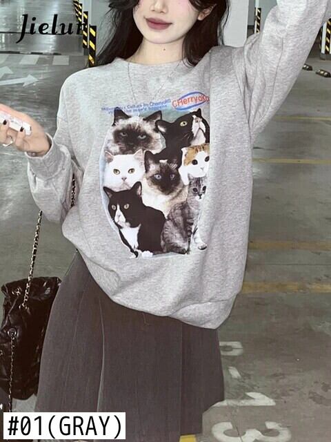 送料無料 Jielur かわいい猫長袖トレーナー秋冬シックなパーカー女性グレーホワイト O ネックルーズトップ ロング 大人ガーリー スウィート キュート カジュアル オータム 秋物 ウィンター 冬物 Oネック AE12188787861032823897