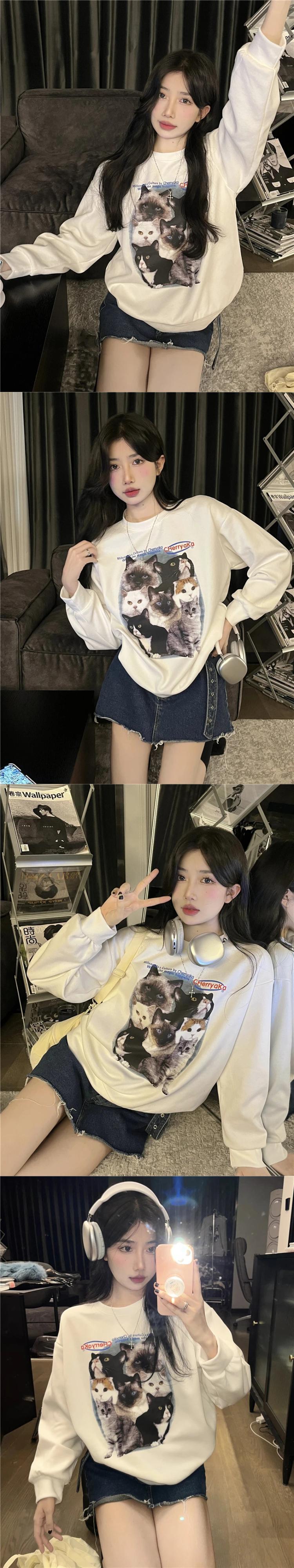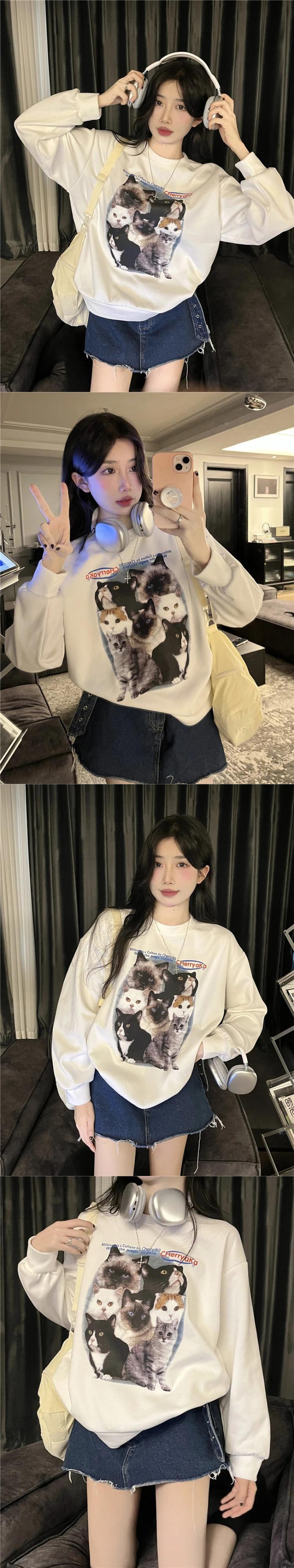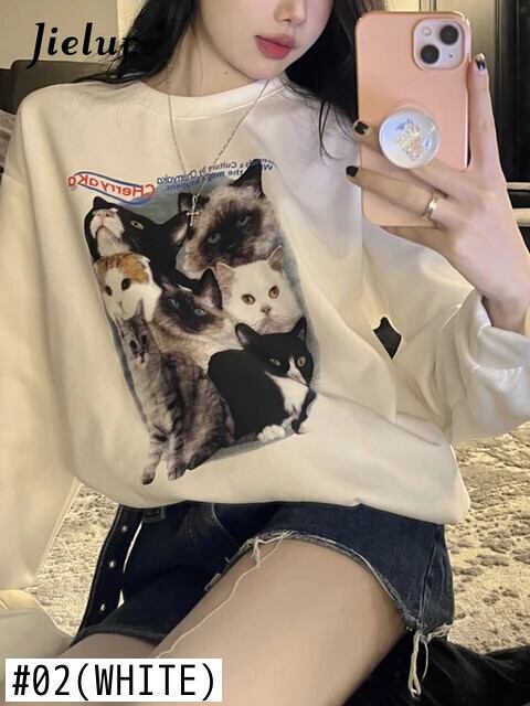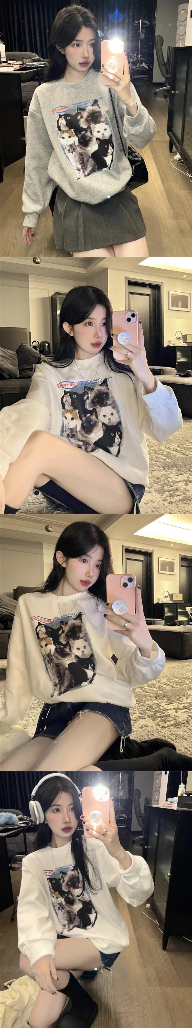 送料無料 Jielur かわいい猫長袖トレーナー秋冬シックなパーカー女性グレーホワイト O ネックルーズトップ ロング 大人ガーリー スウィート キュート カジュアル オータム 秋物 ウィンター 冬物 Oネック AE12188787861032823897