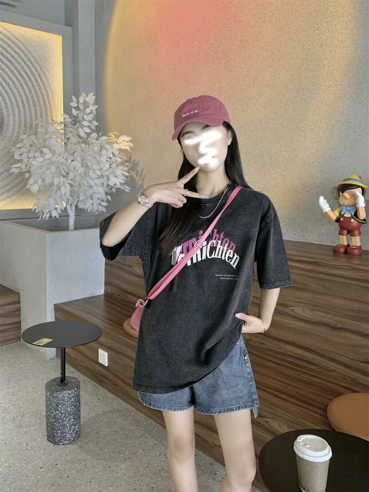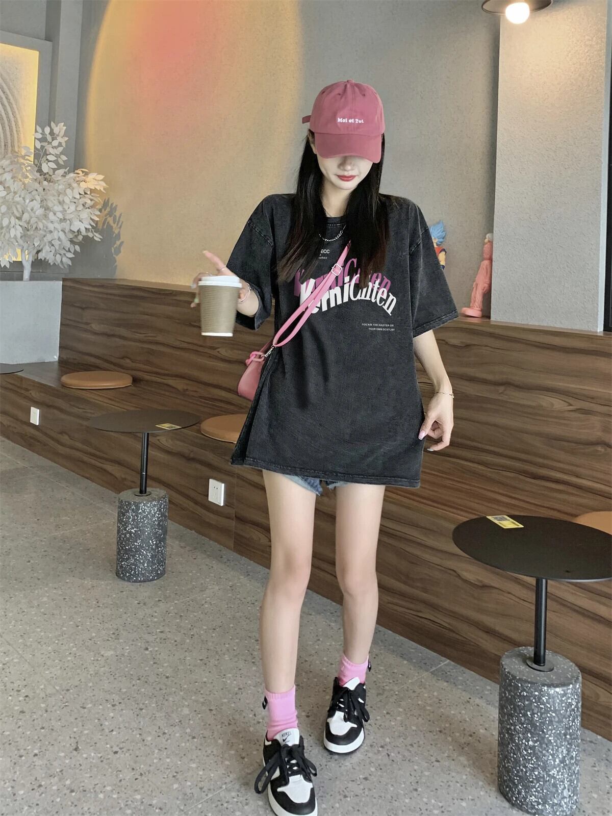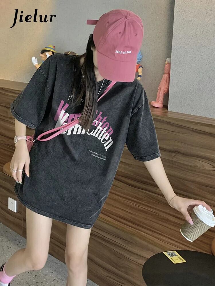 送料無料 Jielur 夏スリムスイートストリート女性の Tシャツルーズ Tシャツ女性黒シンプルなベーシック Chicly トップ ブラック 大人ガーリー スウィート キュート カジュアル サマー 夏物 AE12188787865203634899