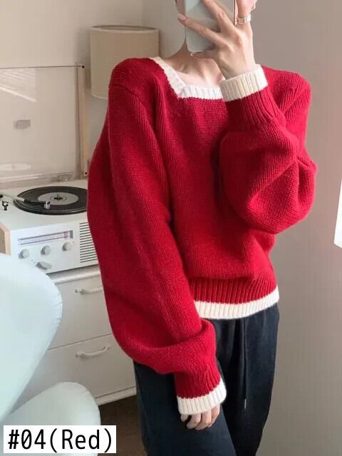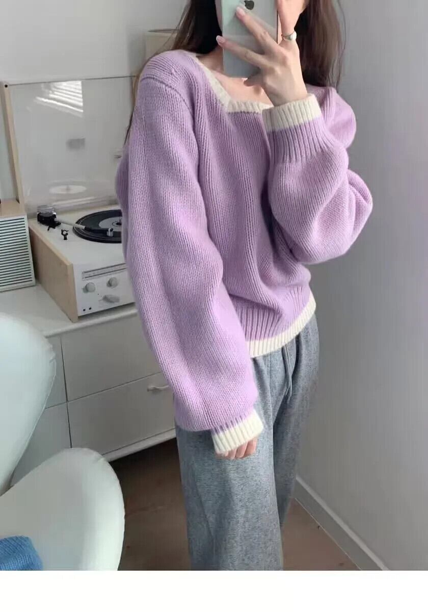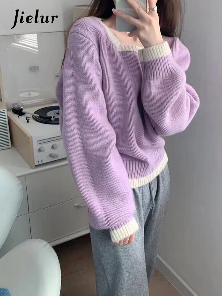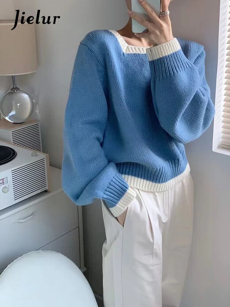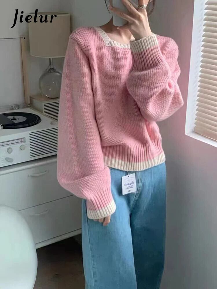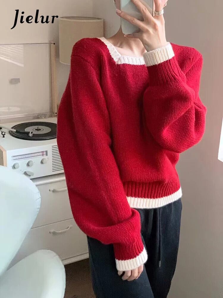 送料無料 Jielur 秋ヴィンテージコントラストカラープルオーバー女性ルーズリラックスニットプルオーバー白ピンク赤青プルオーバー ホワイト レッド ブルー オータム 秋物 ビンテージ AE12188787837180514414