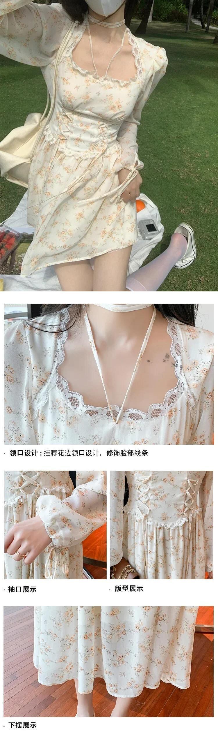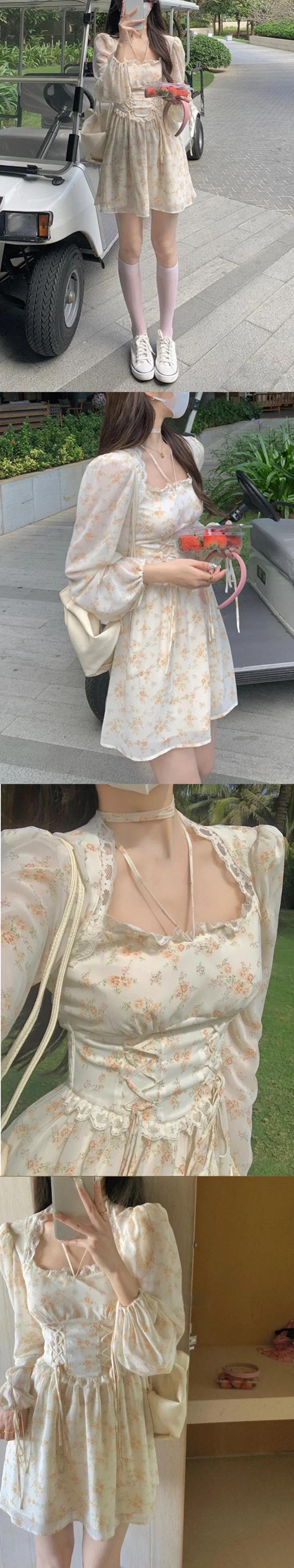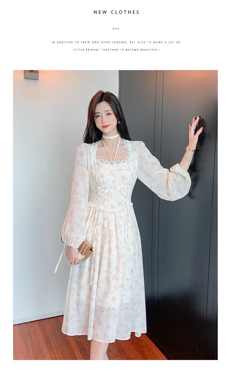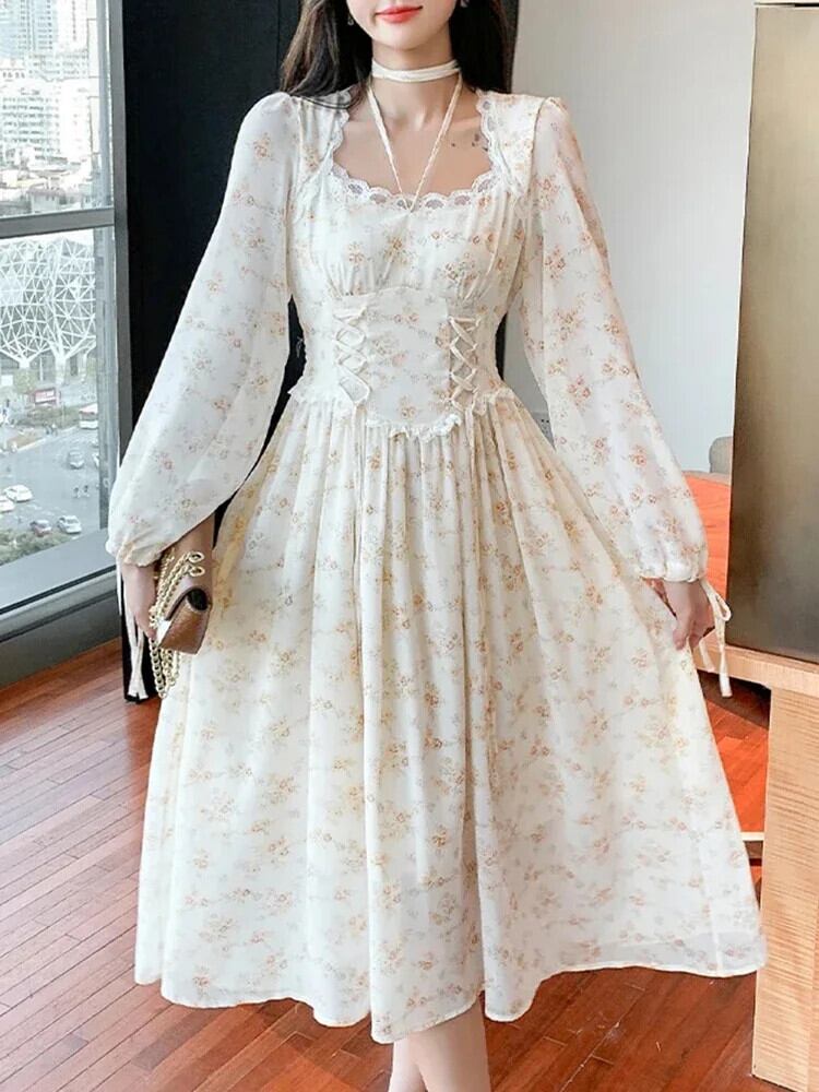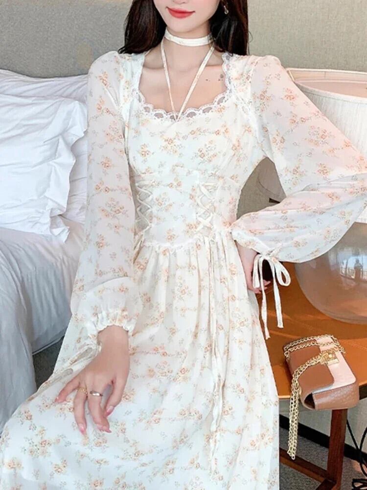送料無料 女性の Y2K ミディドレス甘いレトロフラワーパーティーフルスリーブ春レースドレス女性 大人ガーリー スウィート キュート カジュアル スプリング 春物 フラワーデザイン AE12188787893779356109