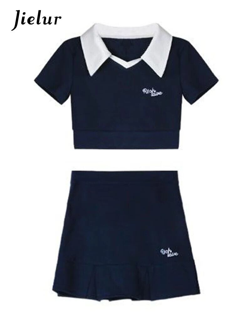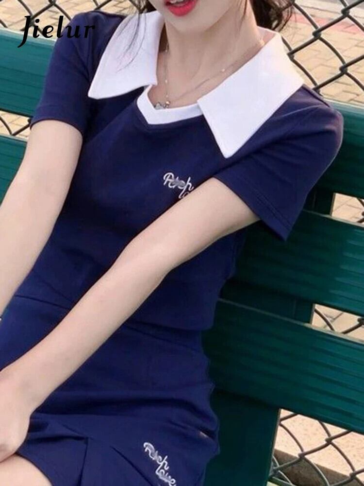 送料無料 Jielur ツーピース夏コントラストカラースリムレディース Tシャツ甘い Tシャツダークブルーウエストシンプルなスカート 大人ガーリー スウィート キュート カジュアル サマー 夏物 AE12188787874480844348