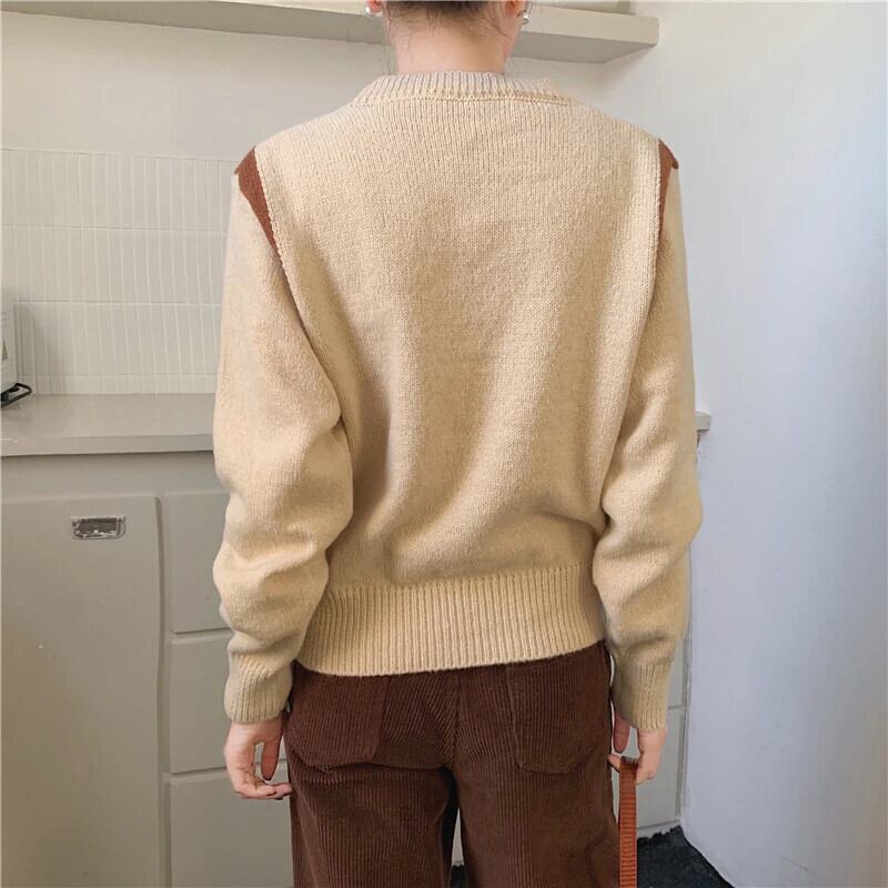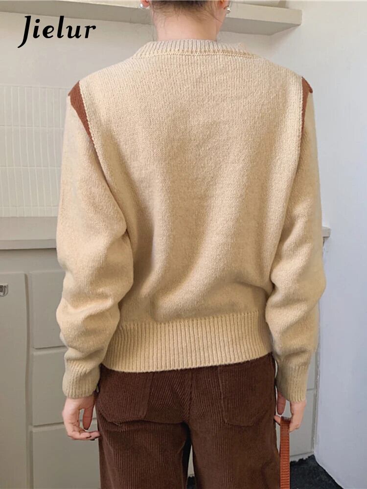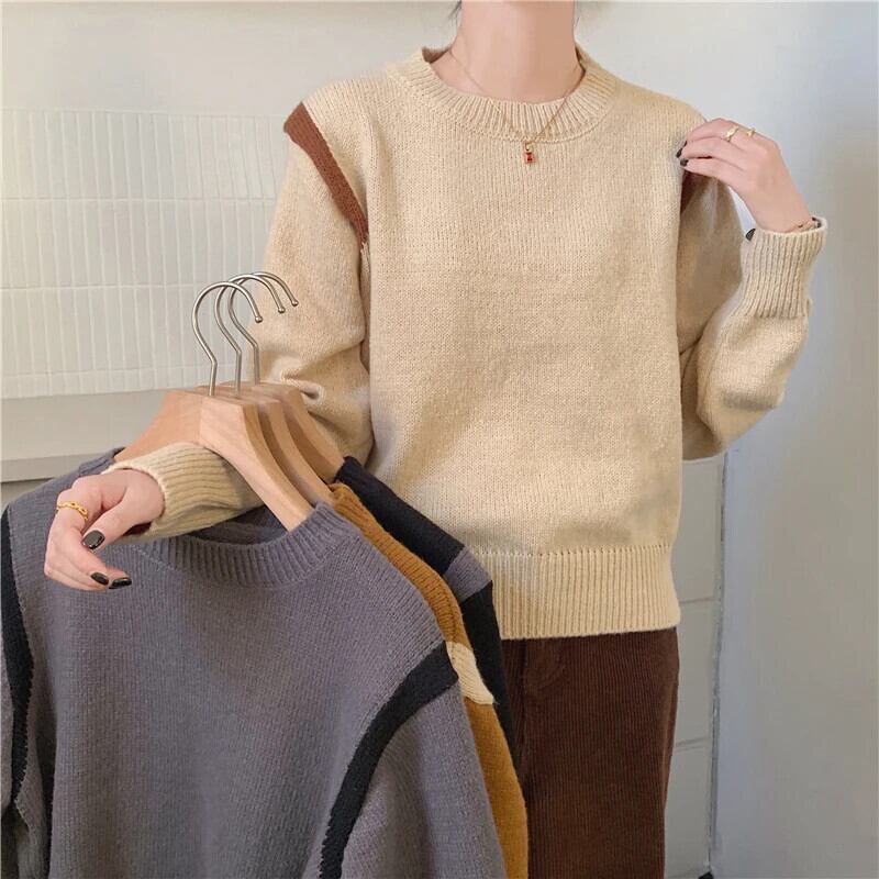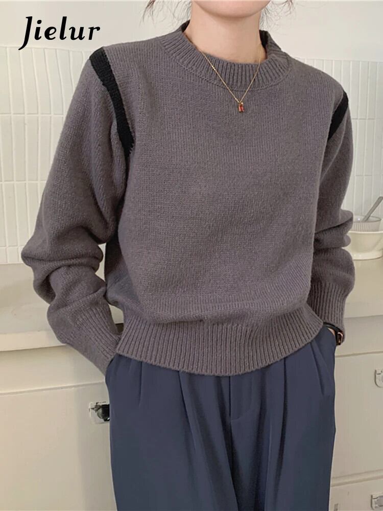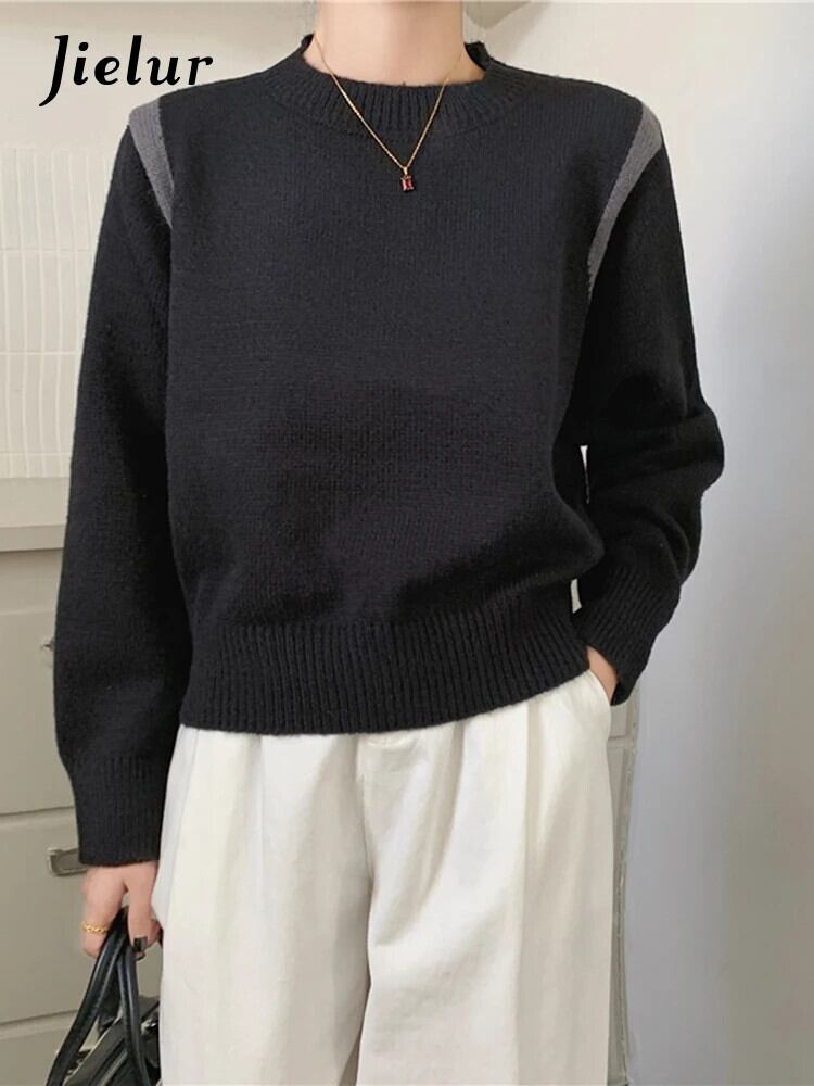 送料無料 Jielur 冬黒ニットセーター女性スタイルヒットカラー O ネック長袖ルーズセータープルオーバー ロング ブラック ウィンター 冬物 Oネック AE12188787889049507048