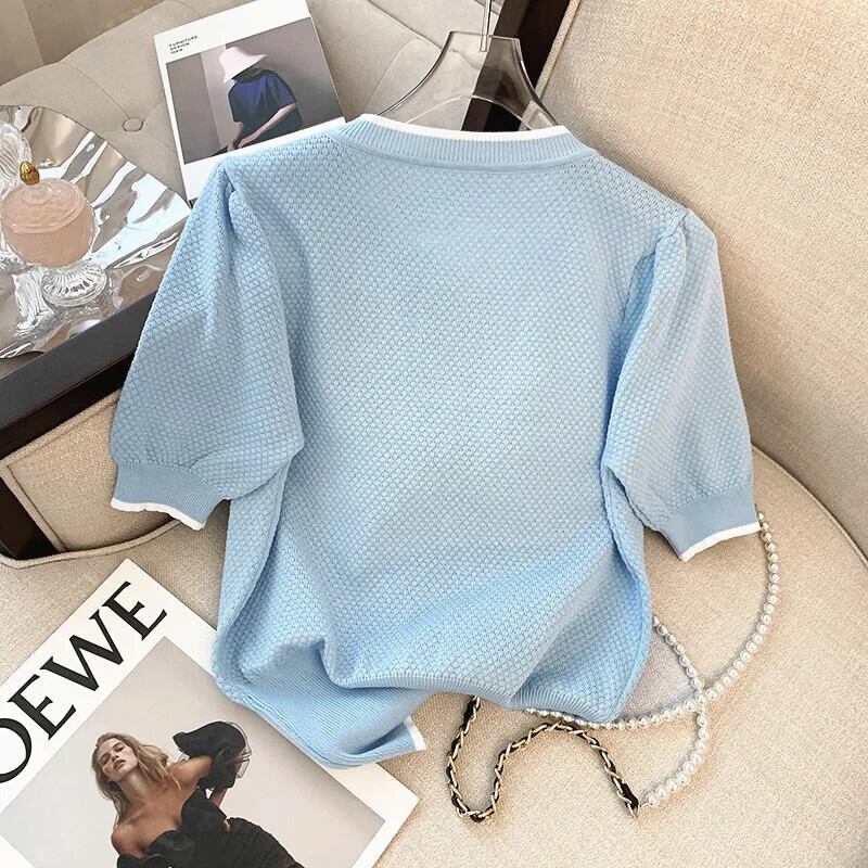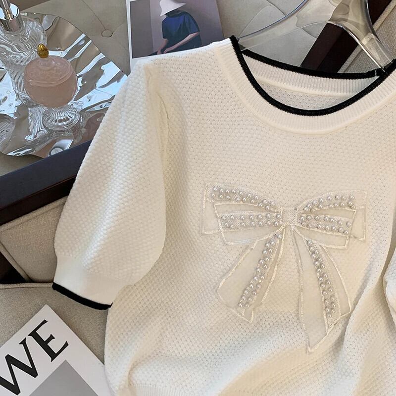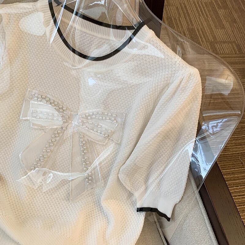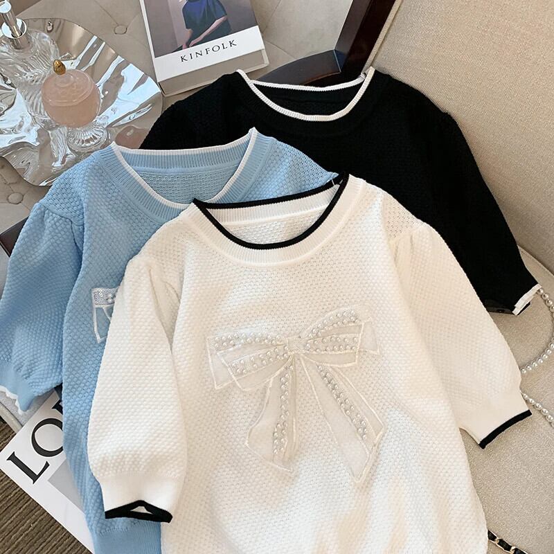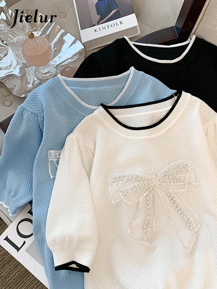 送料無料 Jielur スリムウエスト薄型女性 Tシャツちょう結びスペルカラー O ネックニット Tシャツベーシックルーズ半袖 ショート リボン ハーフスリーブ Oネック AE1218878787923836423