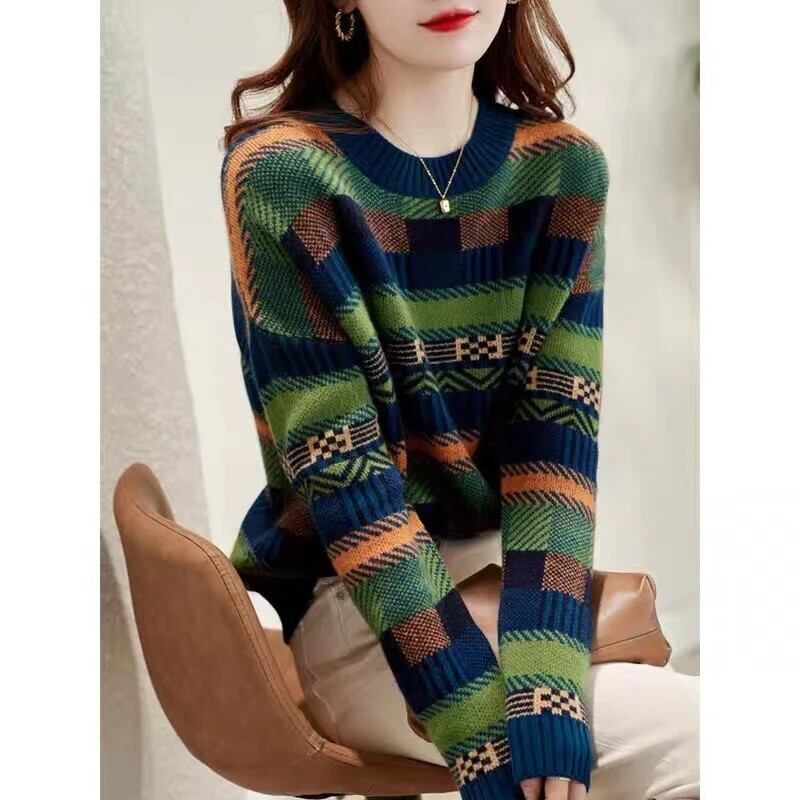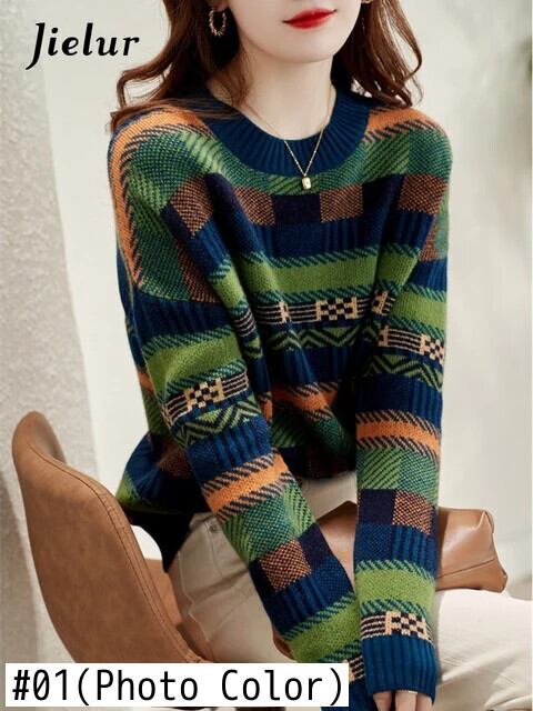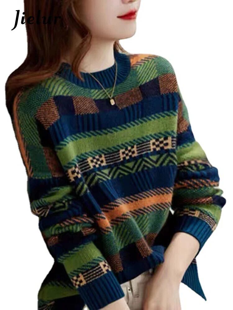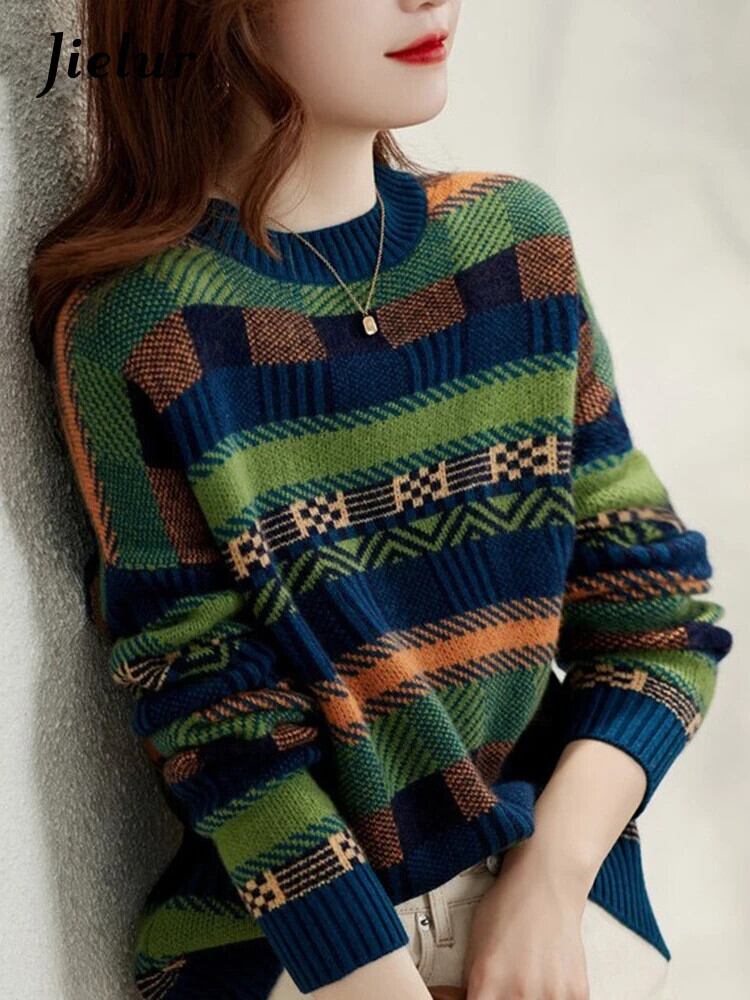 送料無料 Jielur グリーンセーター冬の個性コントラストカラーストライプ O ネック長袖ルーズプルオーバーニットトップ女性 ロング ウィンター 冬物 Oネック AE12188787851032628321