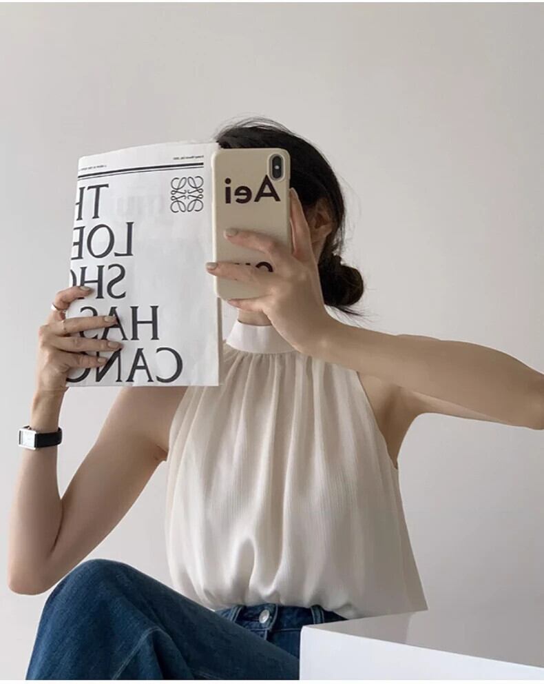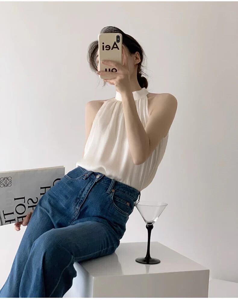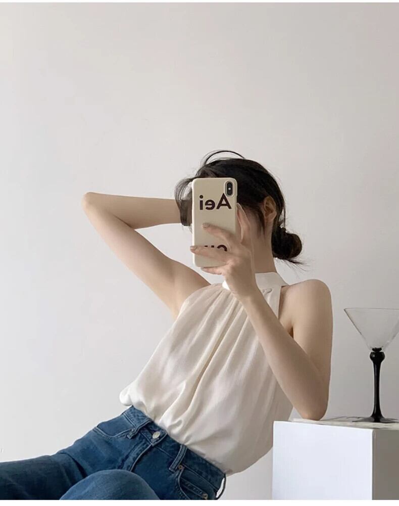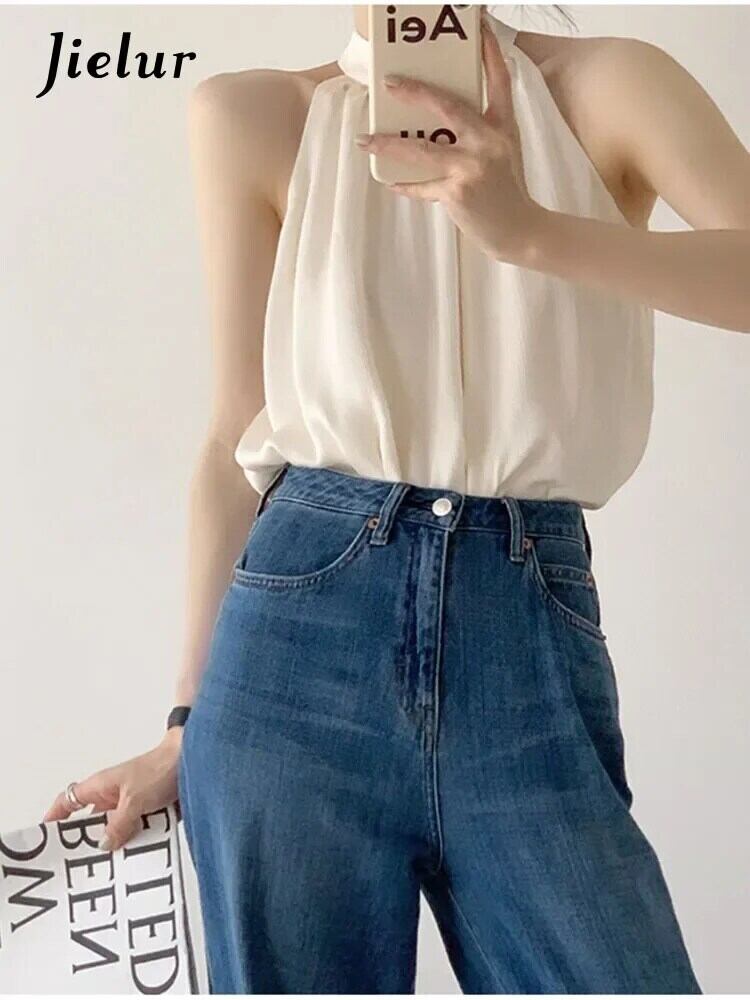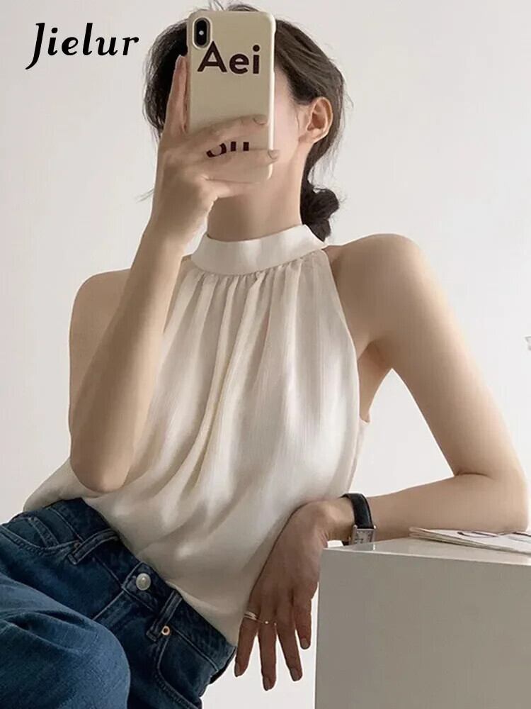 送料無料 Jielur 夏無地スリム女性ブラウス甘いフレンチホルターブラウス女性ベージュシンプルなベーシックノースリーブトップ 大人ガーリー スウィート キュート カジュアル サマー 夏物 ソリッドカラー AE12188787875246191071