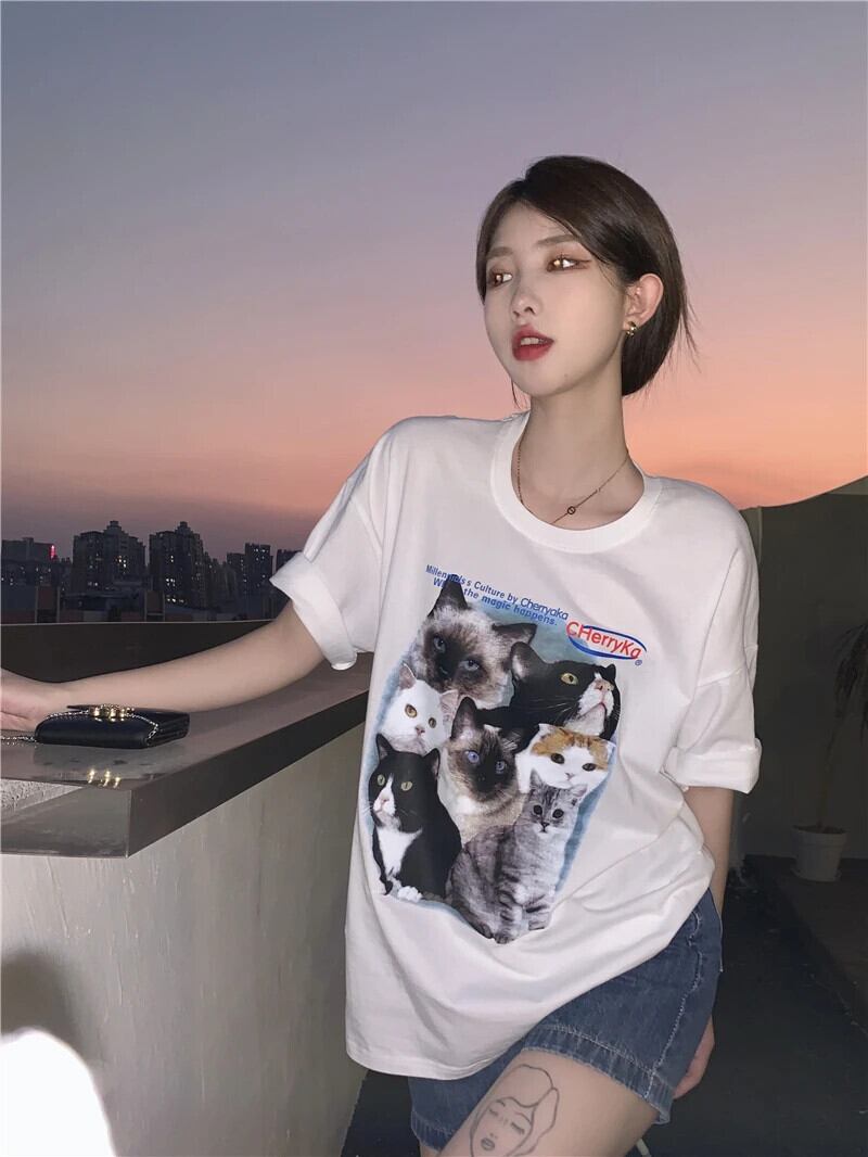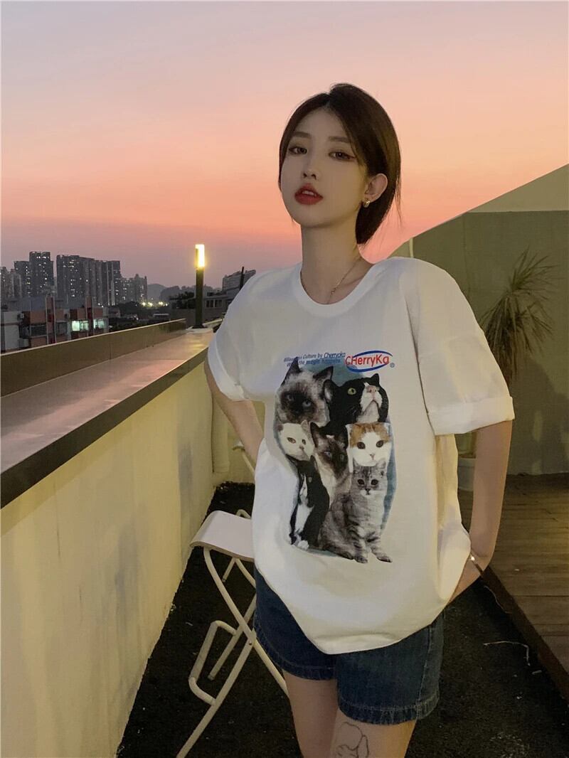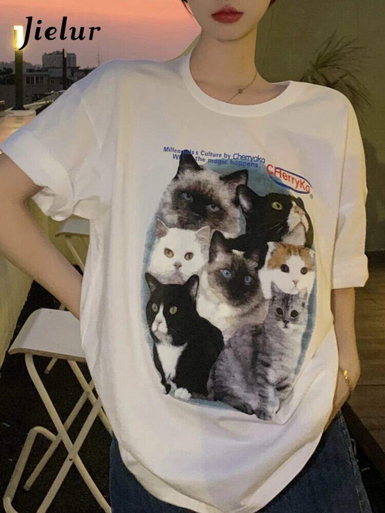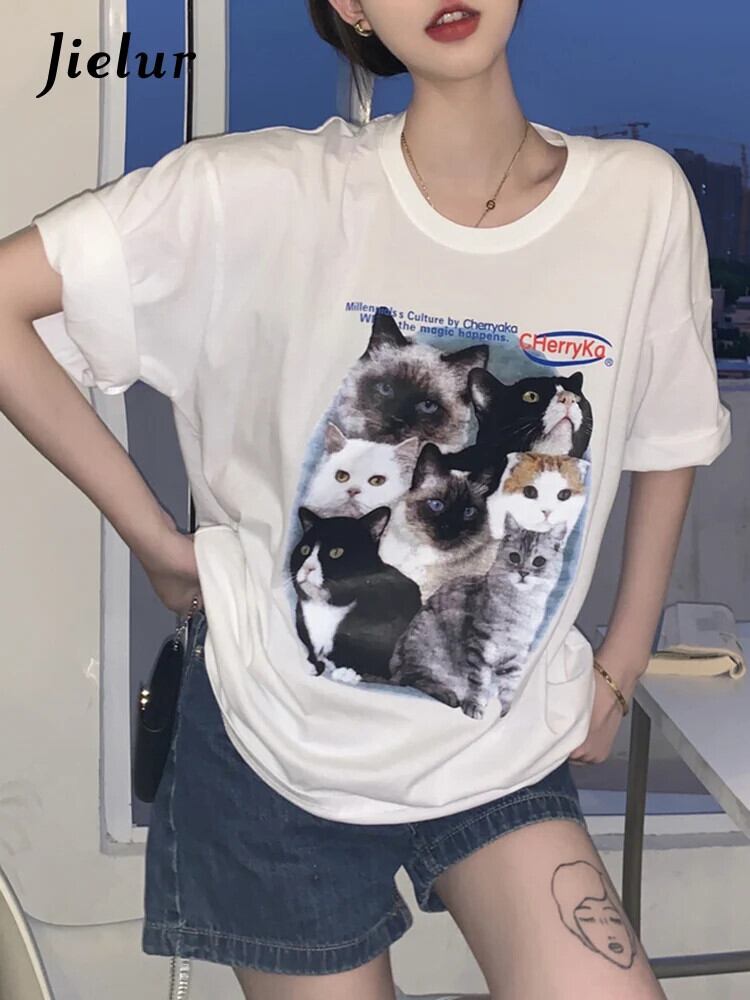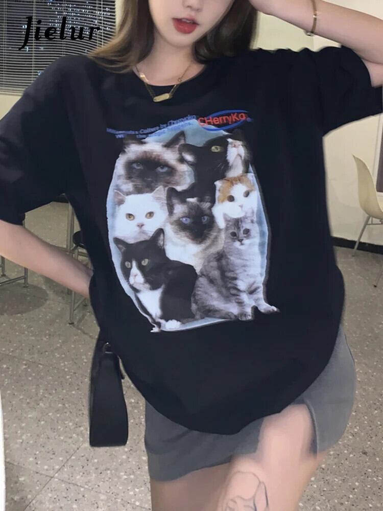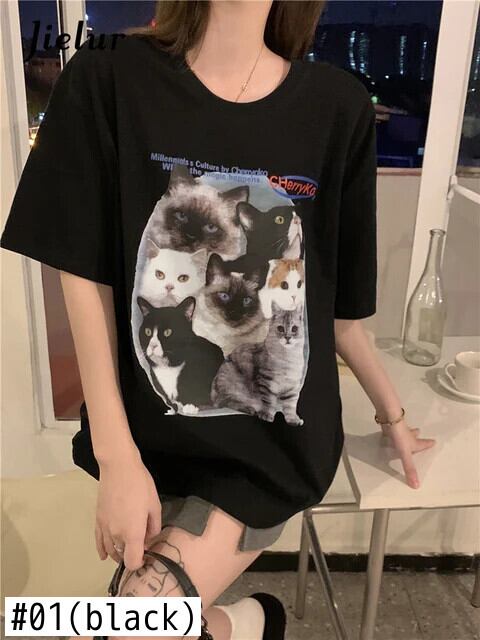 送料無料 Jielur かわいい Tシャツ夏半袖猫プリントトップ Tシャツルーズレジャー BF 黒女性の Tシャツ ショート ブラック ハーフスリーブ 大人ガーリー スウィート キュート カジュアル サマー 夏物 AE12188787838516420661