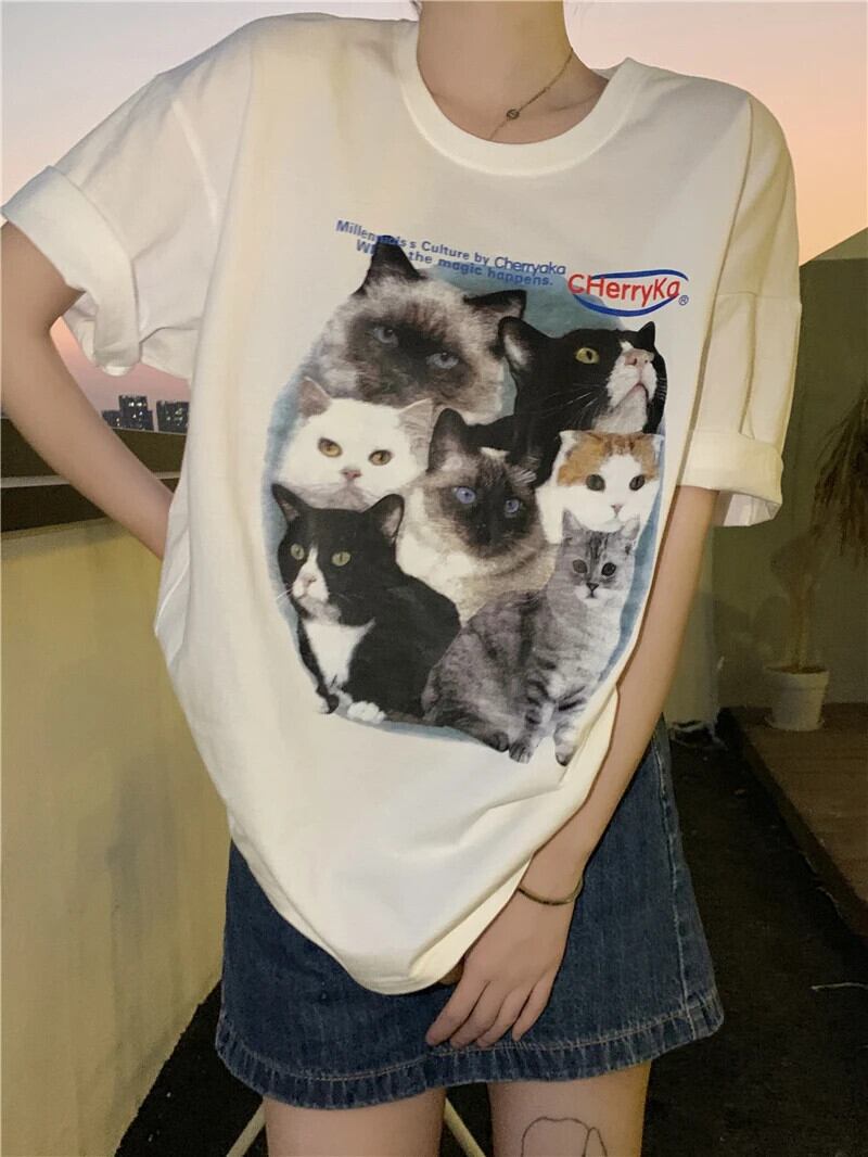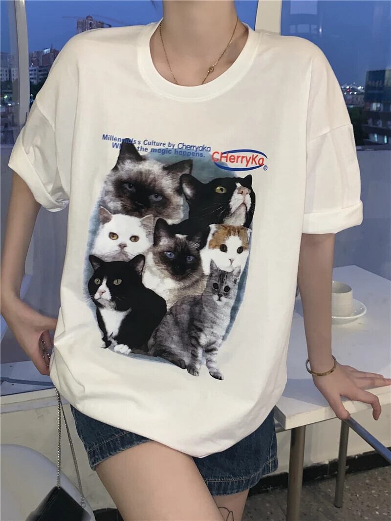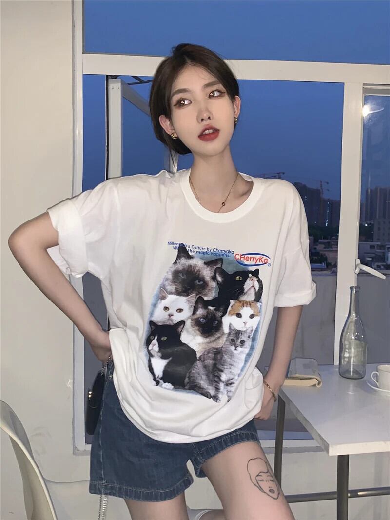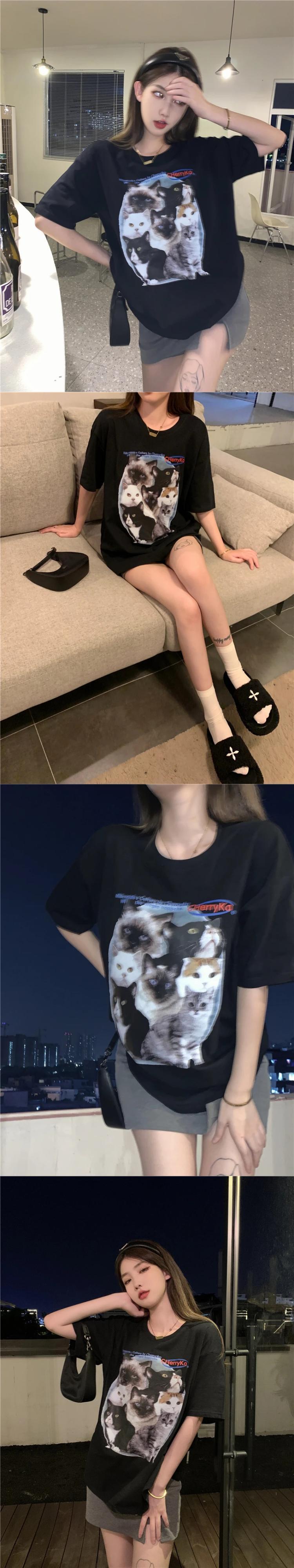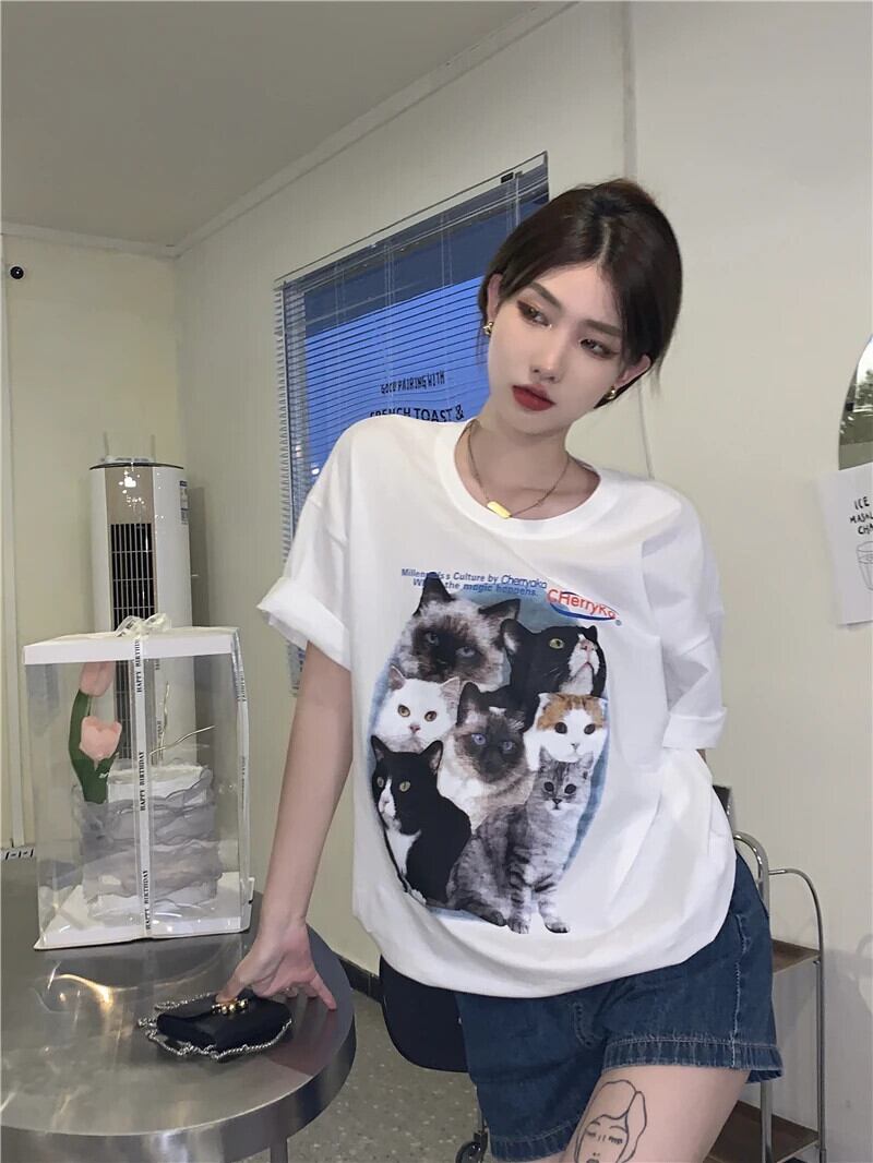 送料無料 Jielur かわいい Tシャツ夏半袖猫プリントトップ Tシャツルーズレジャー BF 黒女性の Tシャツ ショート ブラック ハーフスリーブ 大人ガーリー スウィート キュート カジュアル サマー 夏物 AE12188787838516420661