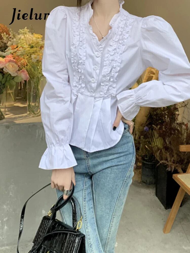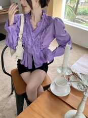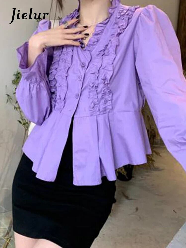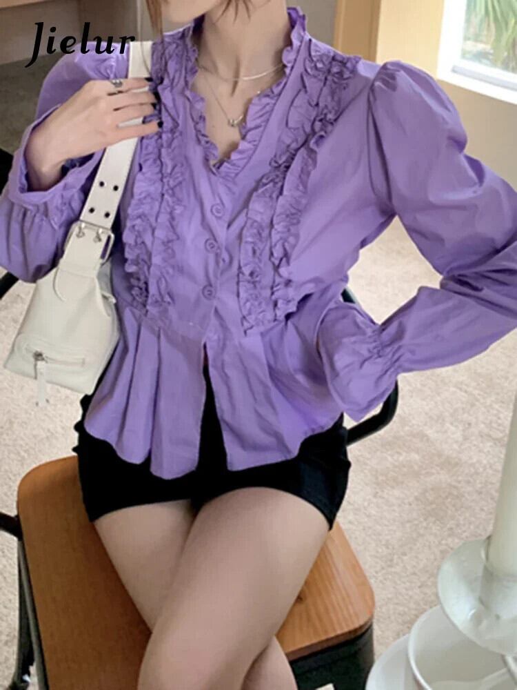 送料無料 Jiellur 夏無地スリム女性シャツ甘いシャツ女性白紫シンプルな長袖トップ ロング ホワイト 大人ガーリー スウィート キュート カジュアル サマー 夏物 ソリッドカラー パープル AE12188787812849197215
