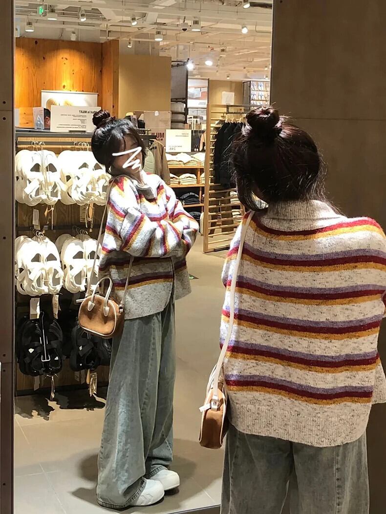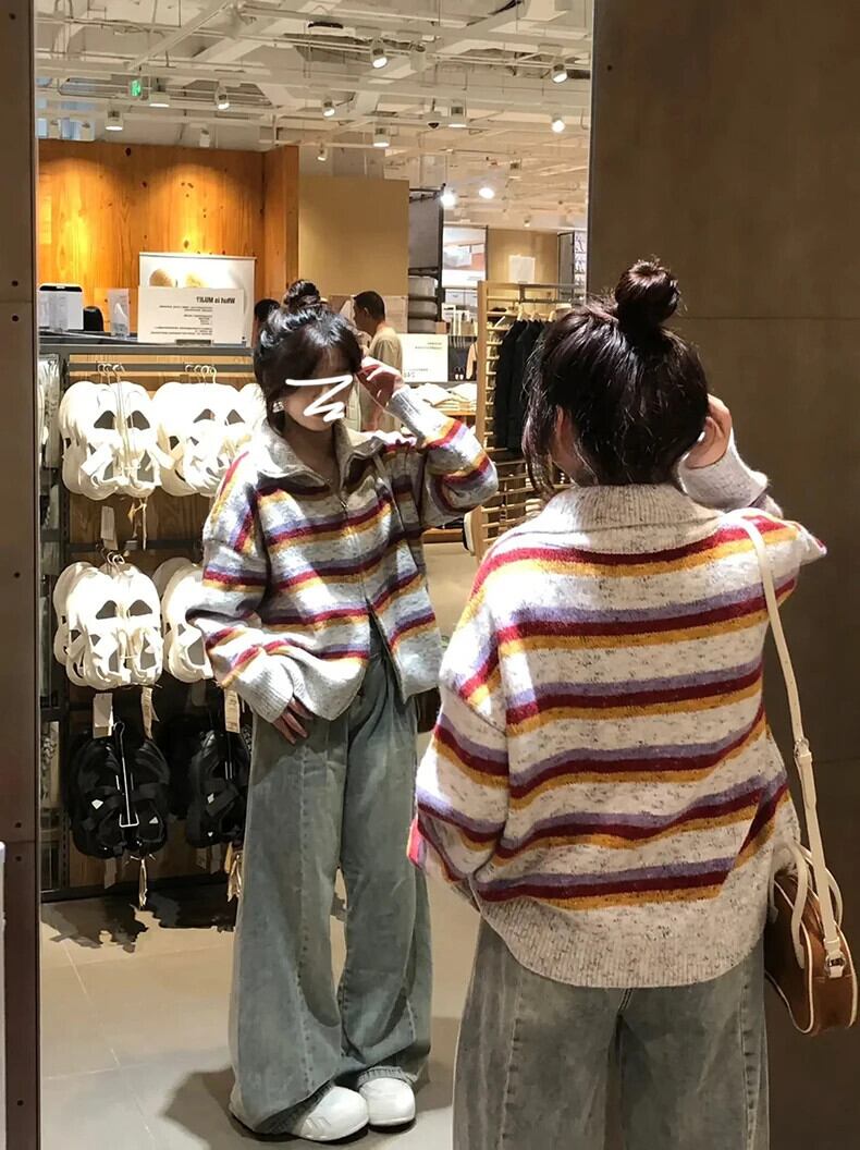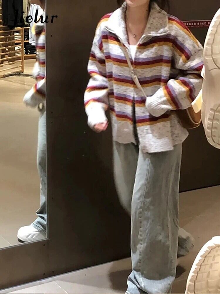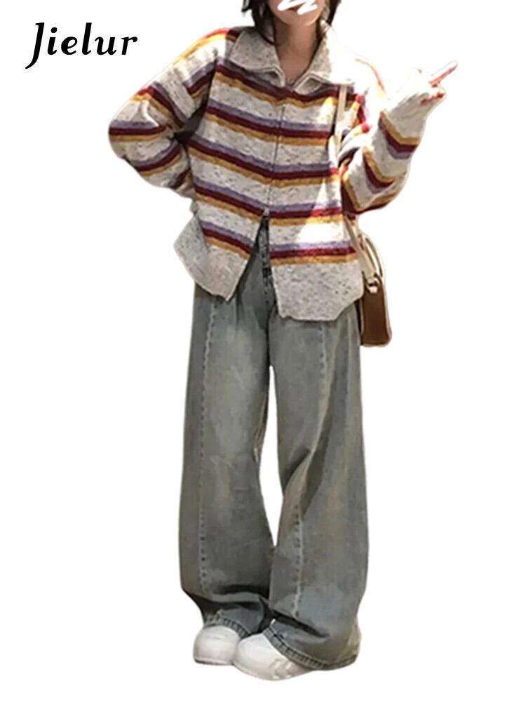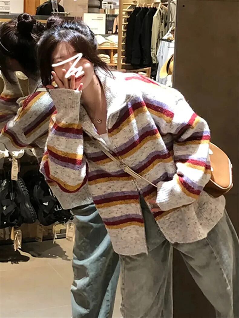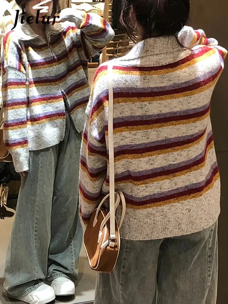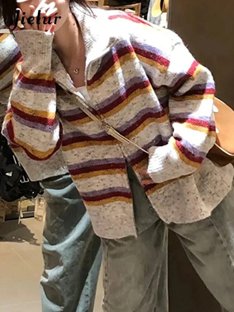 送料無料 Jielur アメリカンレトロストライプ女性カーディガン秋スリムシックカーディガン女性ルーズニットセーター オータム 秋物 AE12188787873899550868