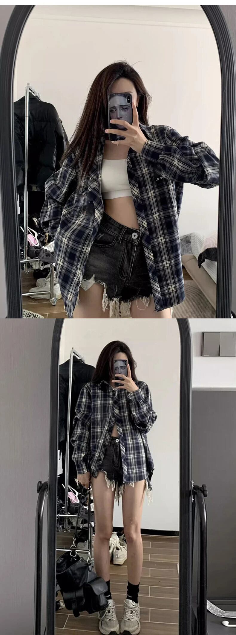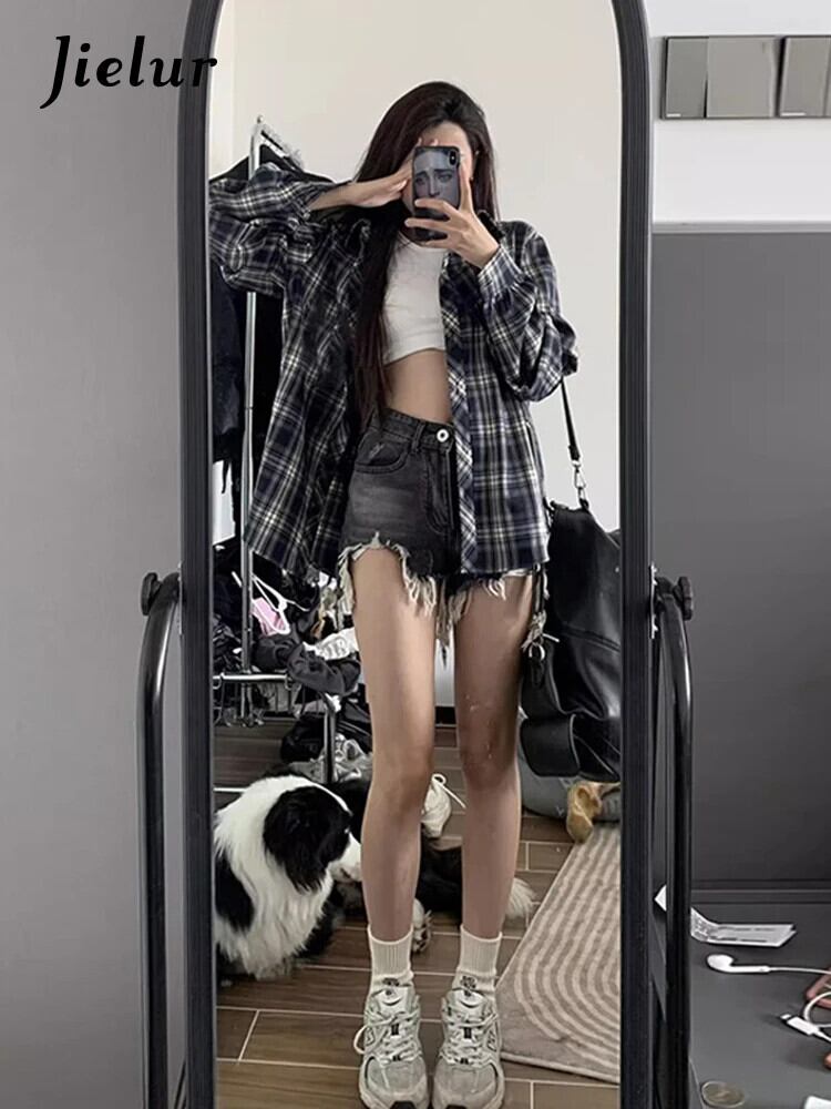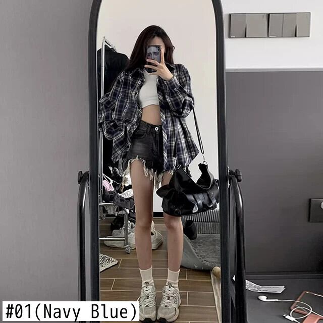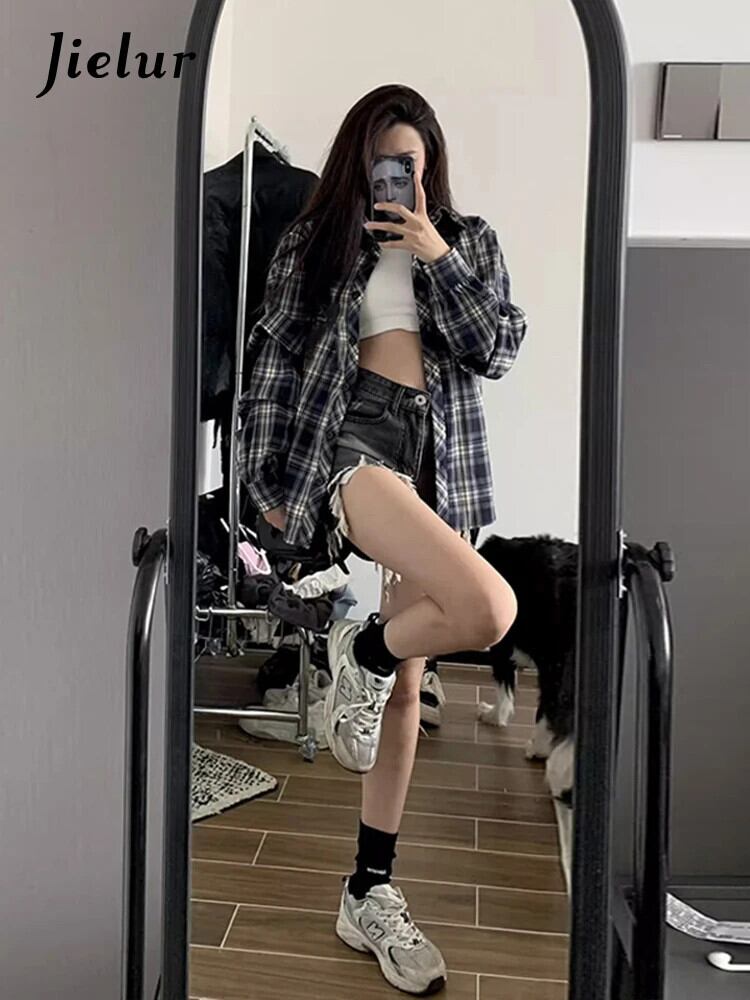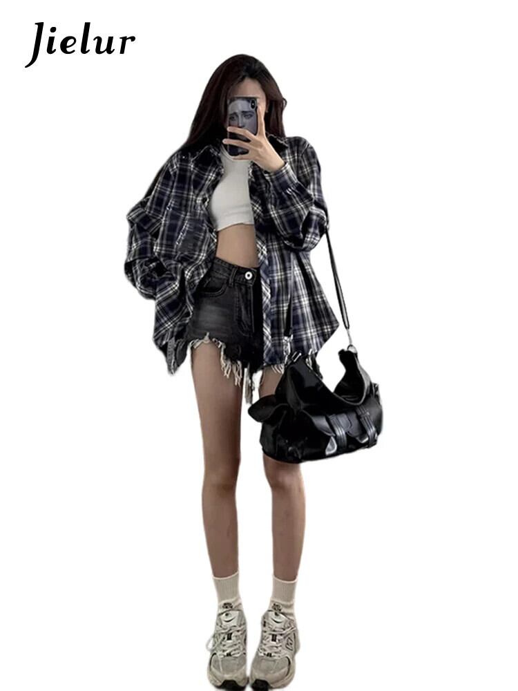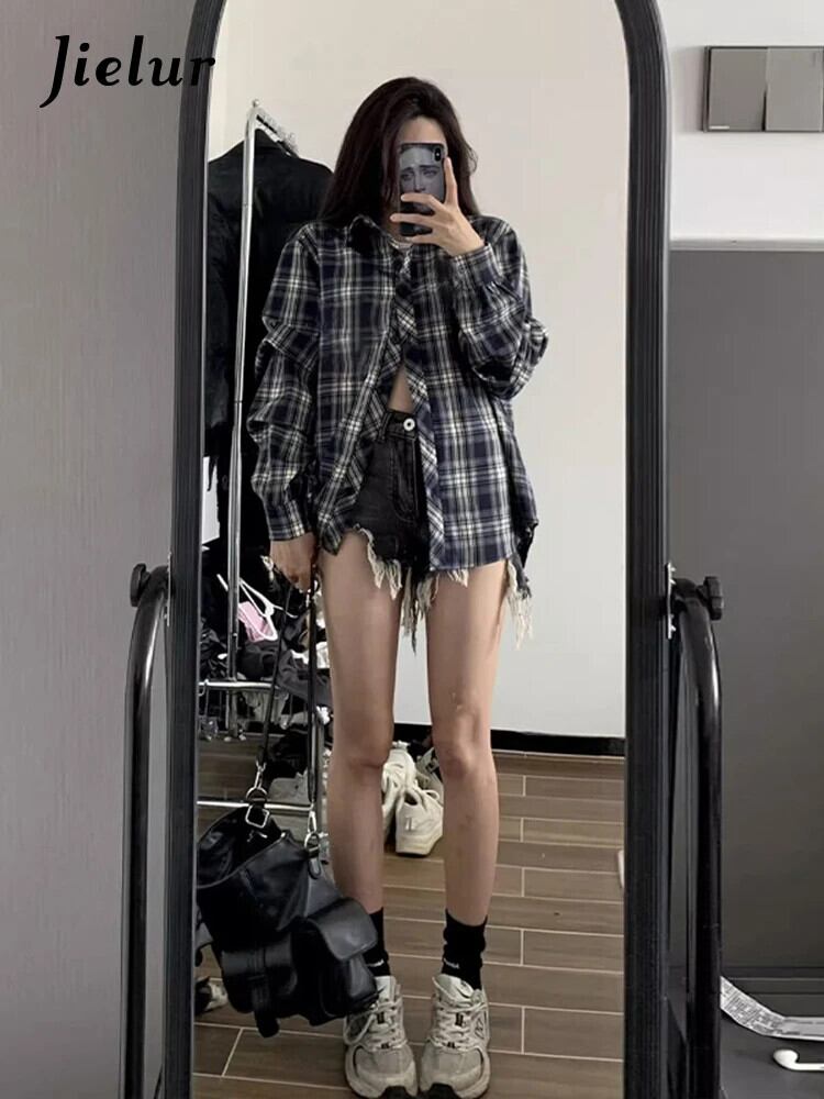 送料無料 Jielur 春レトロスリムルーズ女性シャツストリートルーズチェック柄女性シャツネイビーシック長袖トップ女性 ロング スプリング 春物 AE12188787864610801779