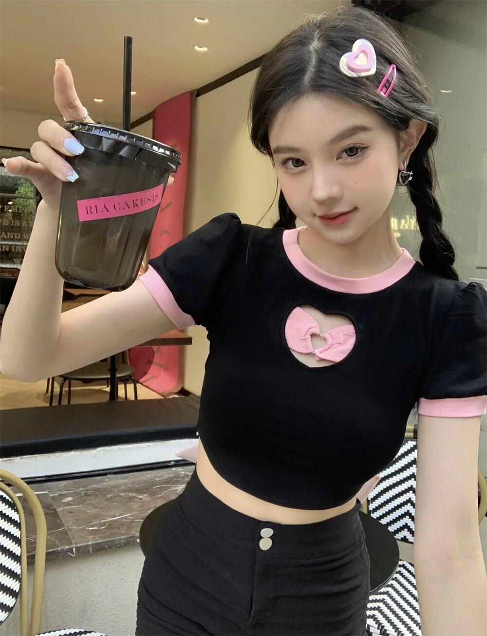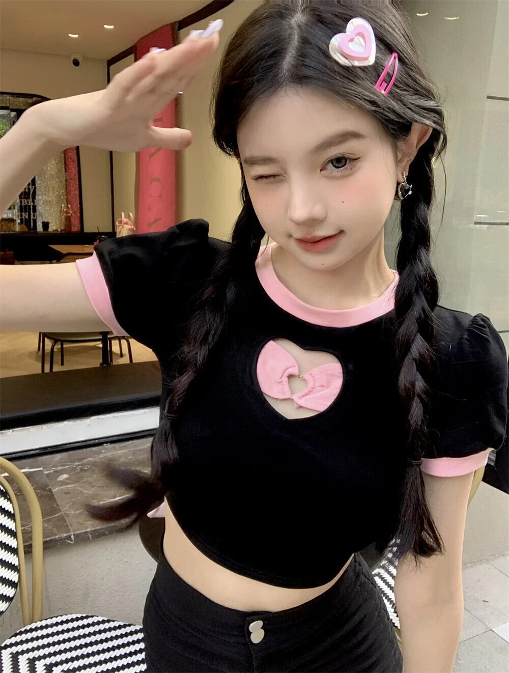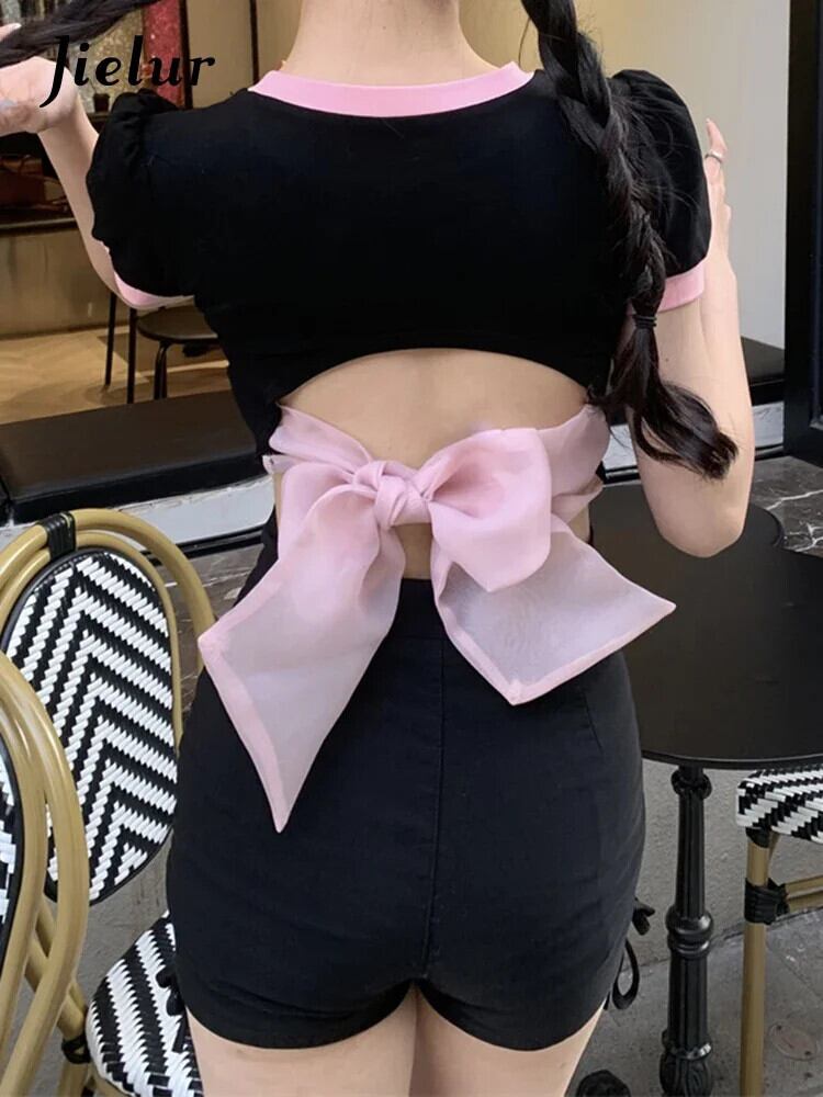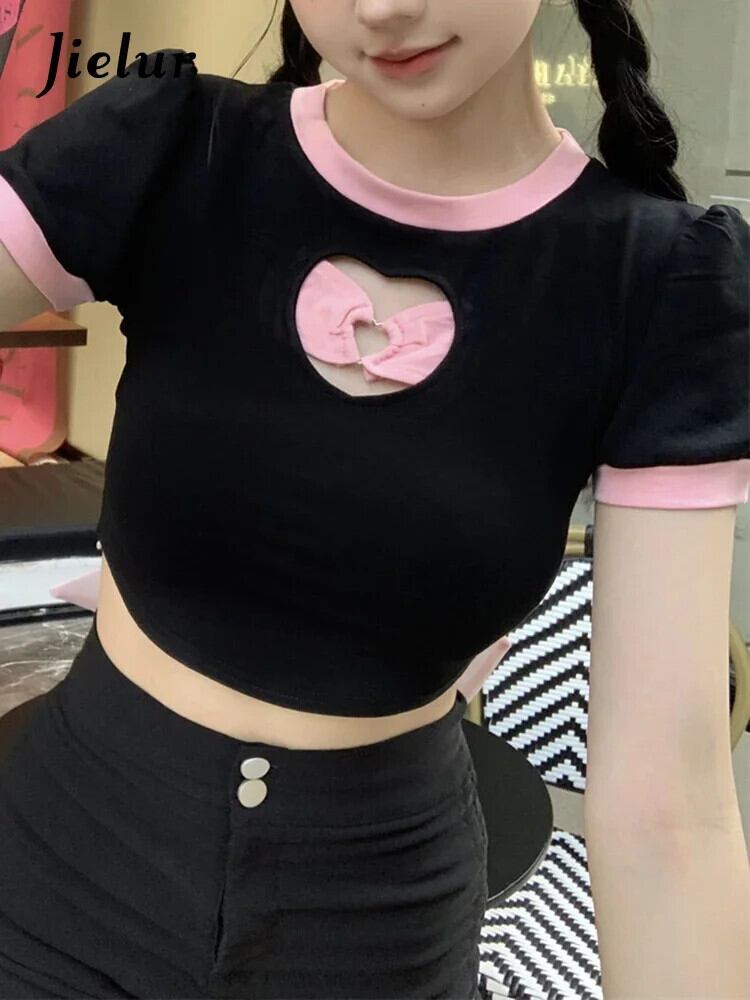 送料無料 Jielur 夏中空アウトコントラストカラーの女性の Tシャツ甘いスリム Tシャツ女性黒シックなストリートトップ ブラック 大人ガーリー スウィート キュート カジュアル サマー 夏物 AE1218878785748276404